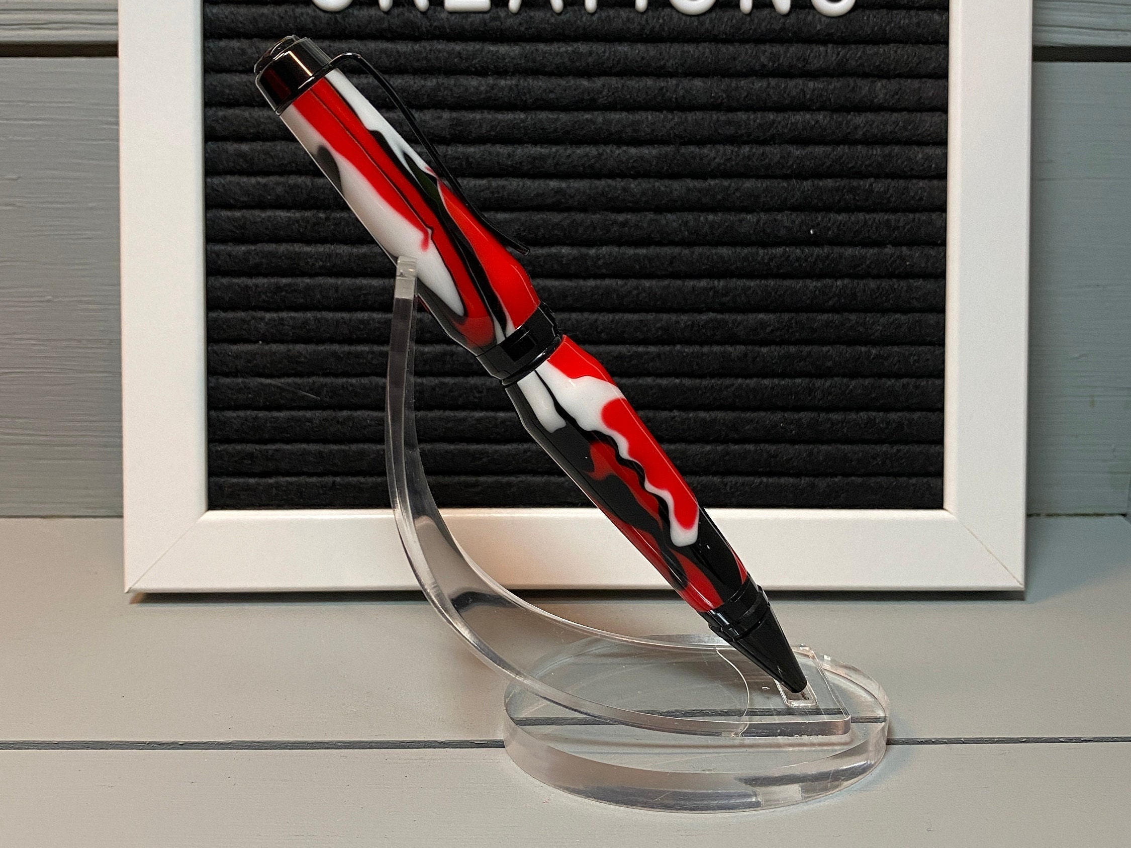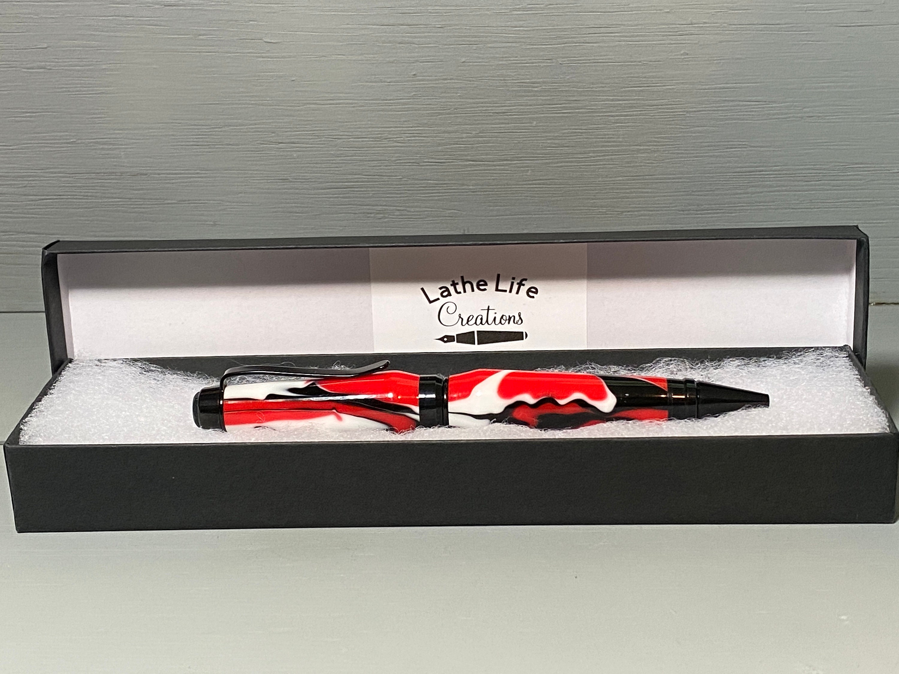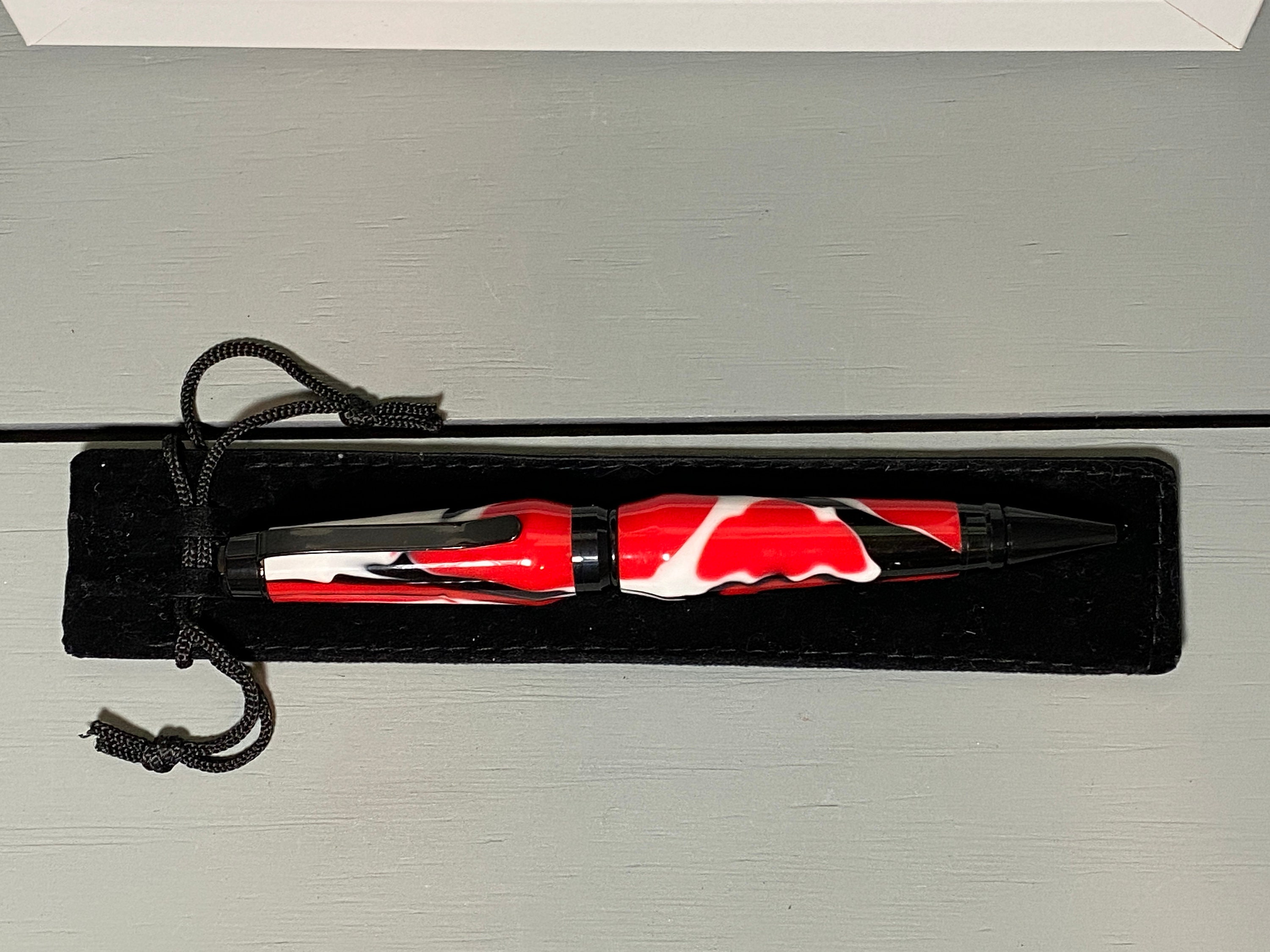With its classic cigar design the pen fits well and feels very comfortable in the hand. The beautiful, bright black trim enhances the red, black and white colors of this unique beauty. This pen would make a great gift for anyone, especially your favorite GRAD!