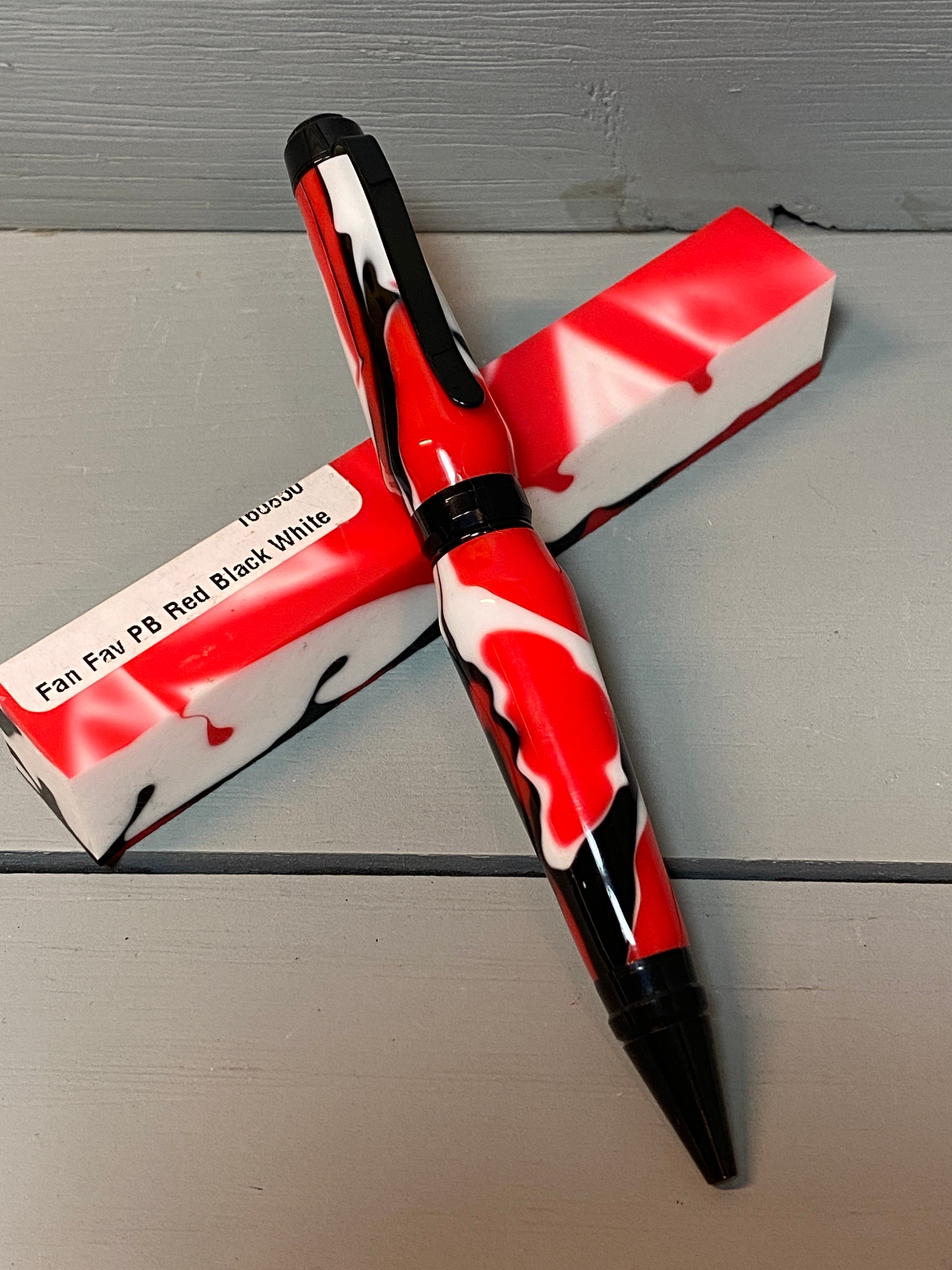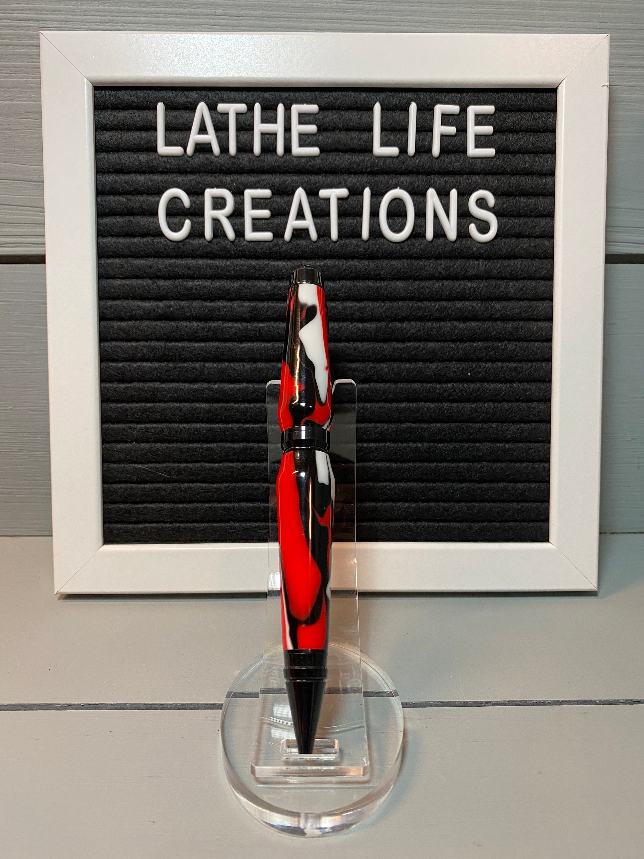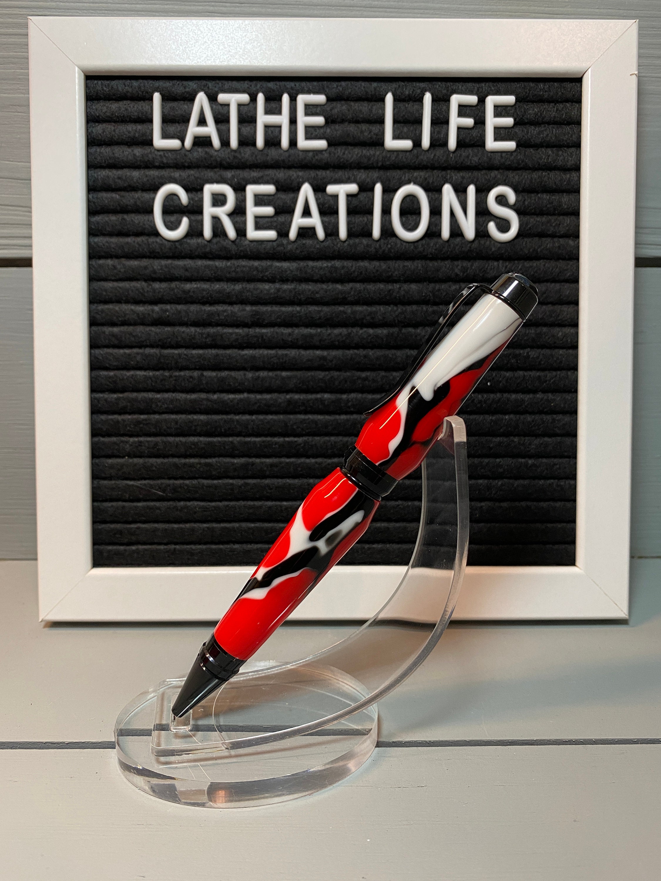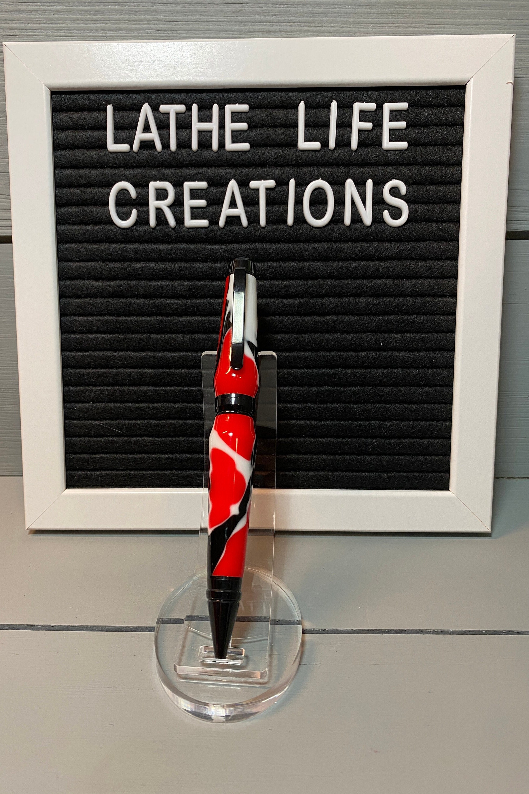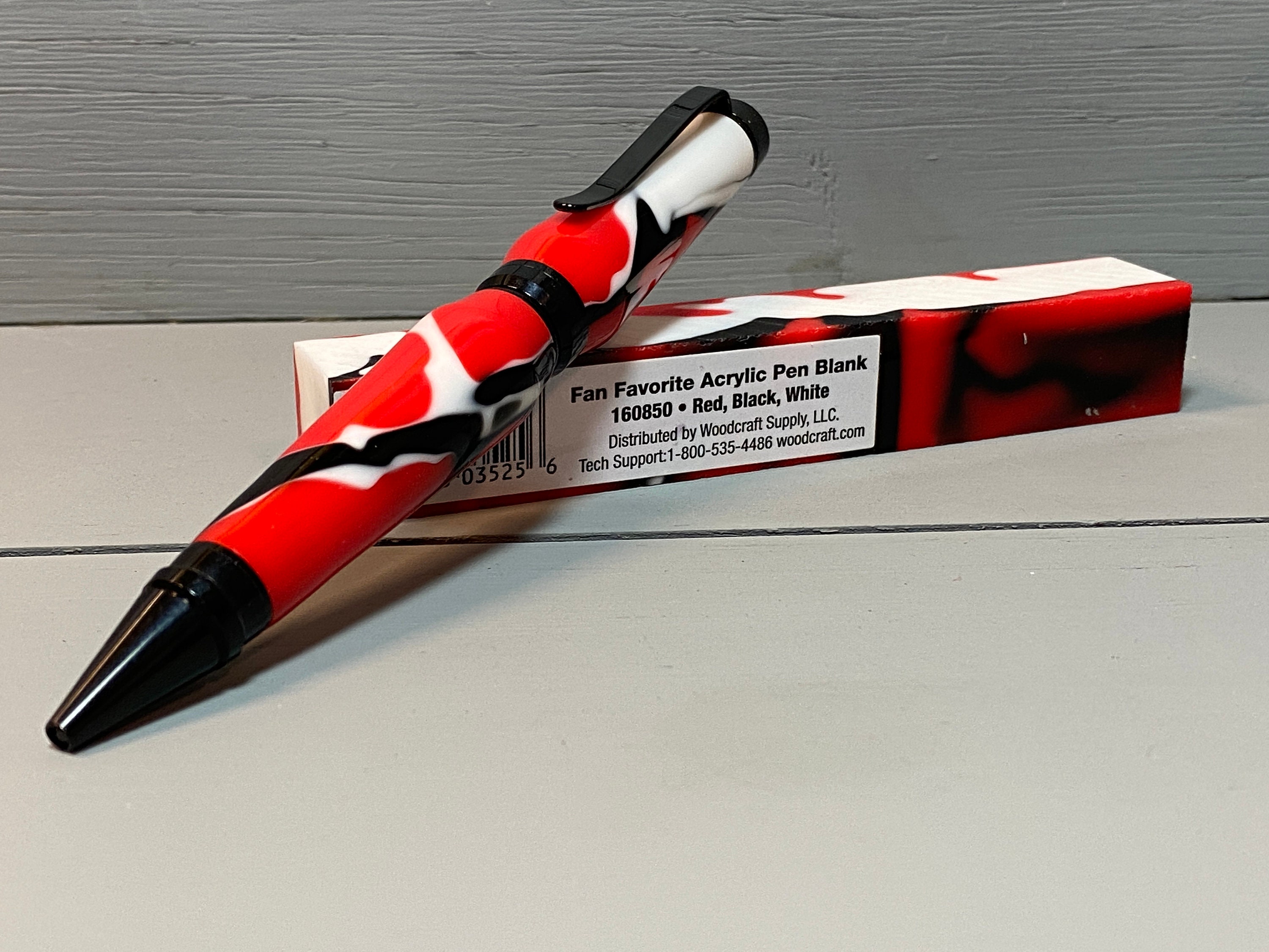 "Hard, Tough, Together" - This handcrafted pen was made from an acrylic resin blank of the colors of the NC State Wolfpack, red, black and white. Being that two of our kids went to NCSU (along with a lot of our money), and I worked in the Communications Department for a few years, I have to admit that I am a little biased when it comes to my favorite NC college team! Like NC State's slogan: Hard, tough, together... this pen displays all of those qualities. GO WOLFPACK!!