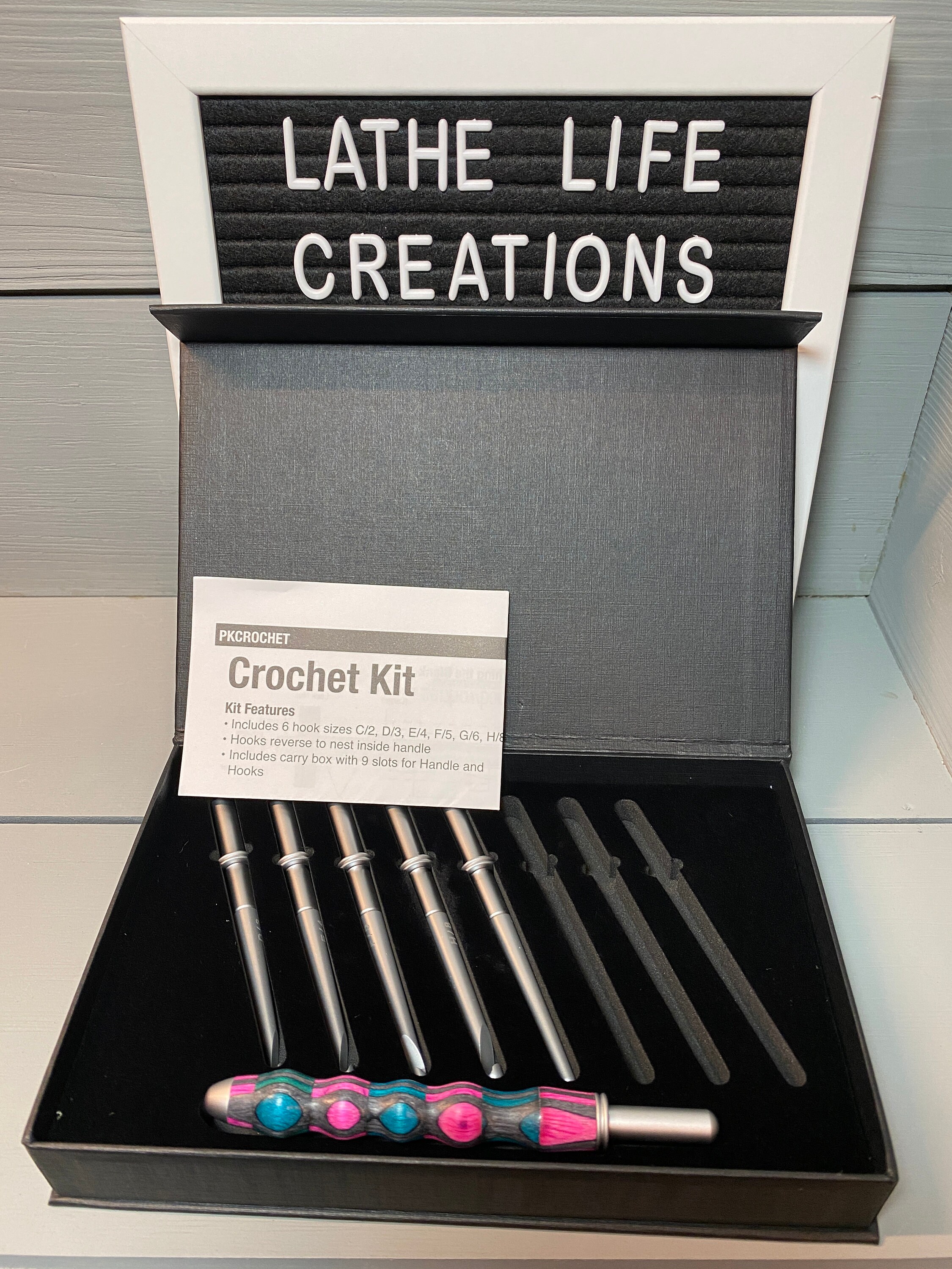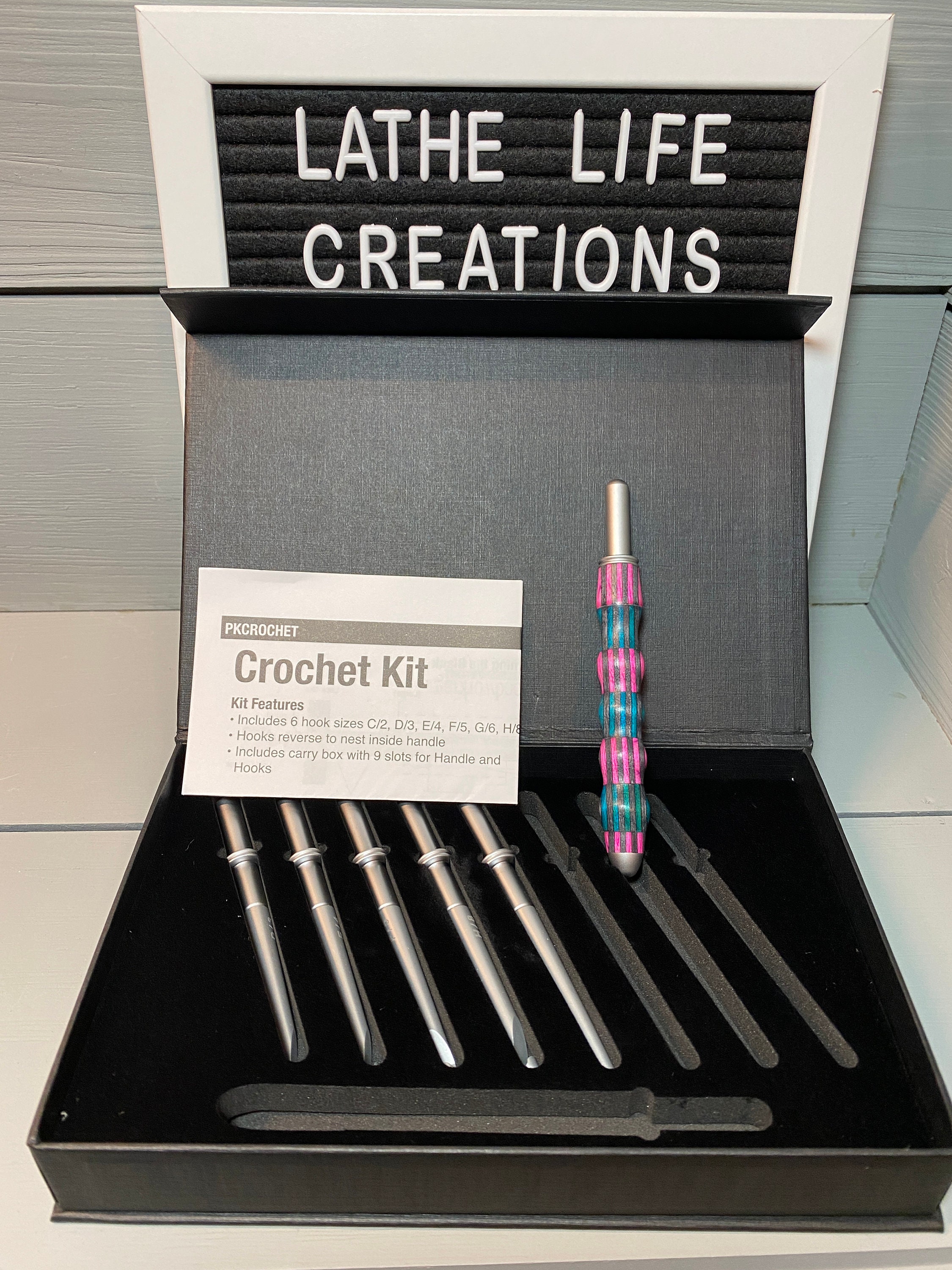 This beautiful crochet hook set includes a fun and funky handcrafted crochet handle made of bright Spectraply composite wood in turquoise blue and pink, finished in brushed satin silver trim to match the assorted hooks that are part of this set. The included hook sizes are C/2, D/3, E/4, F/5, G/6, and H/8. The crochet hooks reverse to nest inside of the crochet handle for easier storage when in use. This beautiful set includes a carry box with 9 slots to hold the handle and hooks, plus room for a few more if desired. IT'S A PERFECT GIFT!