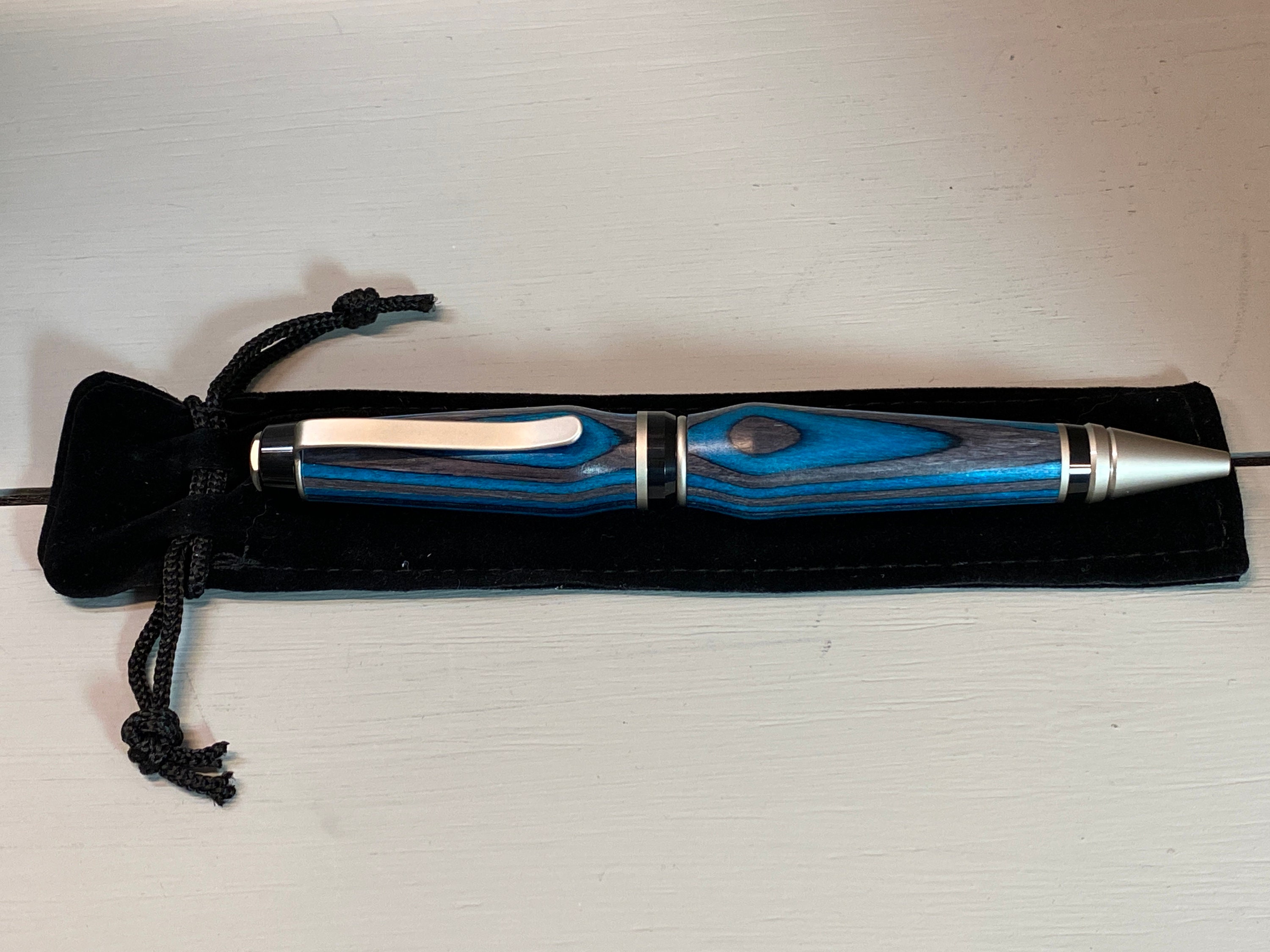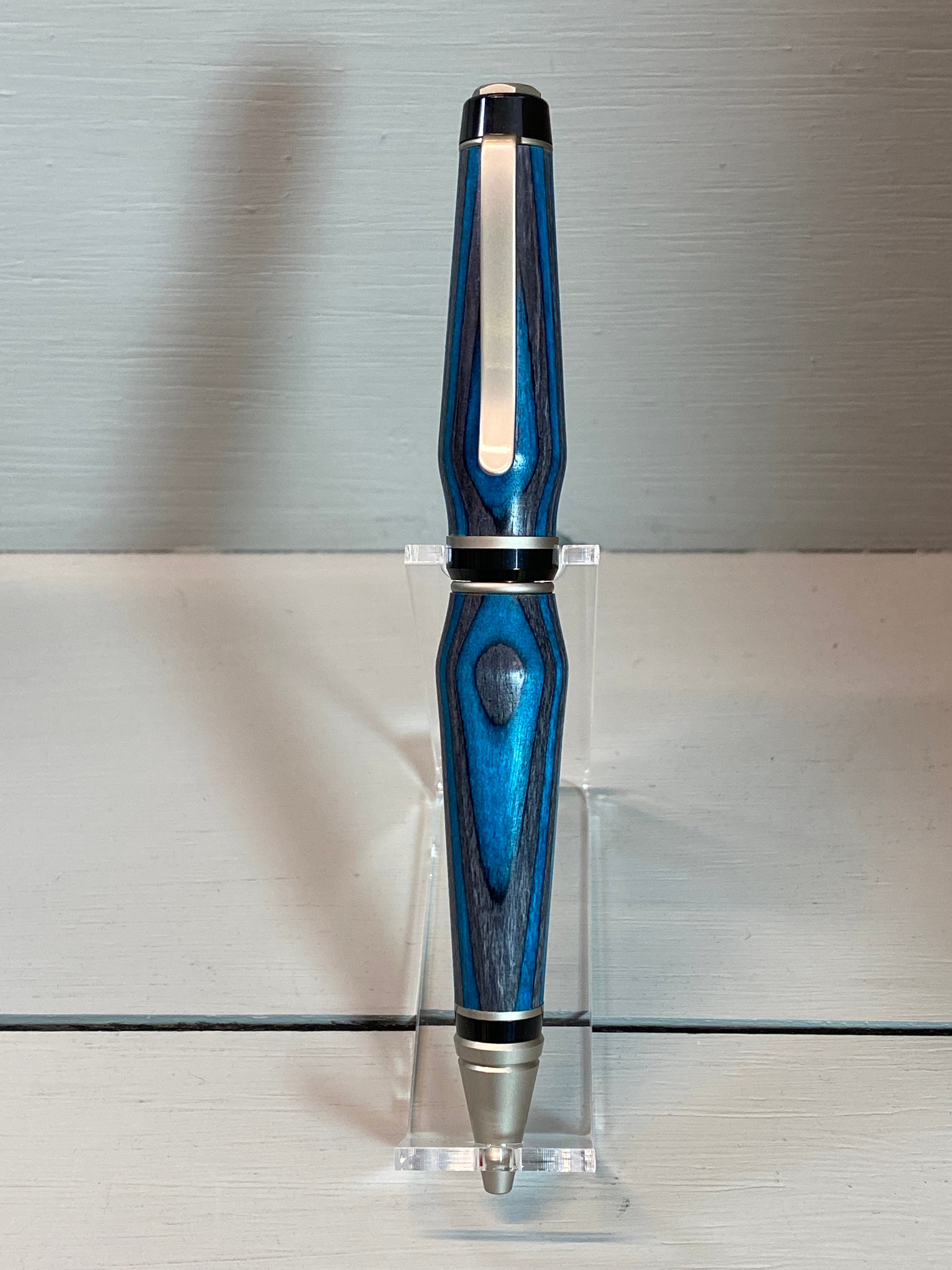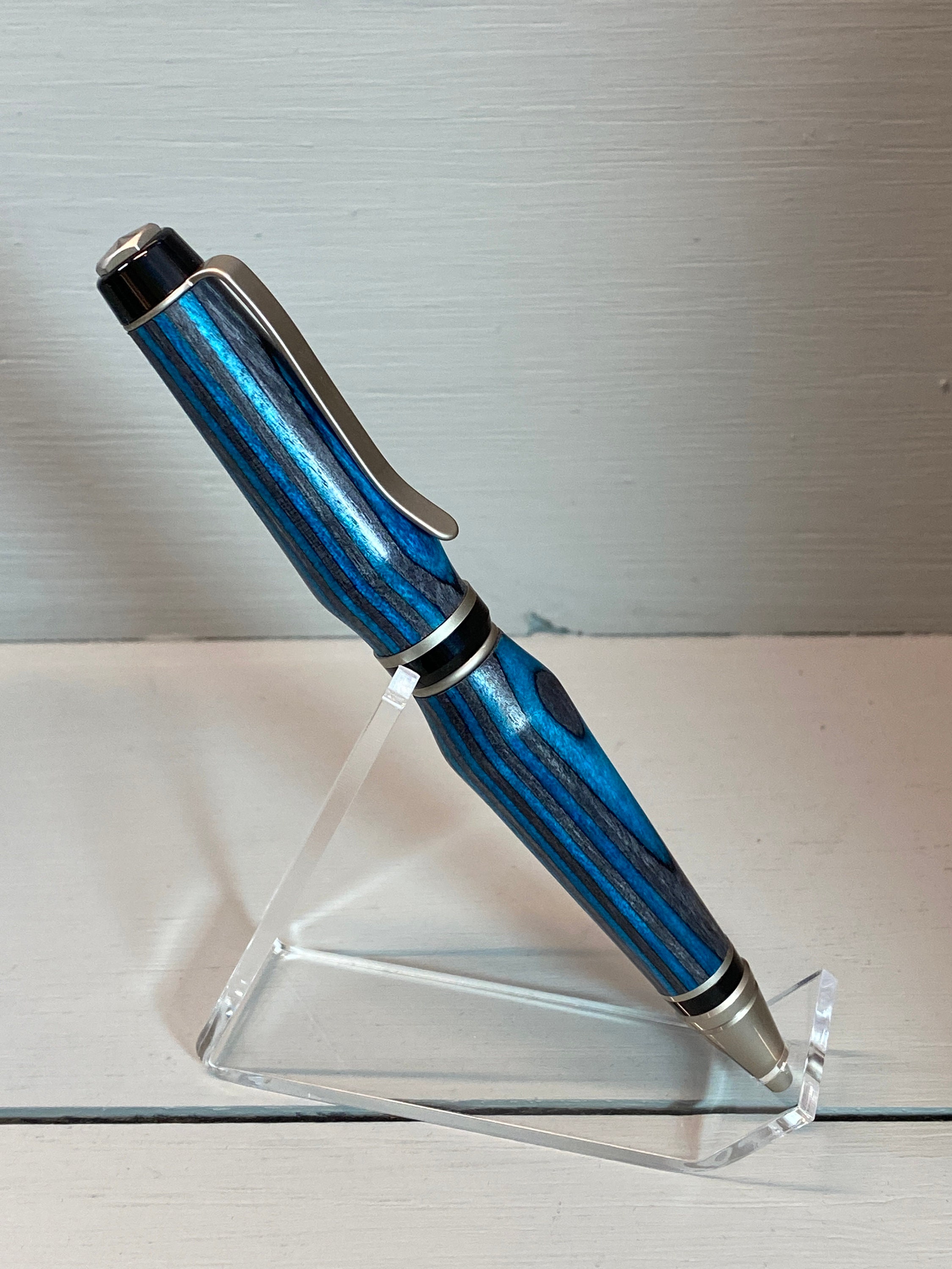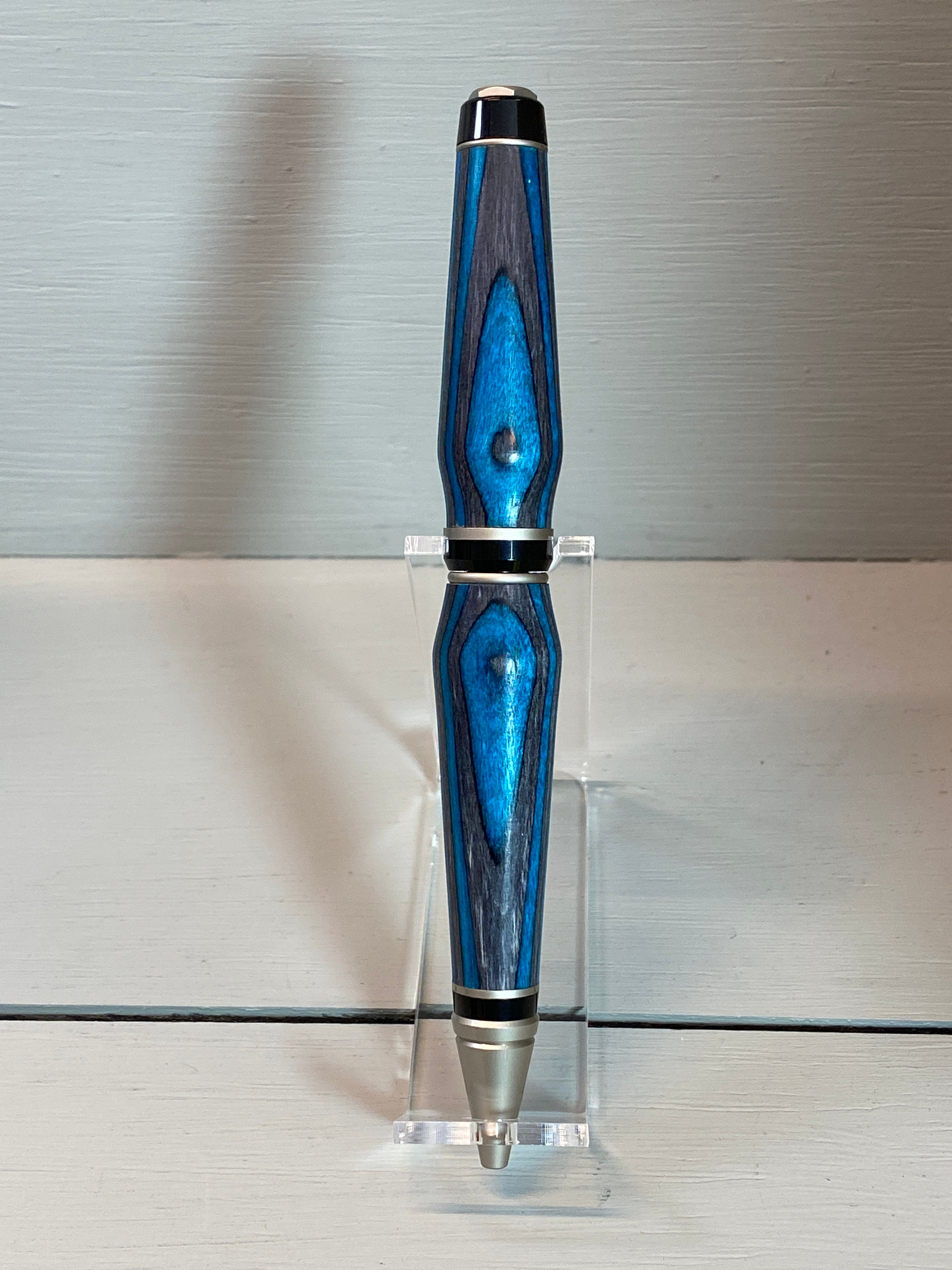 The Deep Blue IV is a handcrafted Cigar Pen which is made of beautiful deep, dark teal blue and black composite wood (Spectraply). Gayle Akerman artistically created it. The elegant satin nickel and black trim enhances the beauty of this unique wood, while adding to its fun design and funkiness!! This pen has a bit more curved design, suggesting the subtle waves of the deep blue sea. Cigar pens are heavier pens than the traditional slim-style pens, yet they feel nice in the hand and look great on your desk.