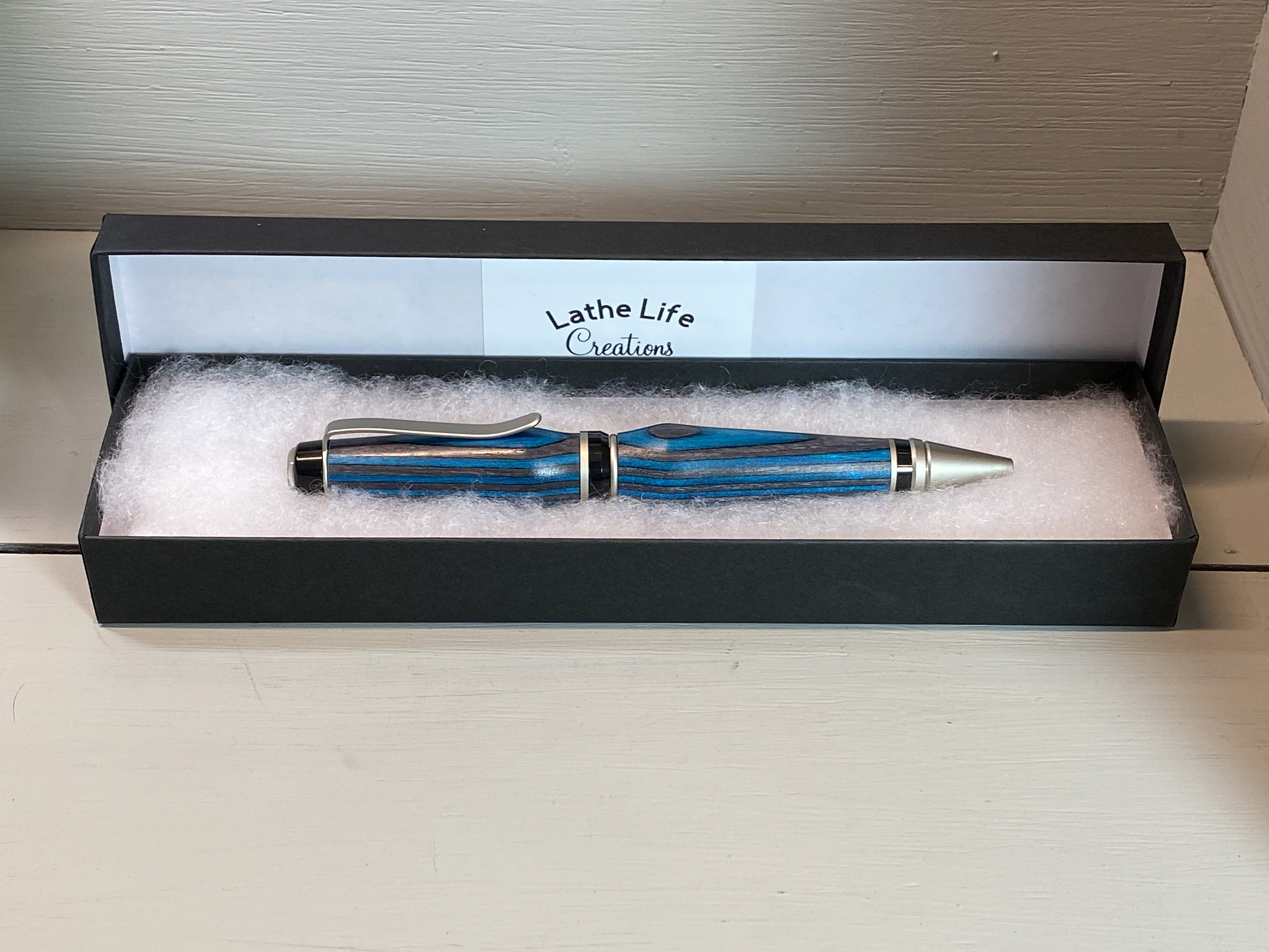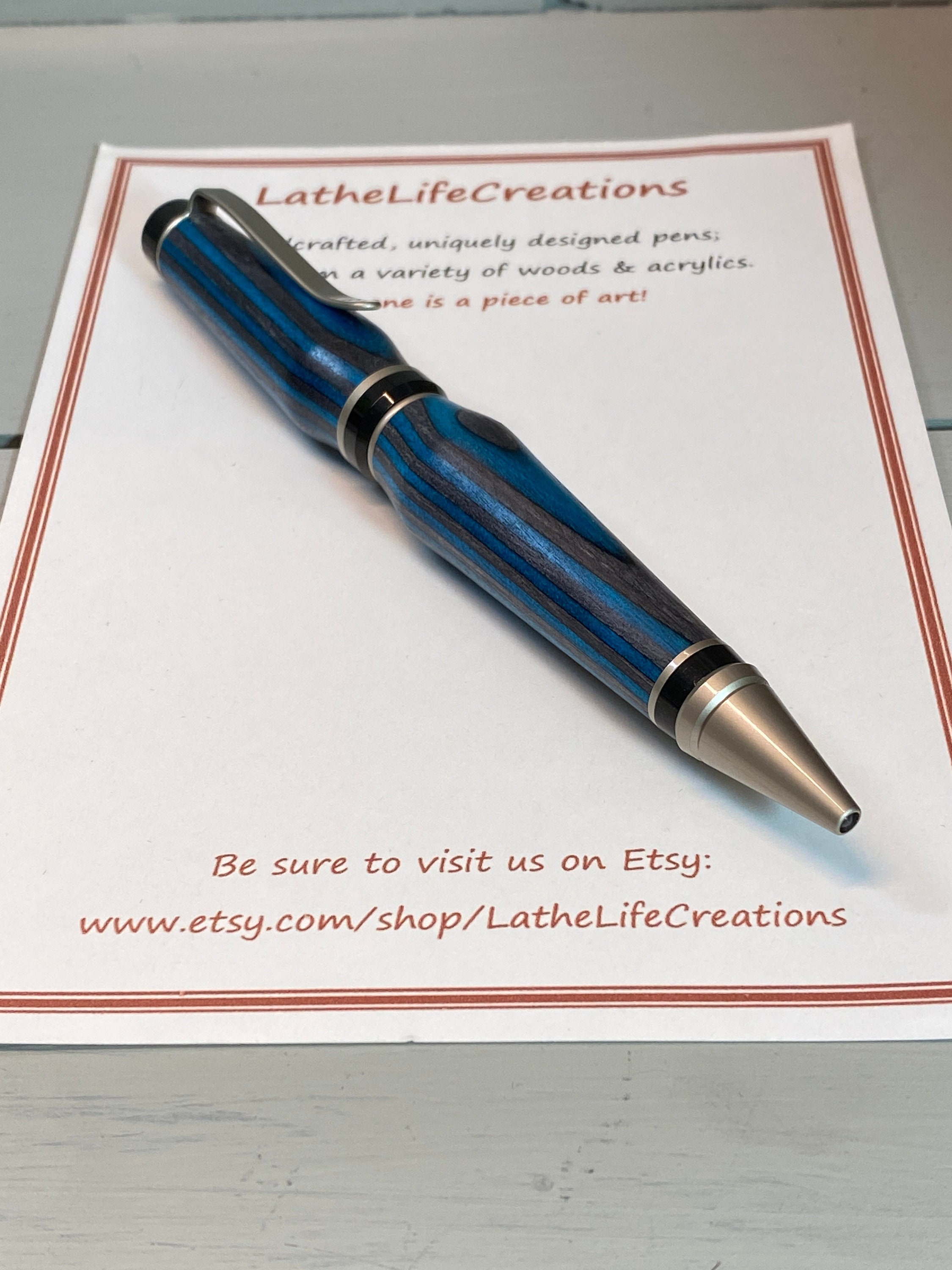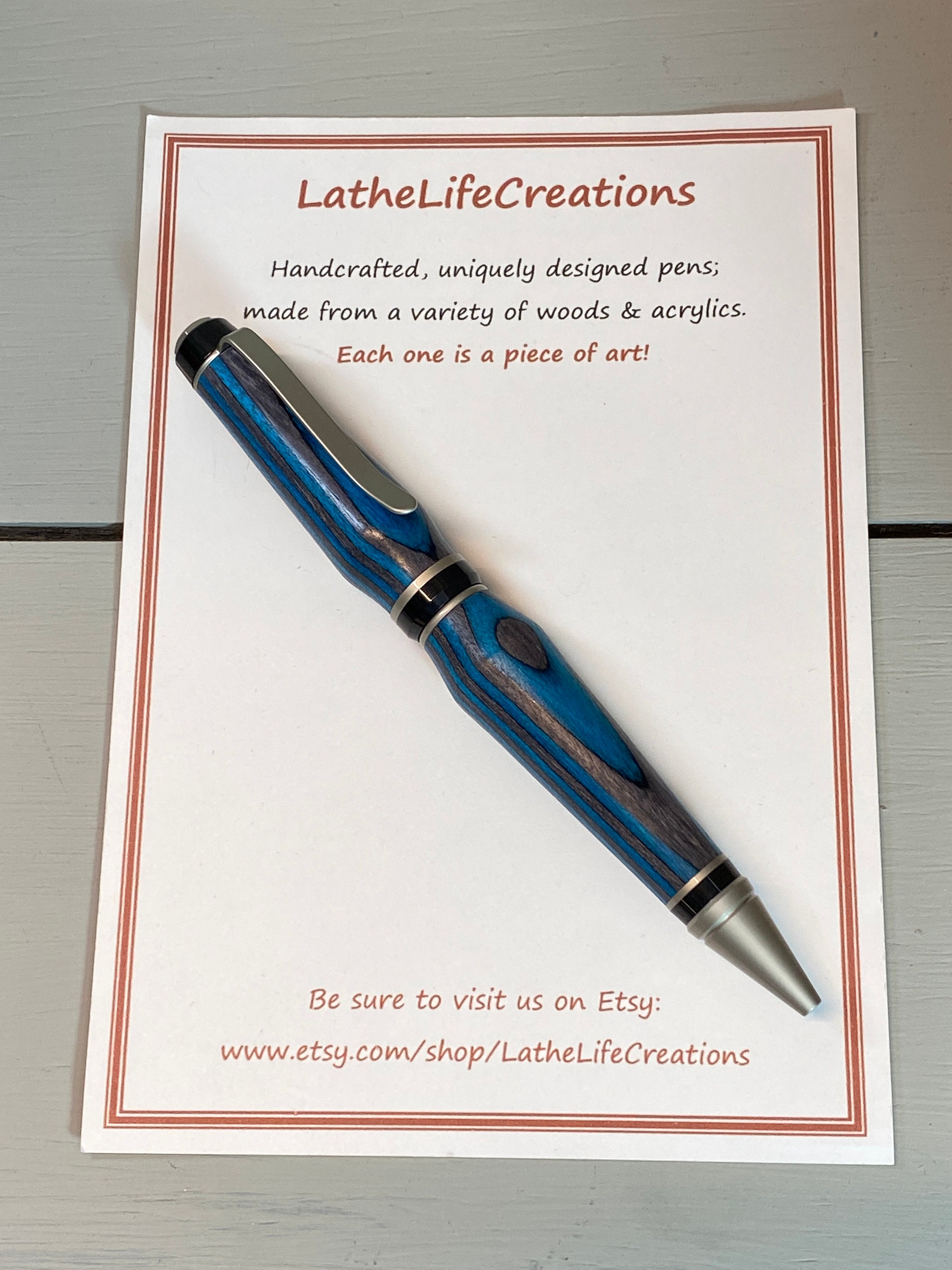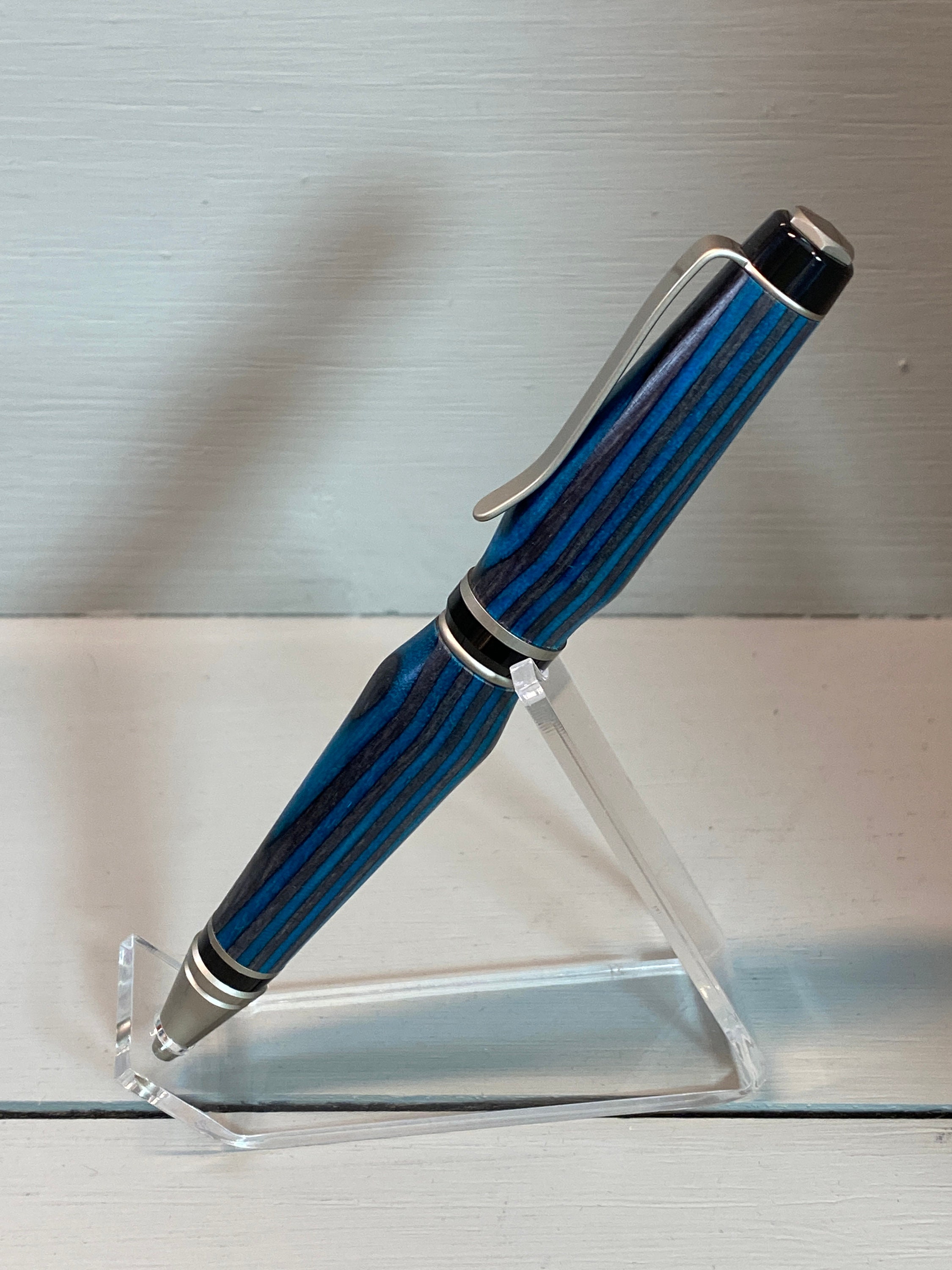 The Deep Blue IV is a handcrafted Cigar Pen which is made of beautiful deep, dark teal blue and black composite wood (Spectraply). Gayle Akerman artistically created it. The elegant satin nickel and black trim enhances the beauty of this unique wood, while adding to its fun design and funkiness!! This pen has a bit more curved design, suggesting the subtle waves of the deep blue sea. Cigar pens are heavier pens than the traditional slim-style pens, yet they feel nice in the hand and look great on your desk.