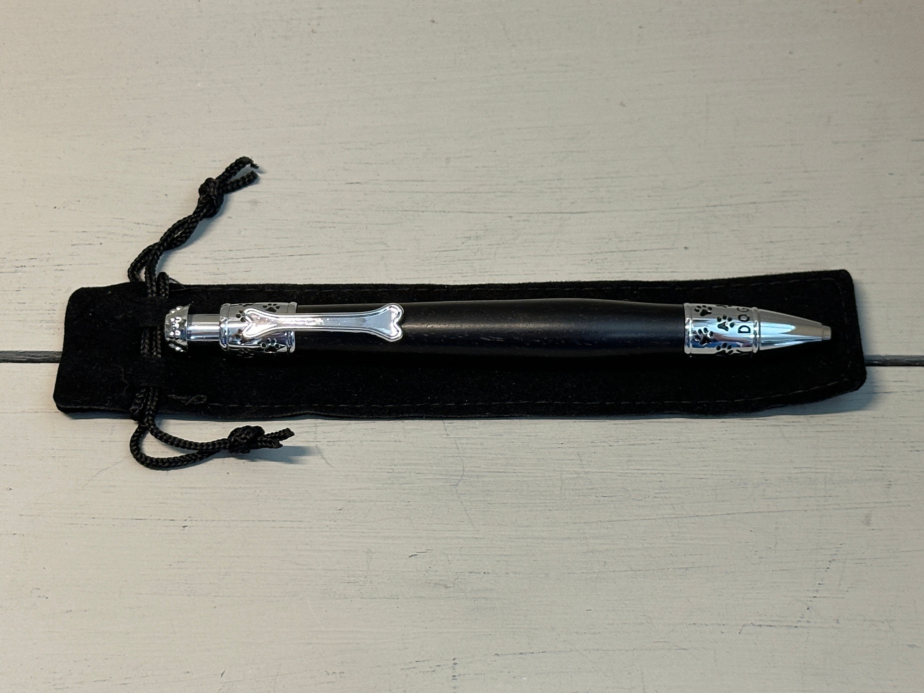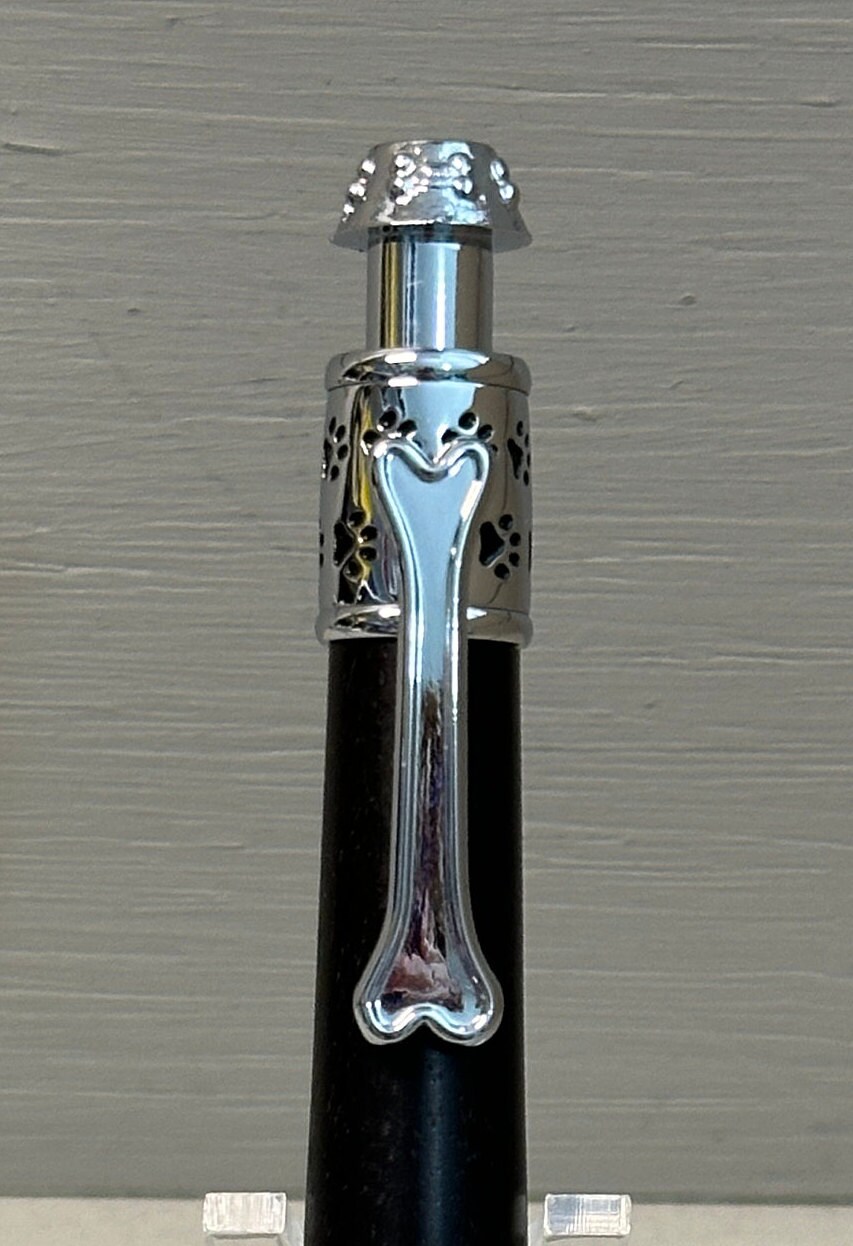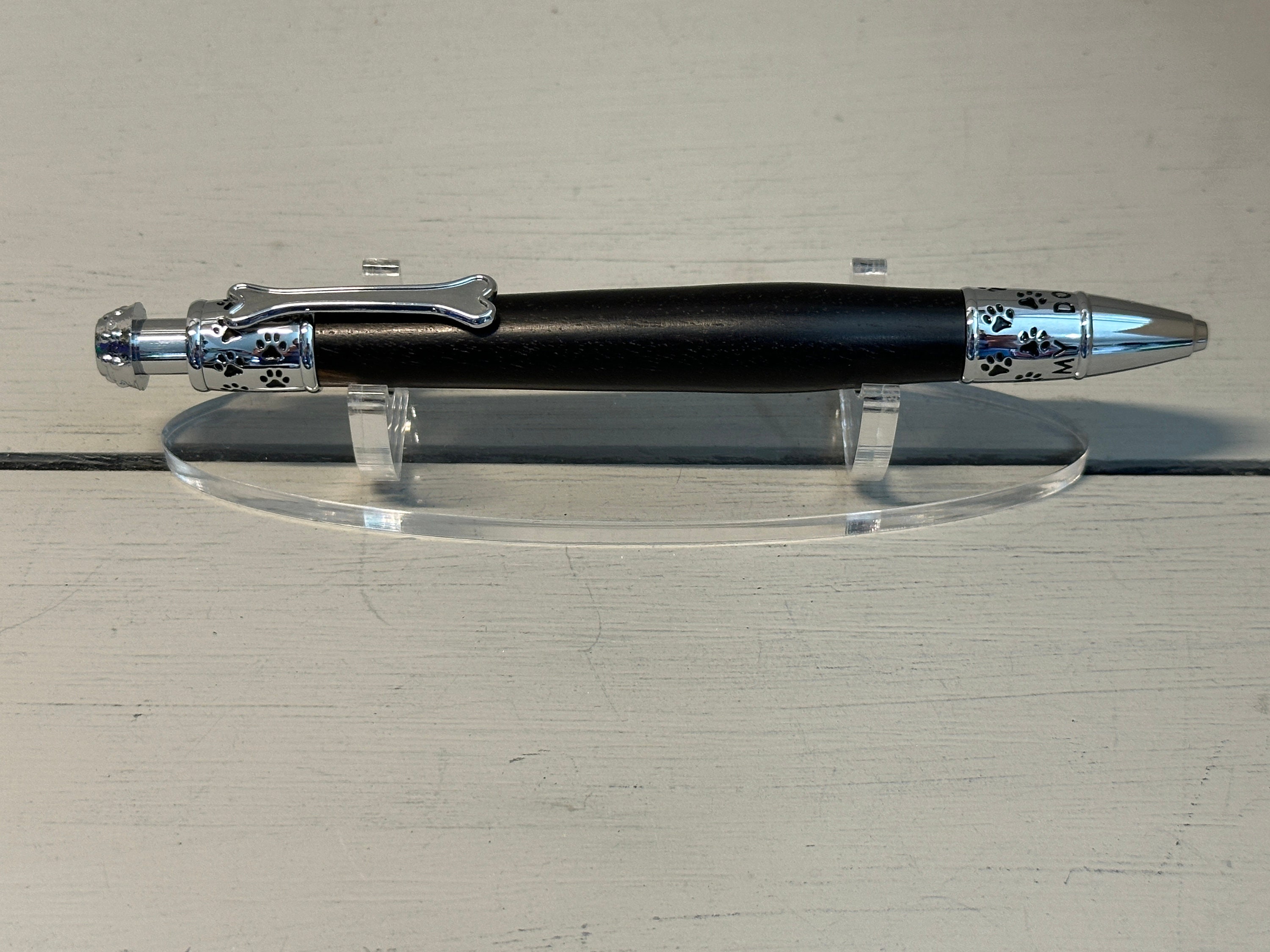 I LOVE MY DOG - Made of Black Ebony wood and finished with a special bright chrome trim, this pen is a MUST HAVE for any dog lover!! Always be reminded of your best friend - everywhere you go. Inspired everything doggie including; Click Top: Casted into the shape of a classic dog bowl with biscuit detail that wraps around the exterior. The top features a stamped dog paw print and is slightly recessed for comfortable clicking. Includes the same super quiet, smooth action click mechanism found in our Vertex pen kits. Spring Pen Clip: A bone is commonly considered a dogs favorite treat (or toy) and we thought it the perfect way to represent the clip. Backend and tip: Paw prints are engraved in a playful pattern around the tip and backend to represent the happy, energetic spirit of a dog. "I LOVE MY DOG" is engraved below the paw prints on the tip to signify the valuable relationship between an owner and their dog.