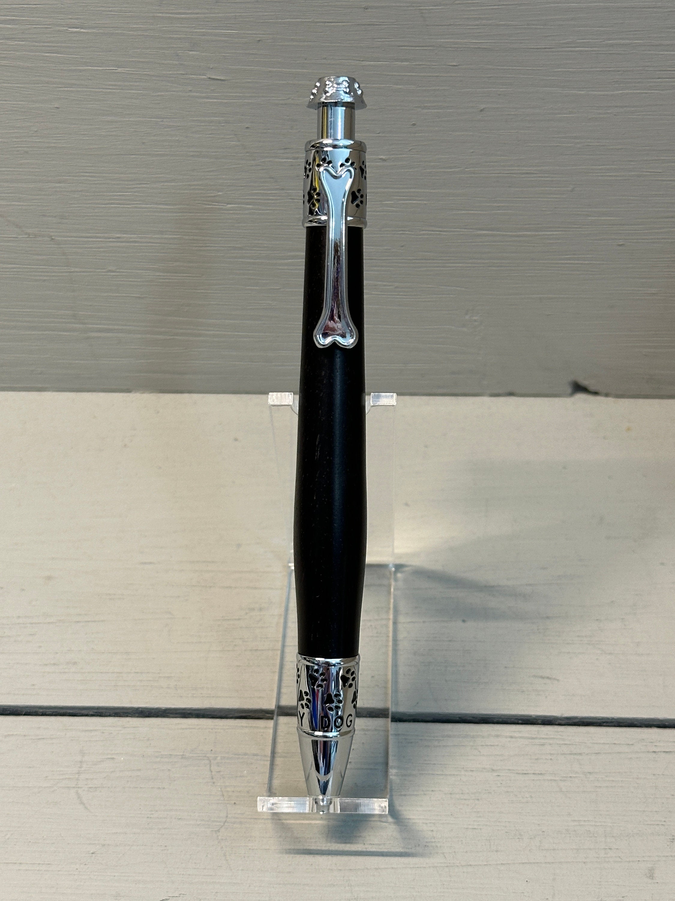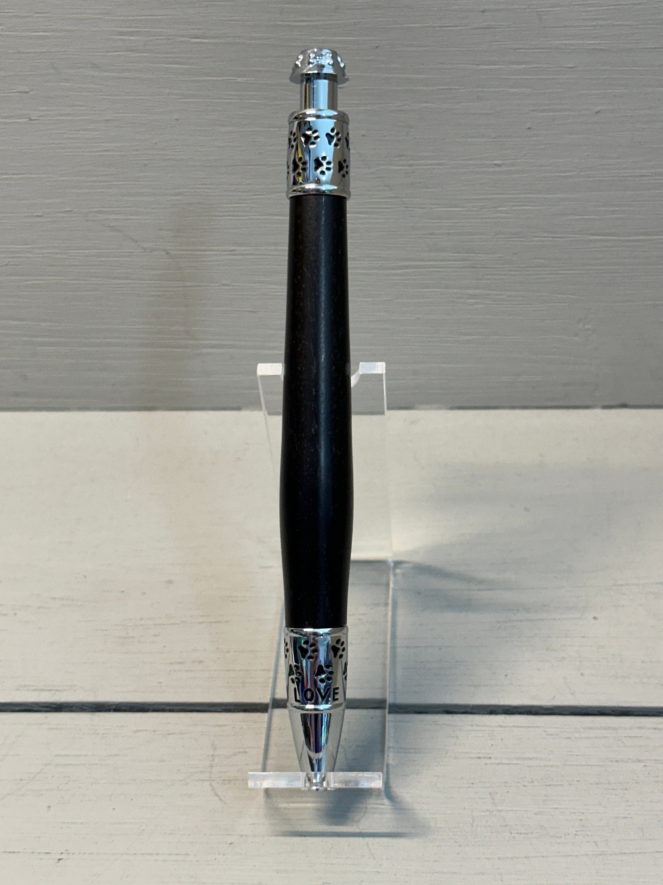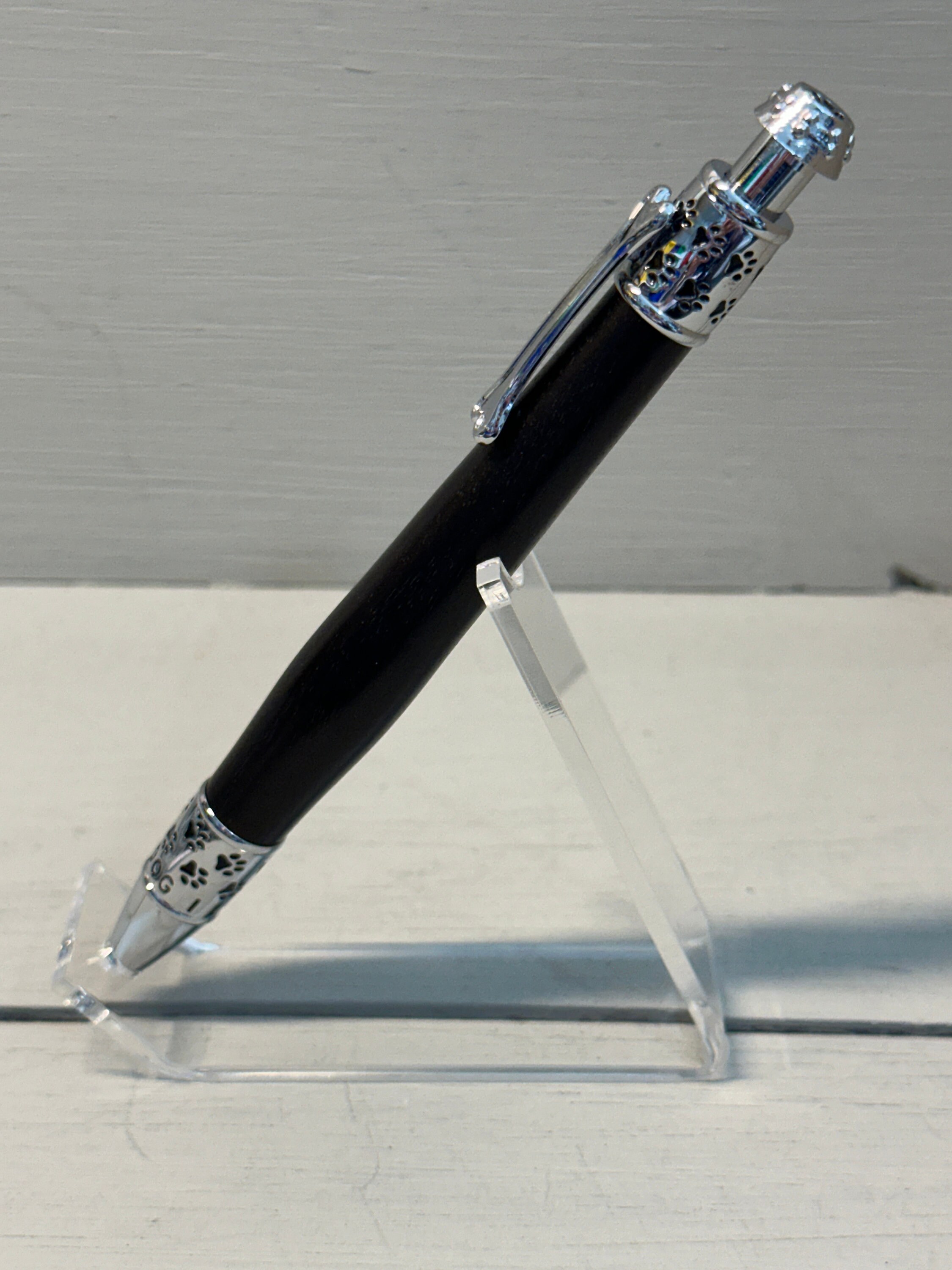 I LOVE MY DOG - Made of Black Ebony wood and finished with a special bright chrome trim, this pen is a MUST HAVE for any dog lover!! Always be reminded of your best friend - everywhere you go. Inspired everything doggie including; Click Top: Casted into the shape of a classic dog bowl with biscuit detail that wraps around the exterior. The top features a stamped dog paw print and is slightly recessed for comfortable clicking. Includes the same super quiet, smooth action click mechanism found in our Vertex pen kits. Spring Pen Clip: A bone is commonly considered a dogs favorite treat (or toy) and we thought it the perfect way to represent the clip. Backend and tip: Paw prints are engraved in a playful pattern around the tip and backend to represent the happy, energetic spirit of a dog. "I LOVE MY DOG" is engraved below the paw prints on the tip to signify the valuable relationship between an owner and their dog.