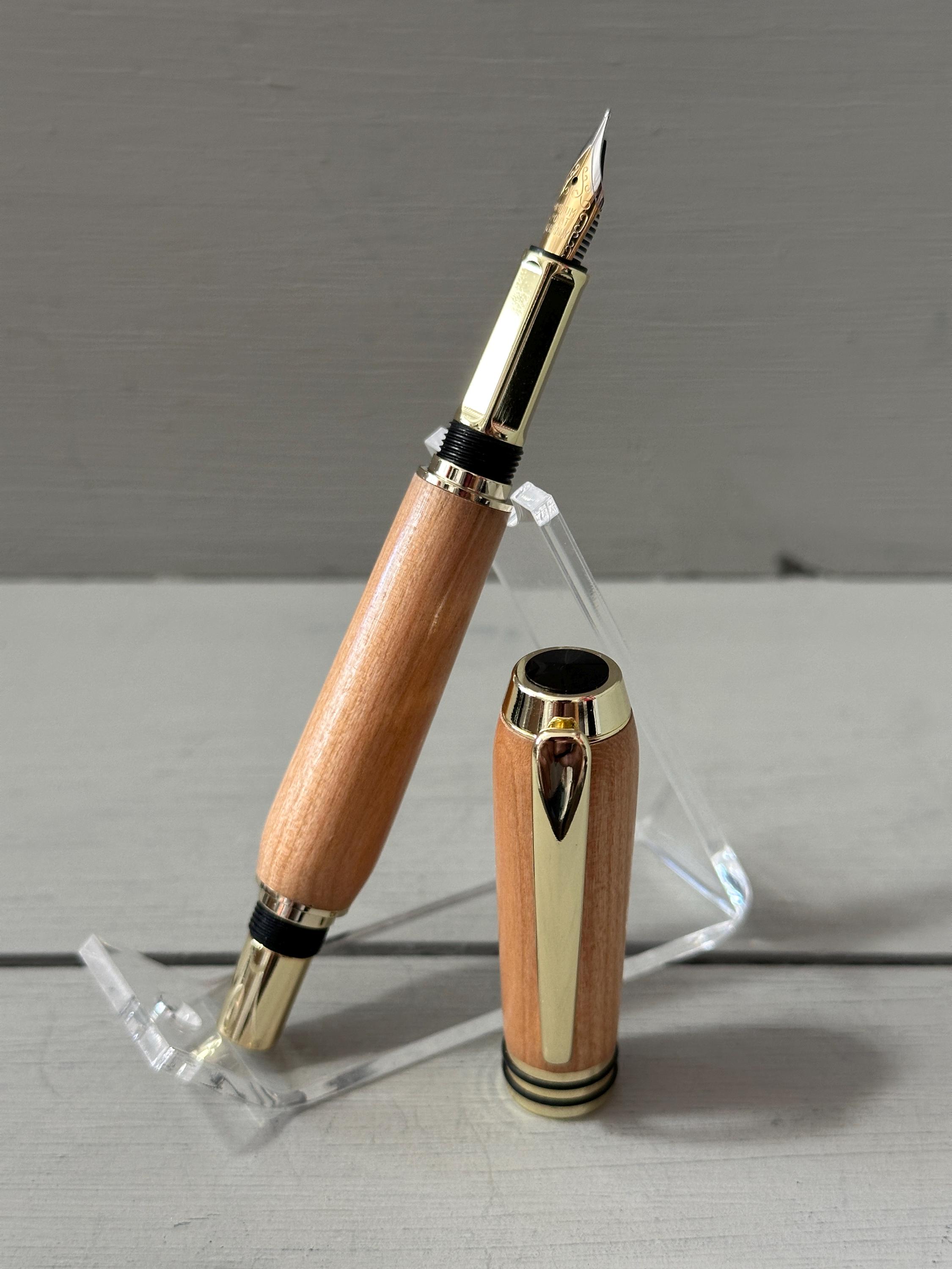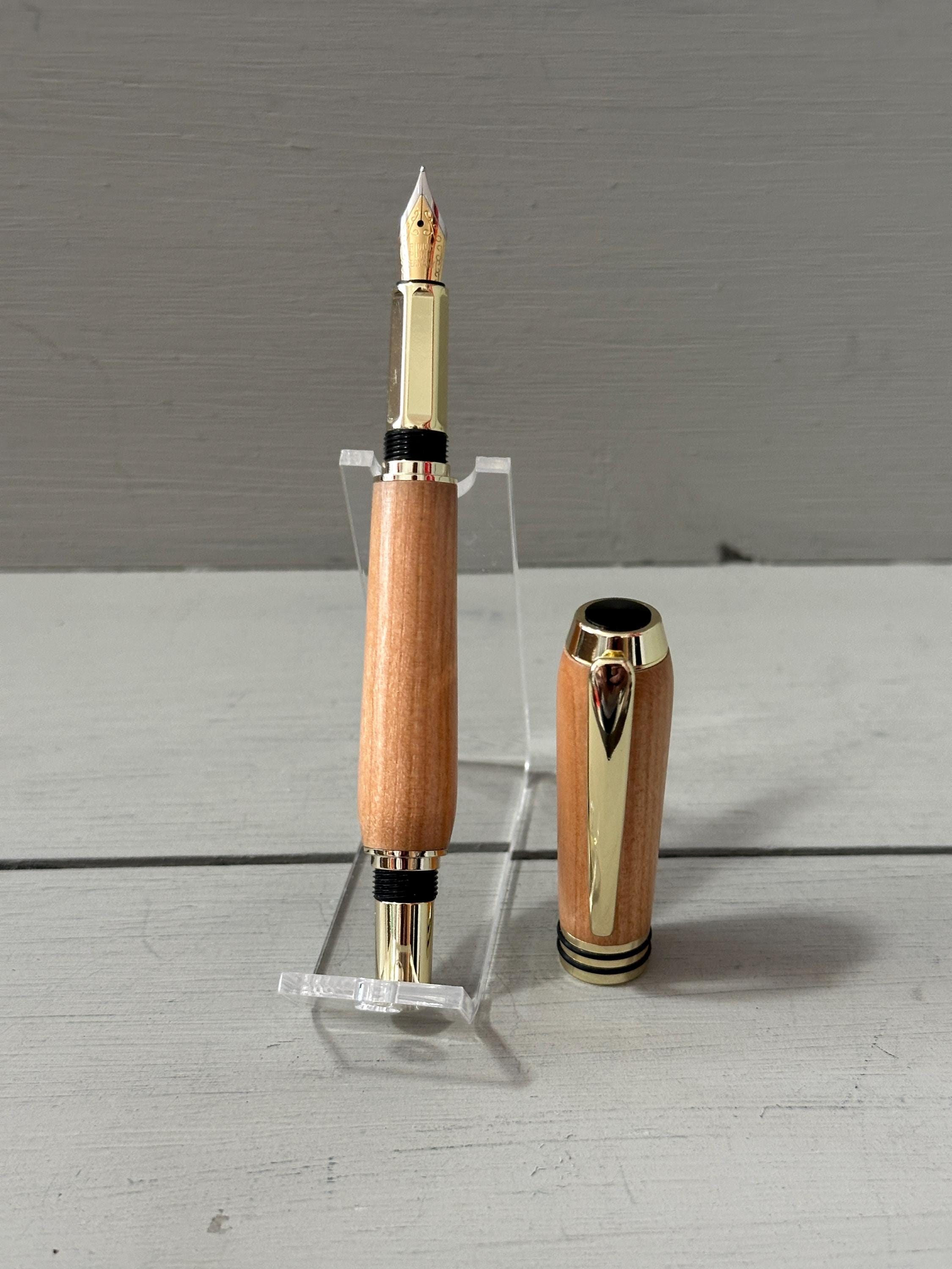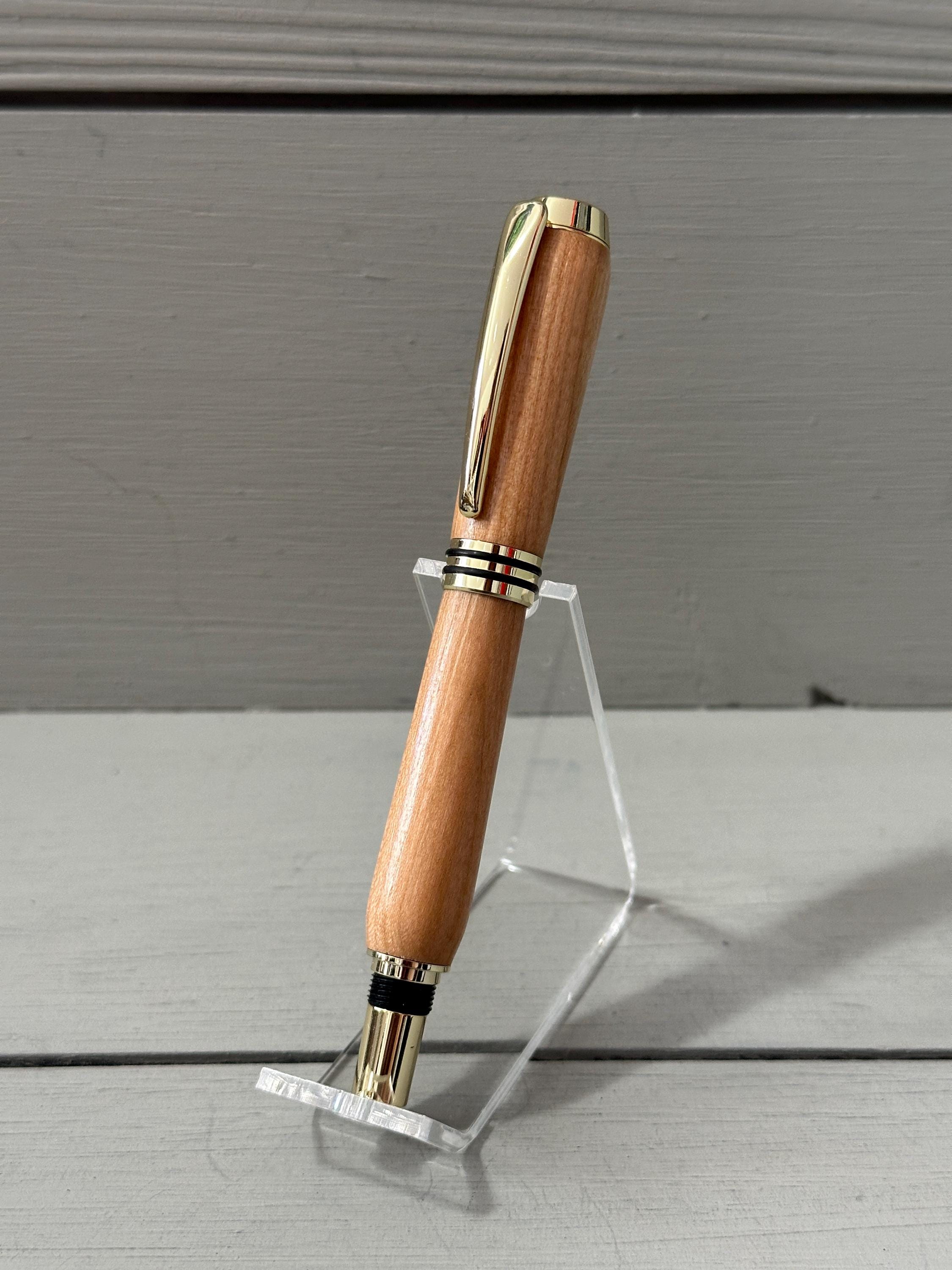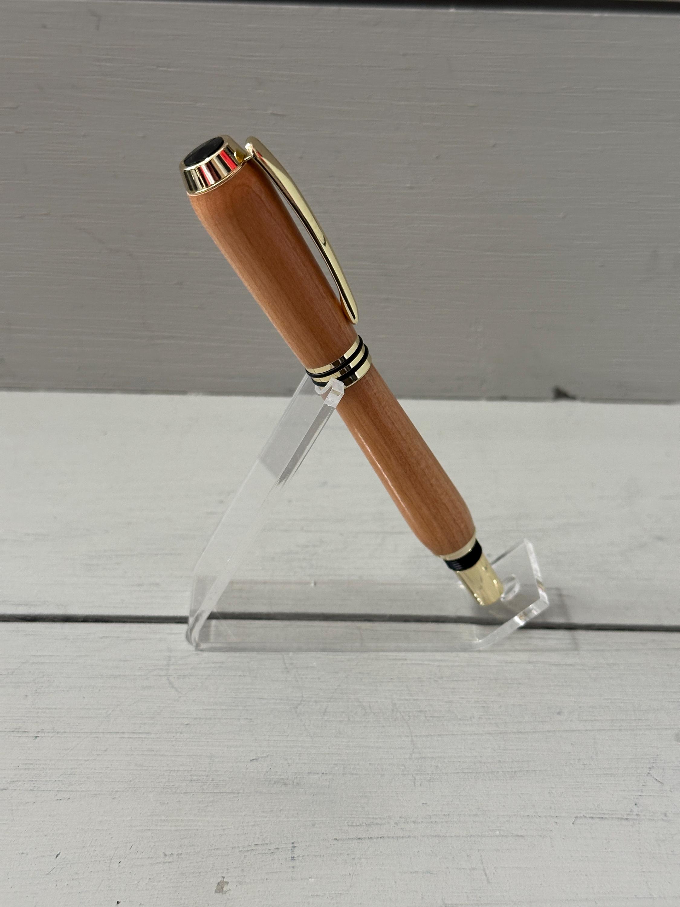 The Cherry Tycoon is a beautiful handcrafted Fountain pen made of cherry wood. The beautiful gold and black trim blends remarkably with the wood's colors, smoothness and subtle grains. It is very unique and sure to be the envy of many!