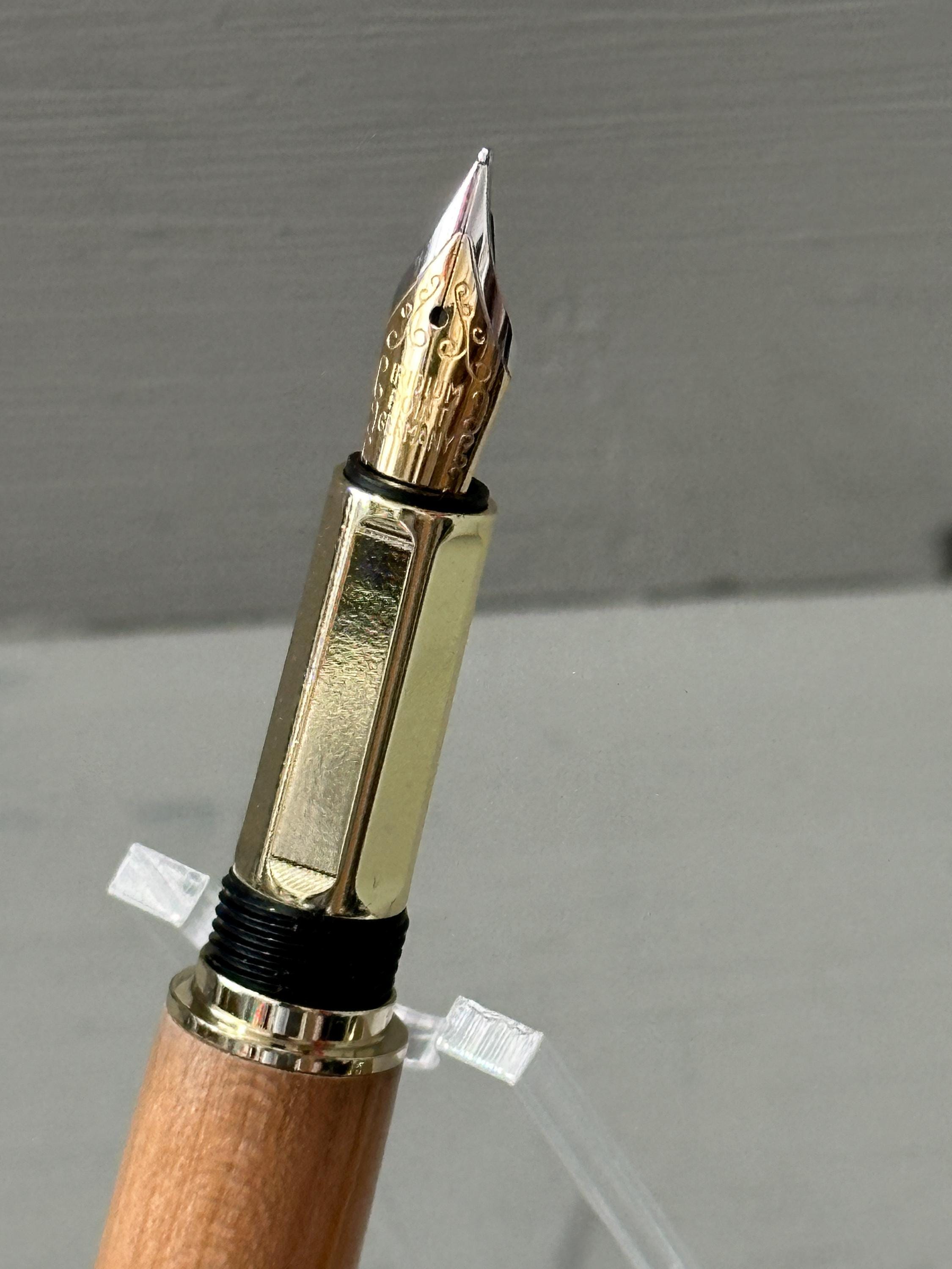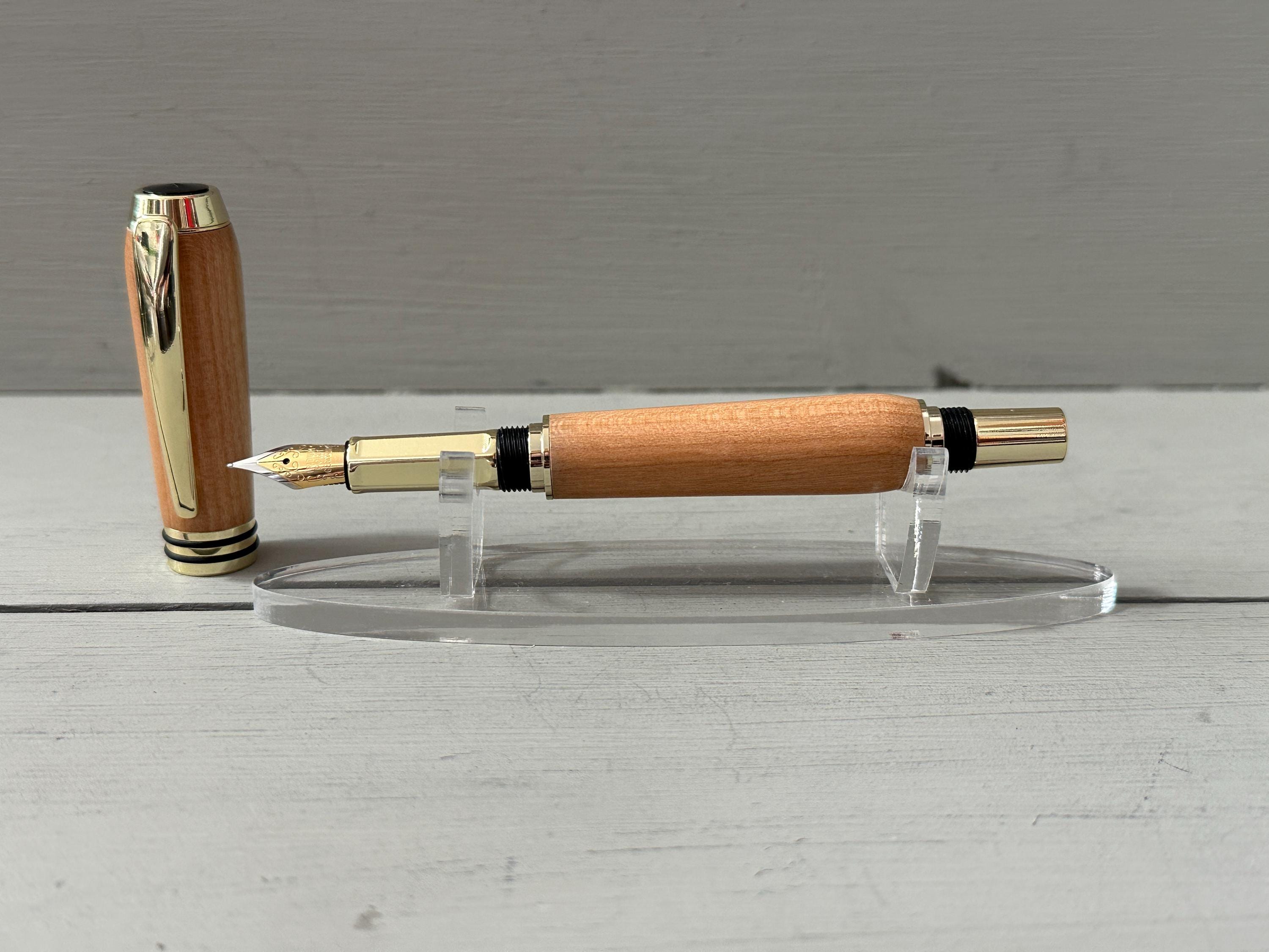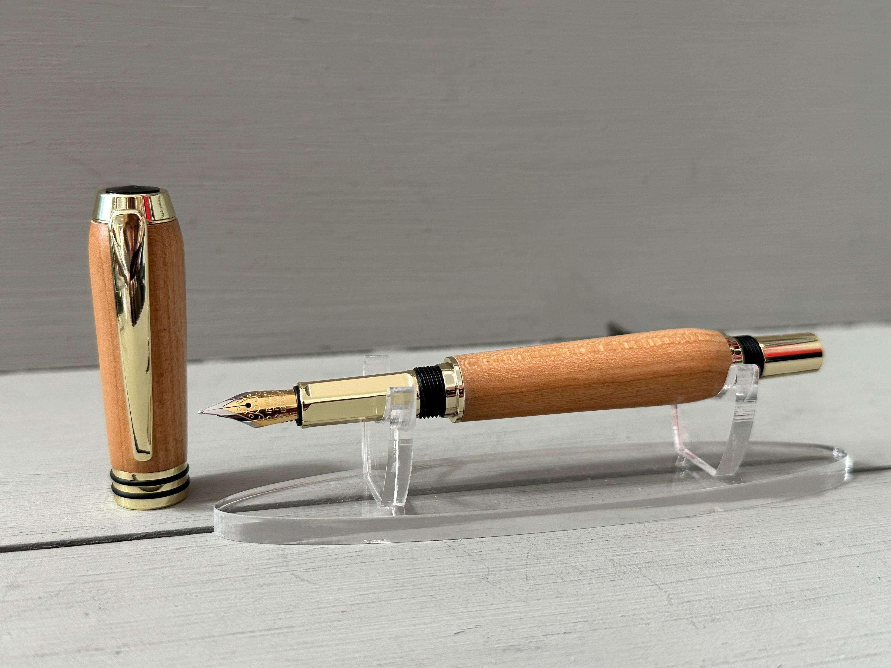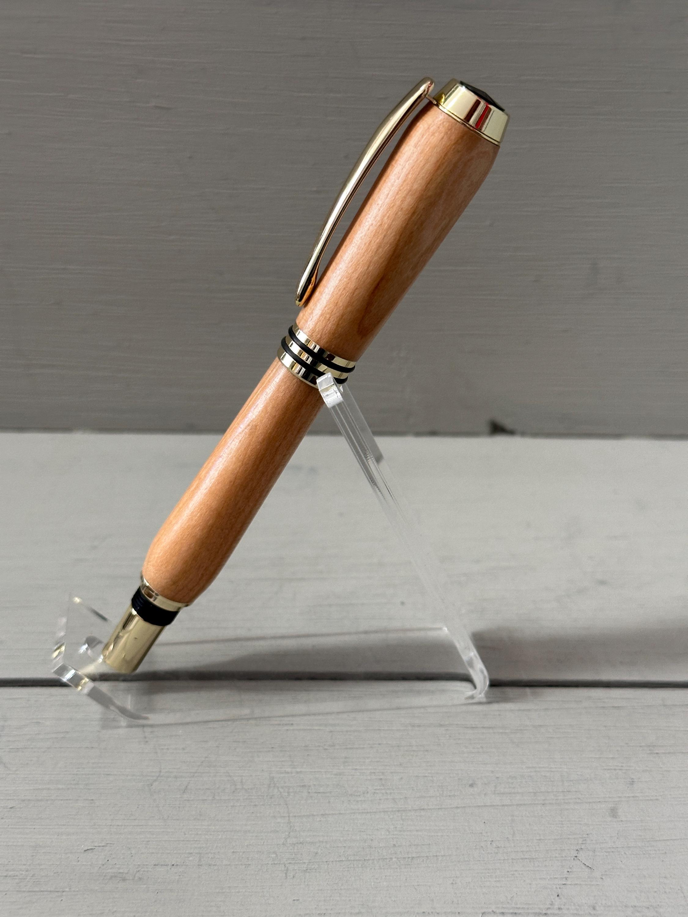 The Cherry Tycoon is a beautiful handcrafted Fountain pen made of cherry wood. The beautiful gold and black trim blends remarkably with the wood's colors, smoothness and subtle grains. It is very unique and sure to be the envy of many!