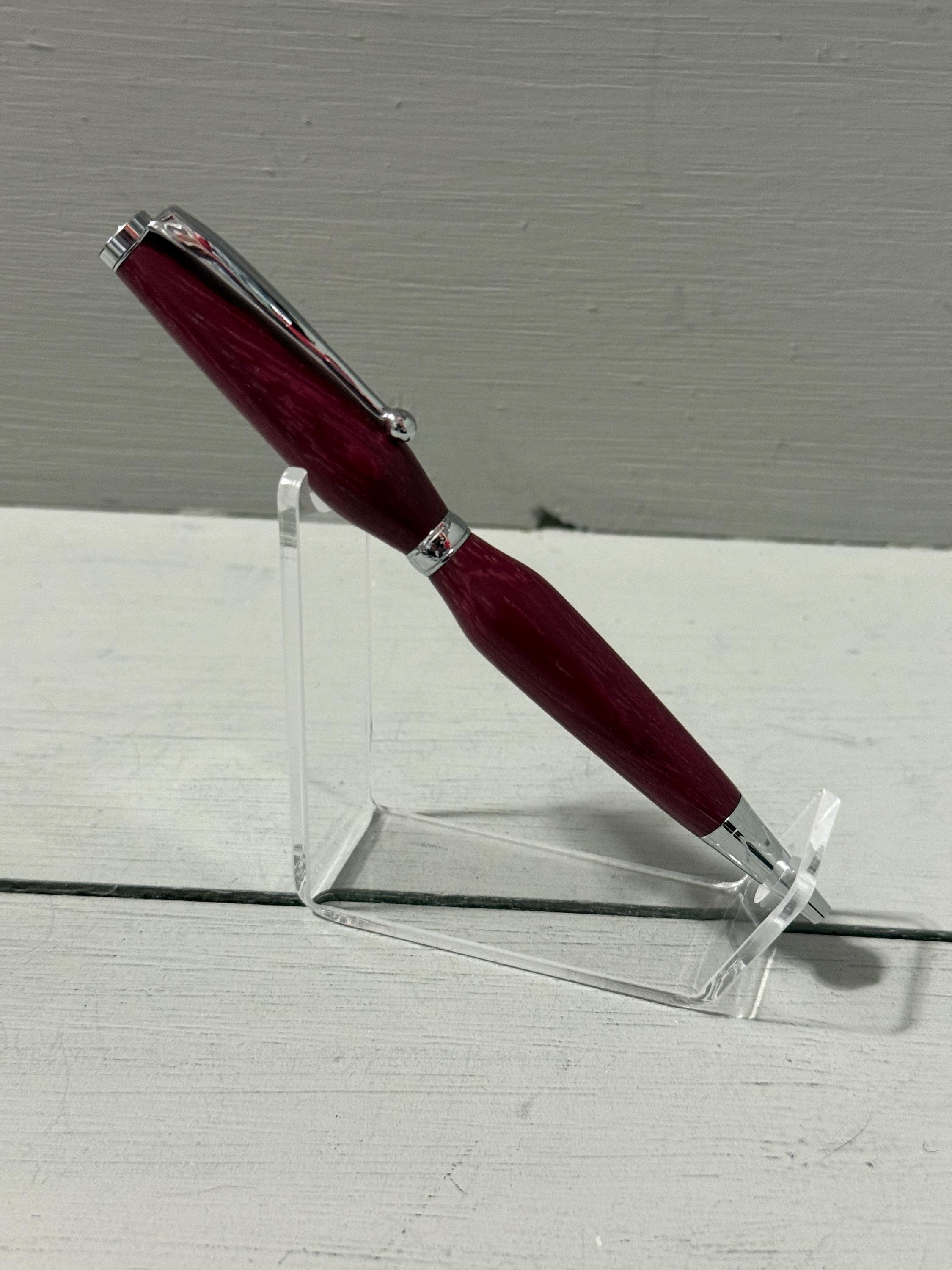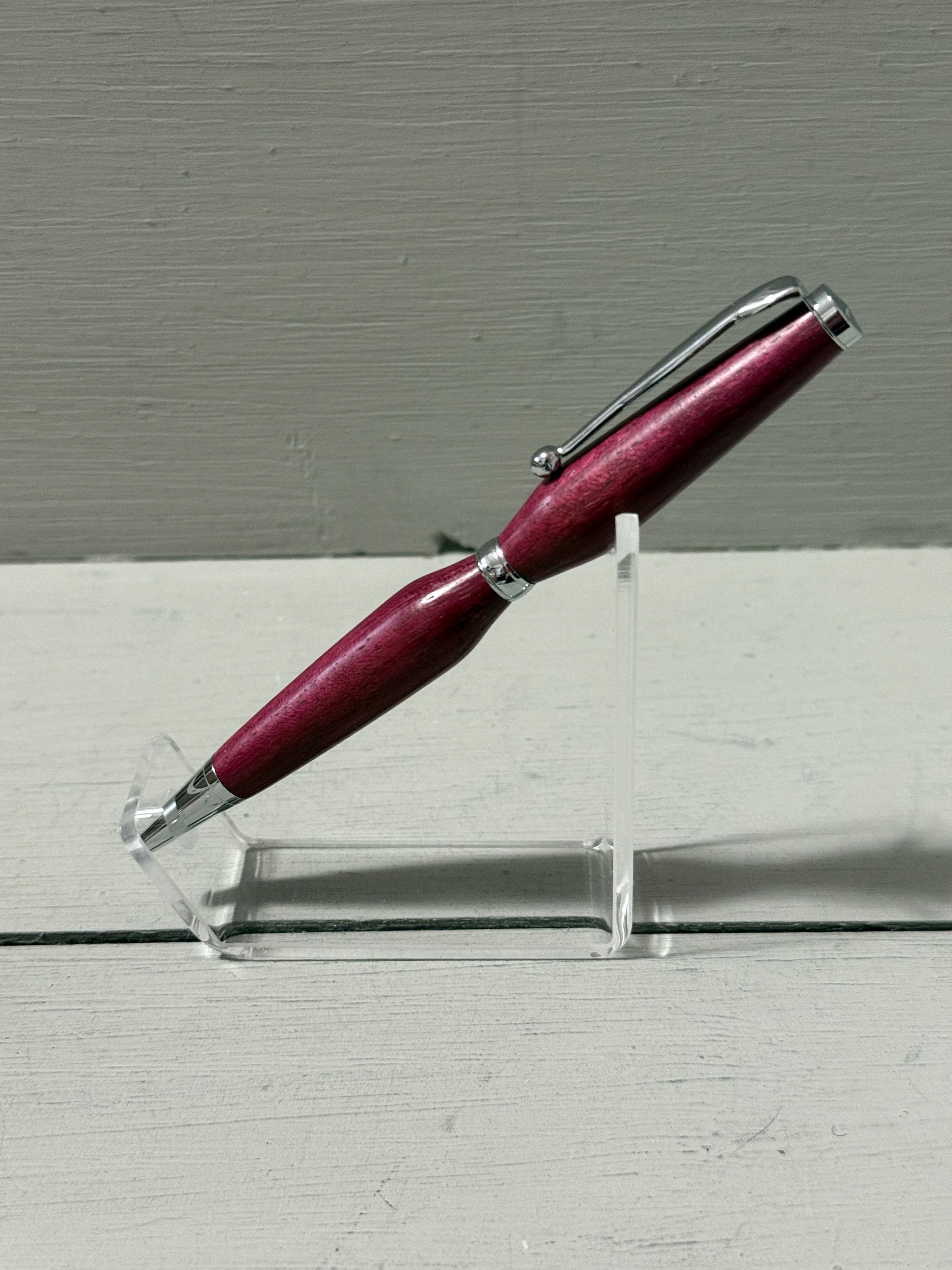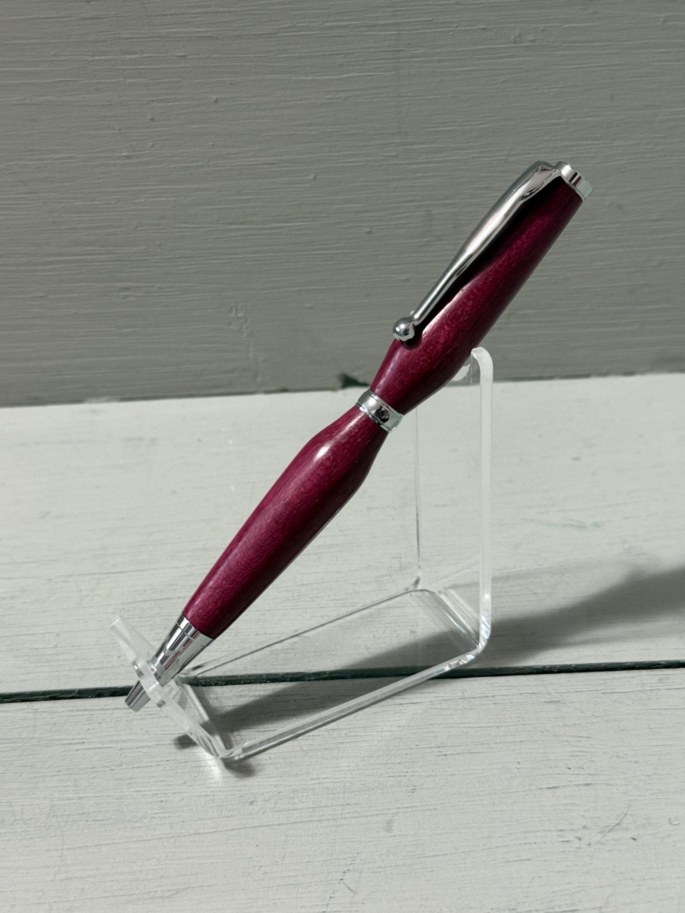 The Shining Purple Heart is a slim-style pen made of a purpleheart wood, and finished in shiny chrome trim. This pen is turned in a traditional slimline style but is anything but a traditional pen. Paired perfectly with beautiful chrome trim, this pen is ready for you to enjoy.