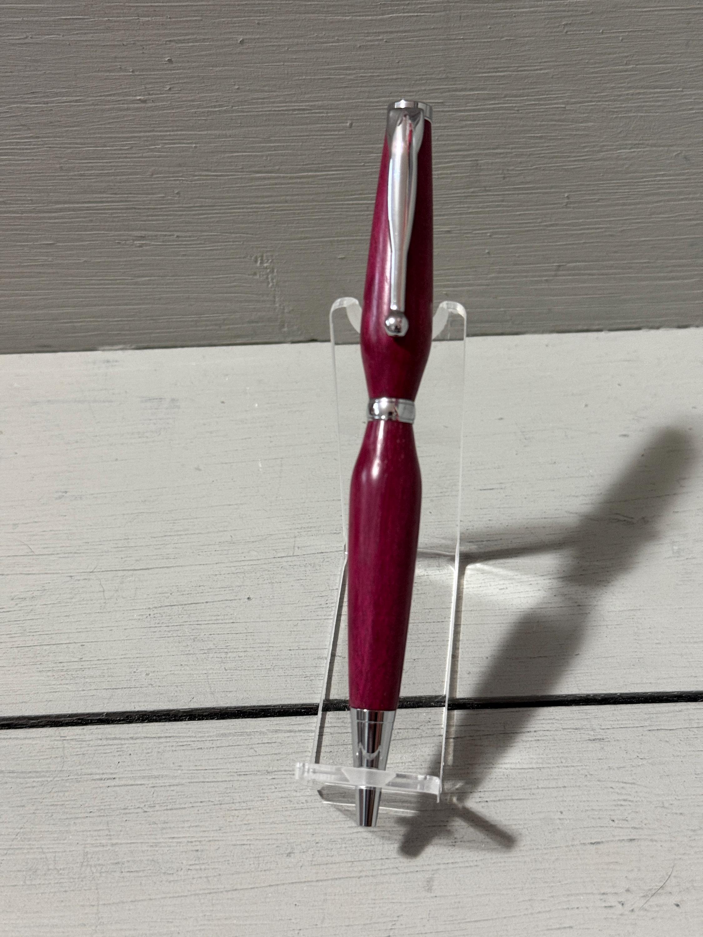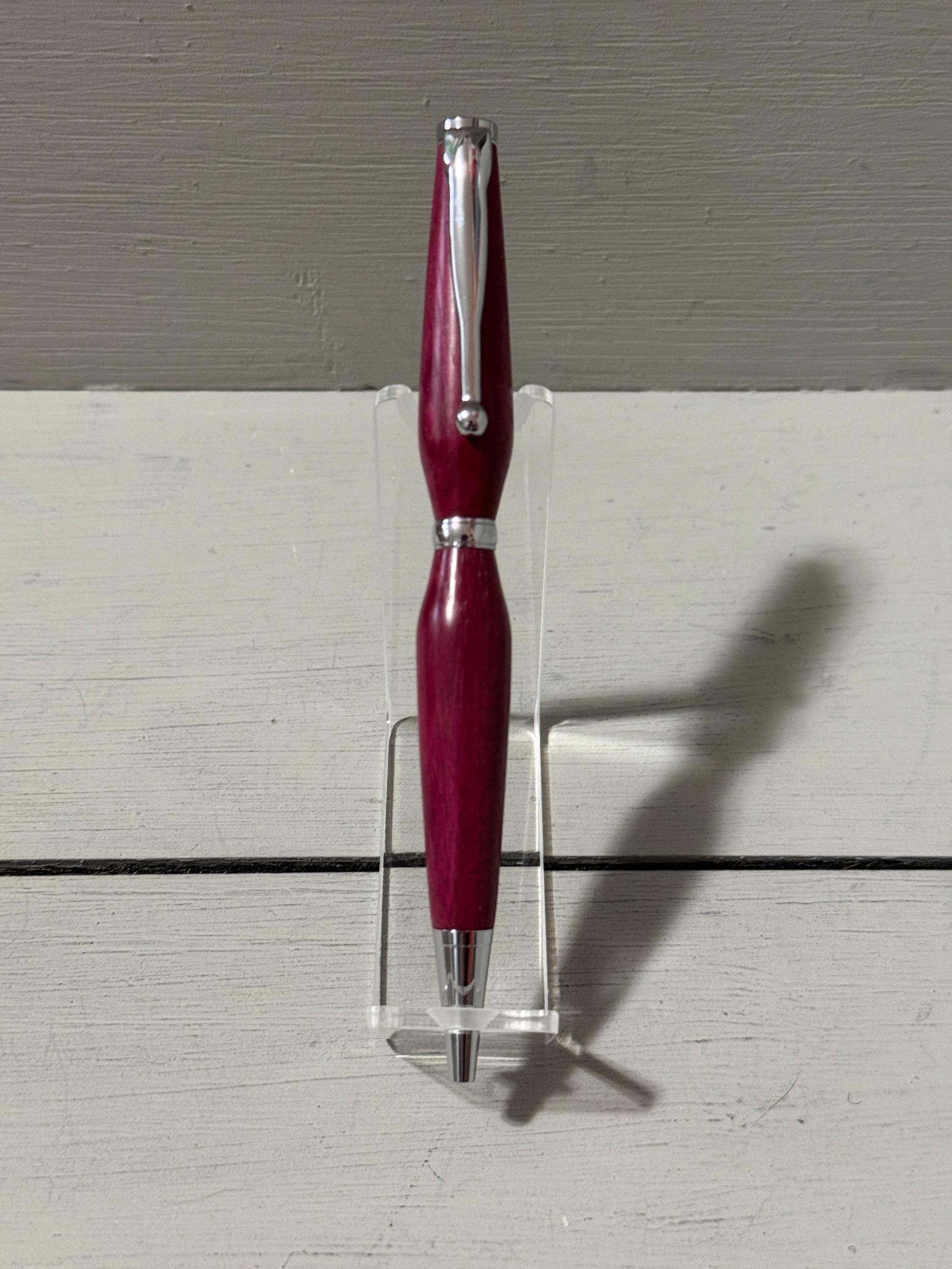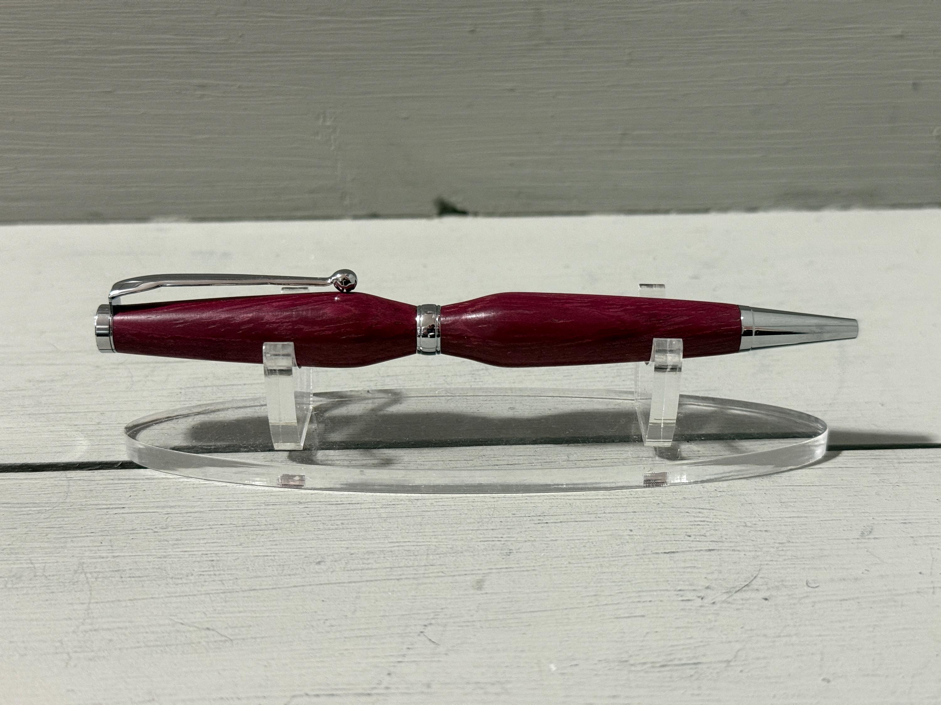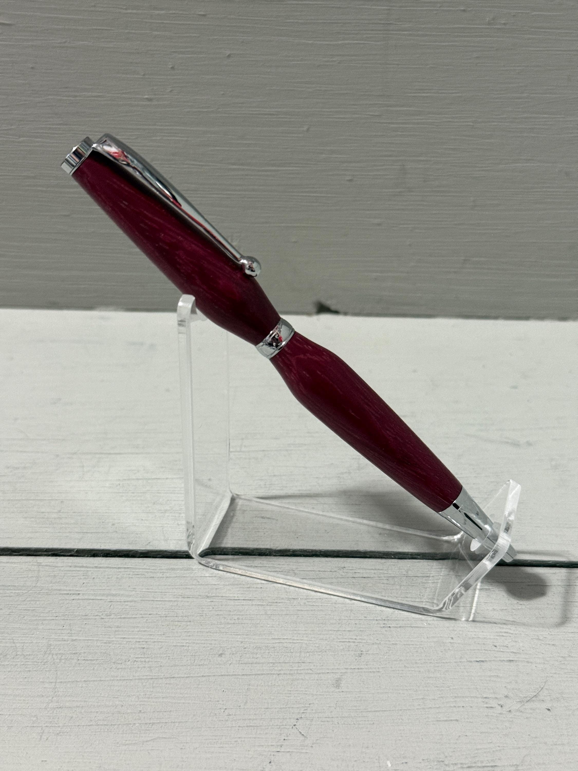 The Shining Purple Heart is a slim-style pen made of a purpleheart wood, and finished in shiny chrome trim. This pen is turned in a traditional slimline style but is anything but a traditional pen. Paired perfectly with beautiful chrome trim, this pen is ready for you to enjoy.