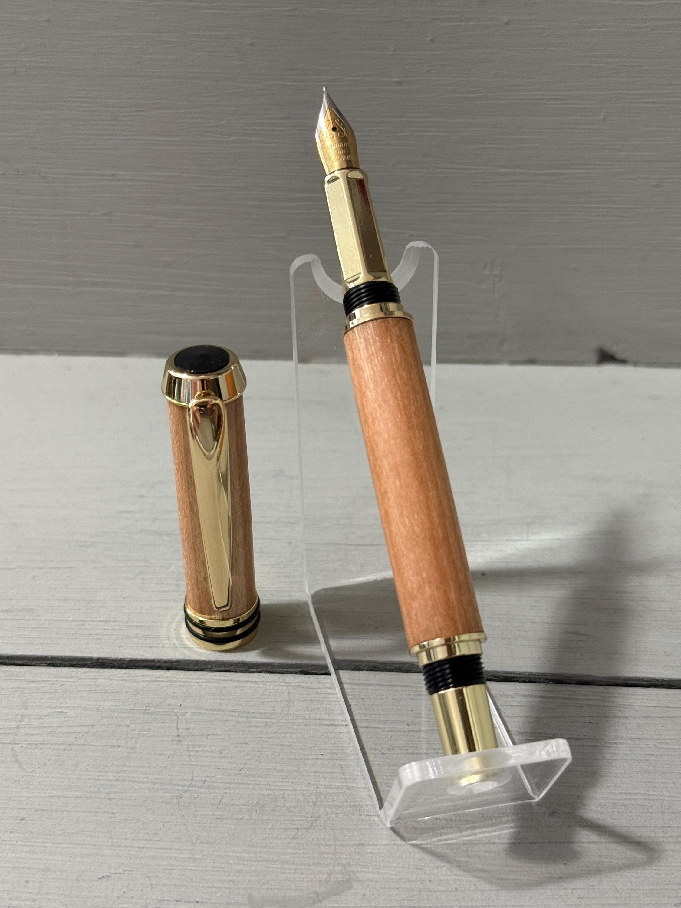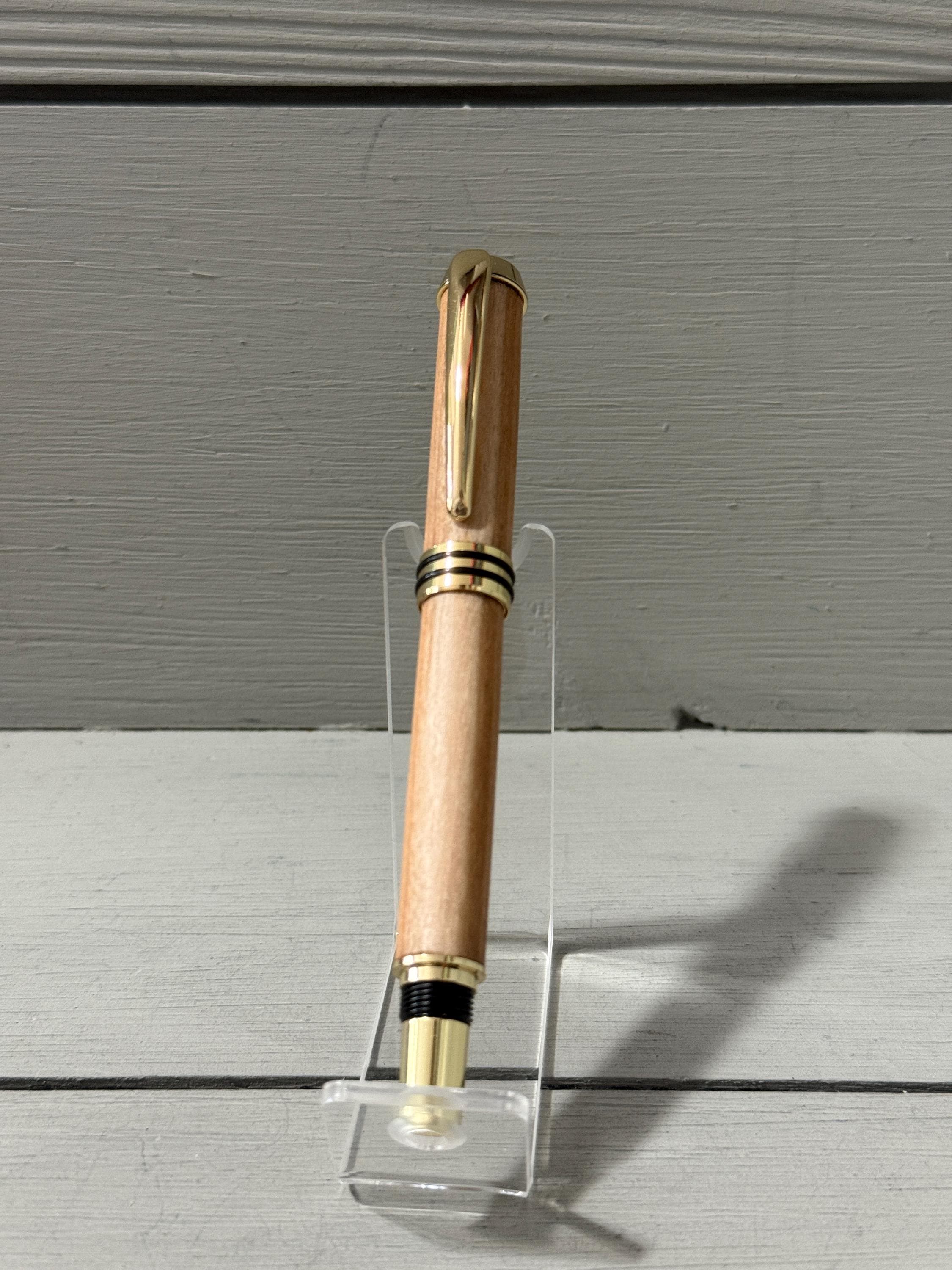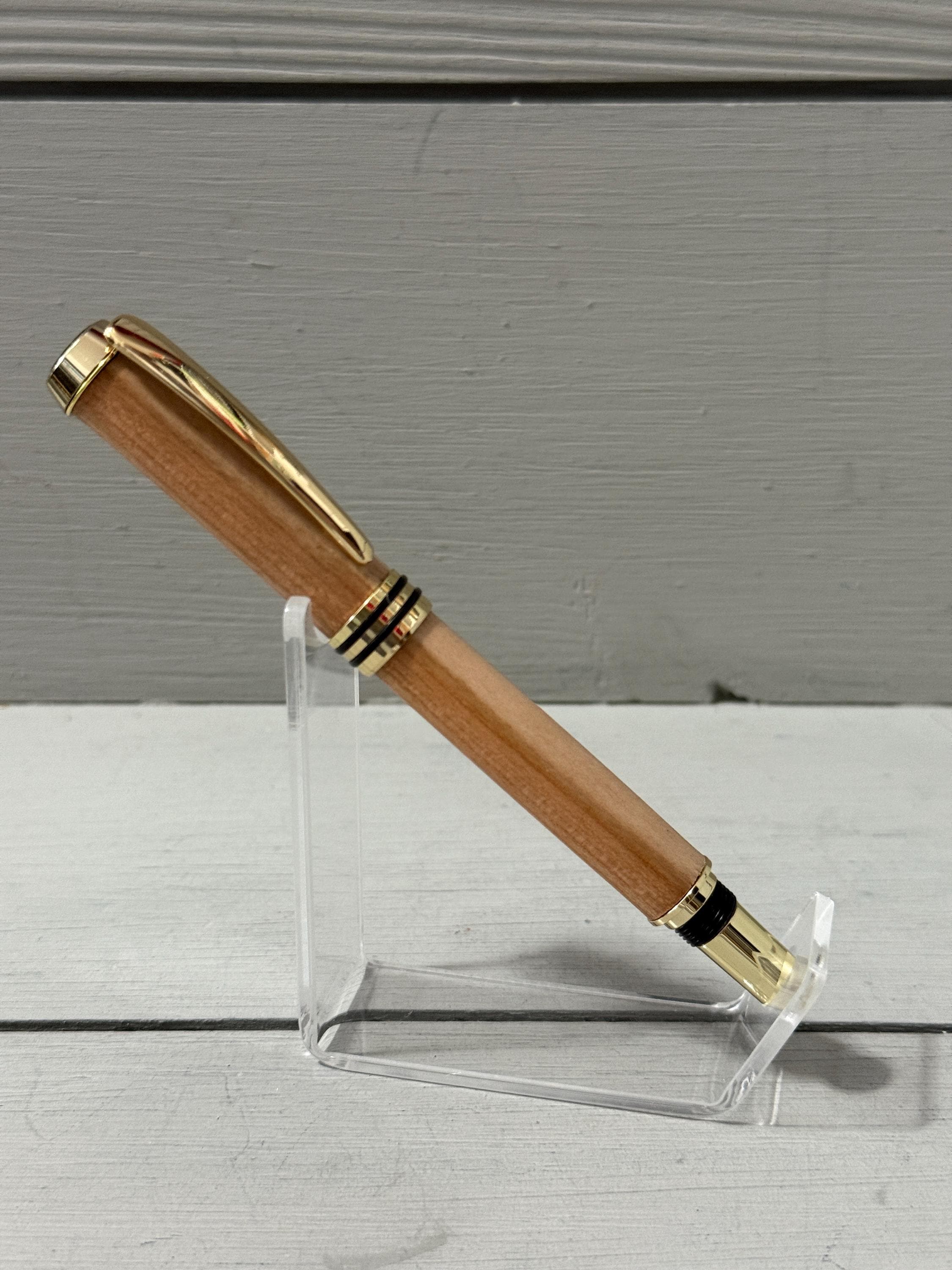 Elevate your writing experience with the Cherry Tycoon II, a stunning handcrafted fountain pen made from rich cherry wood. Its elegant gold and black trim harmonizes beautifully with the wood’s natural tones, smooth finish, and subtle grain patterns—making it a true standout piece.