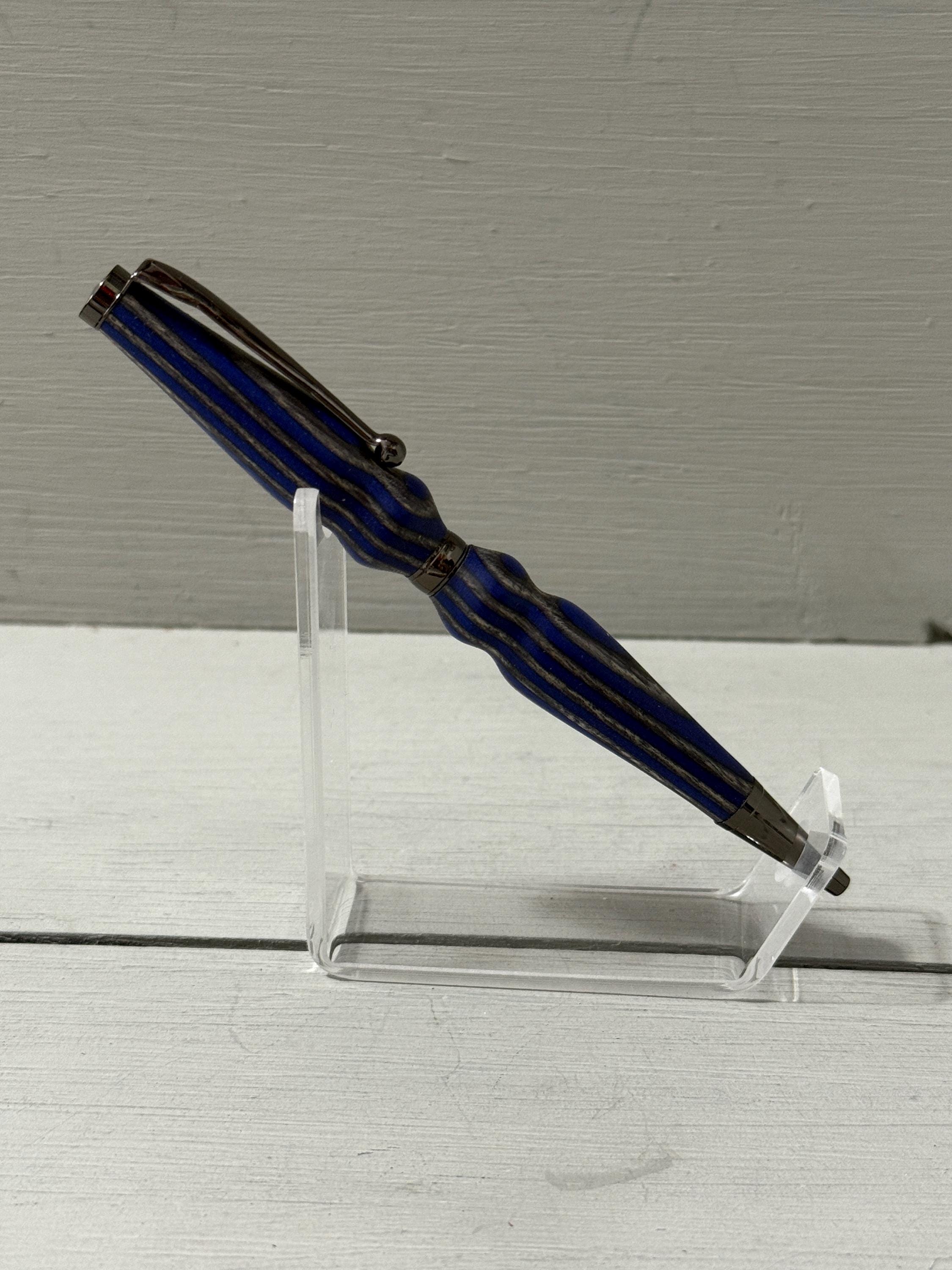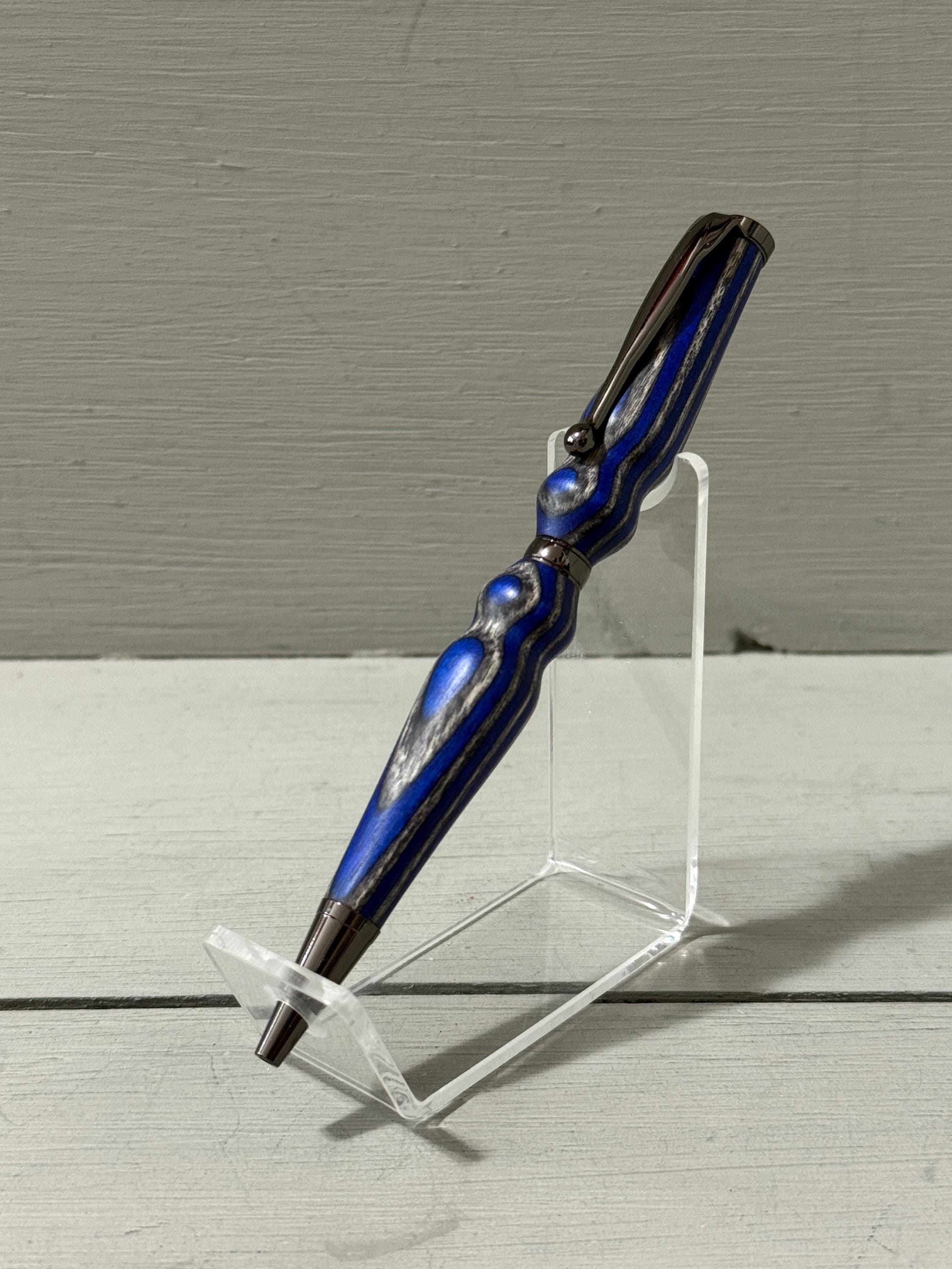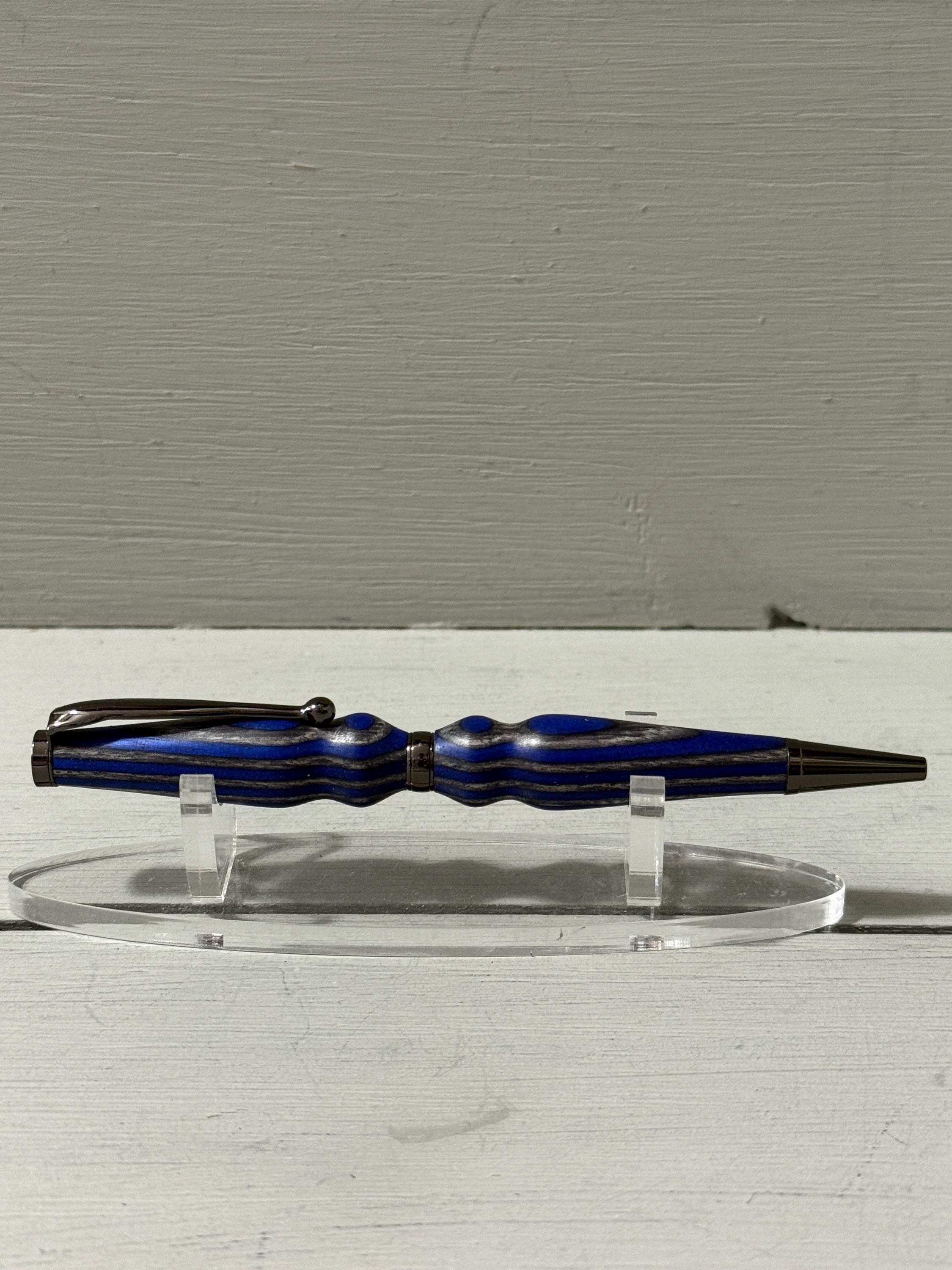 Handcrafted with care and a touch of flair, Serenity is a slim-style pen made from navy blue and gray composite wood (Spectraply) and finished with sleek gunmetal trim. Turned from the Blue Angel Spectraply blank, this pen showcases a dynamic blend of color and texture—no two are ever alike.