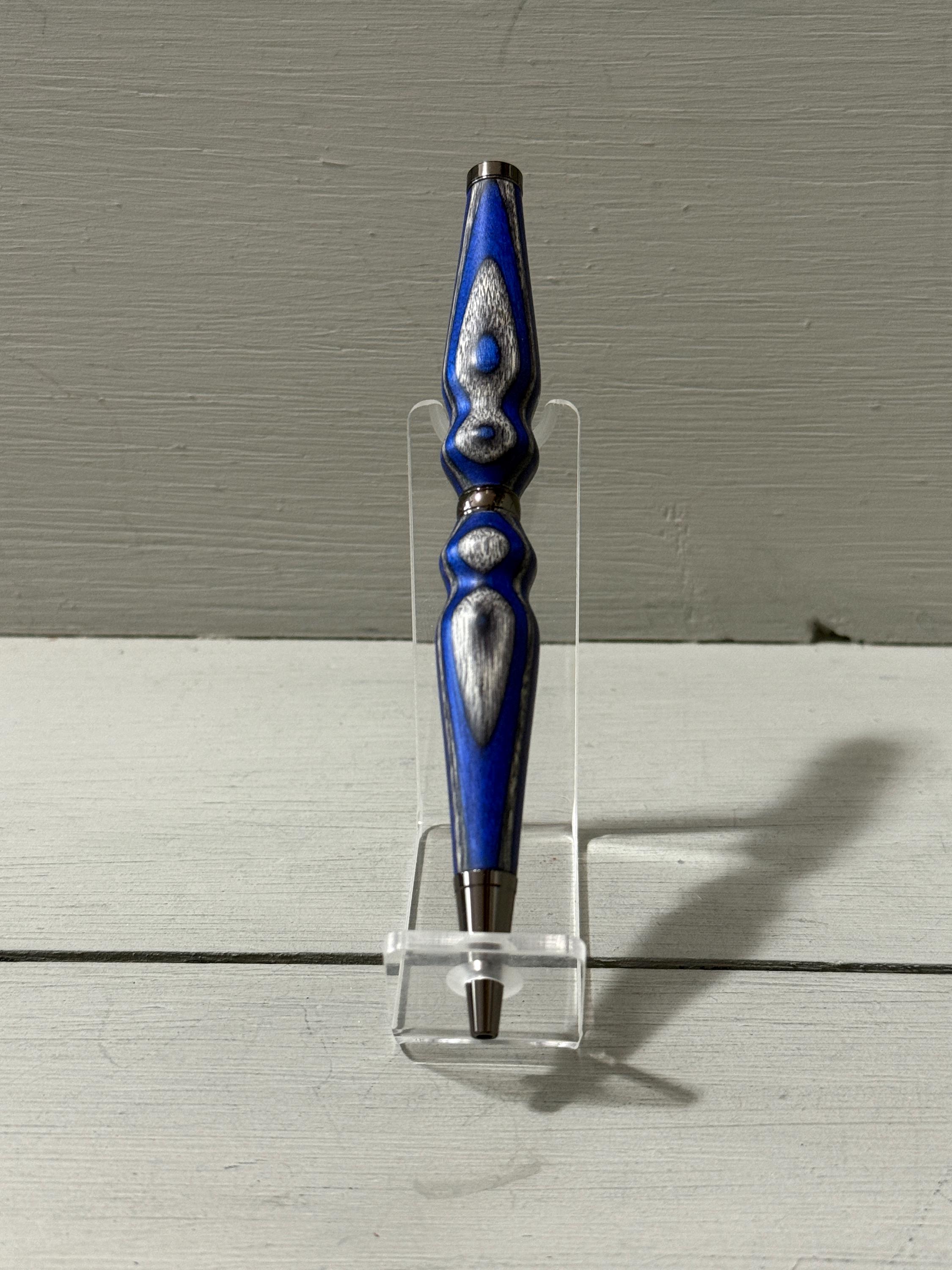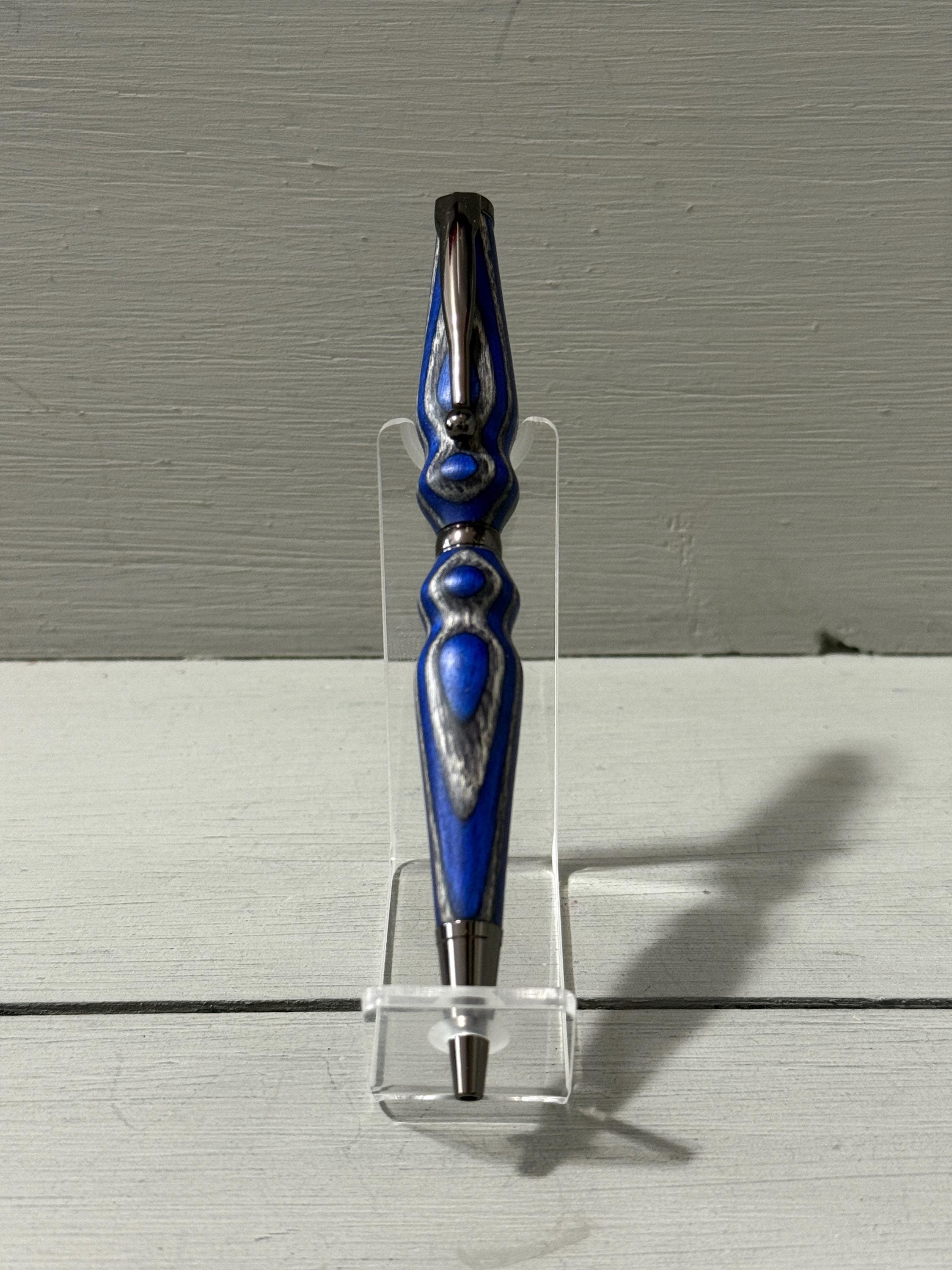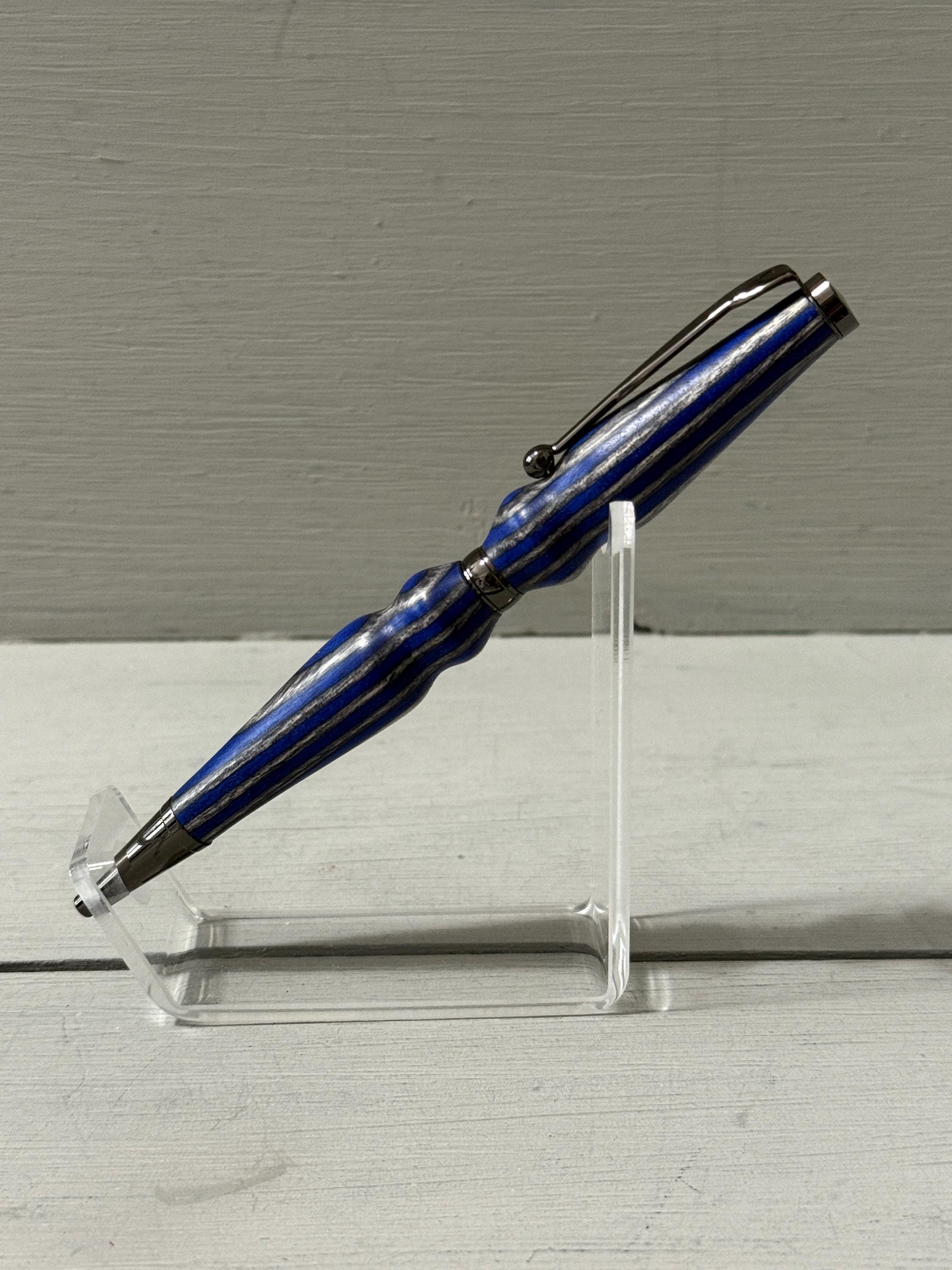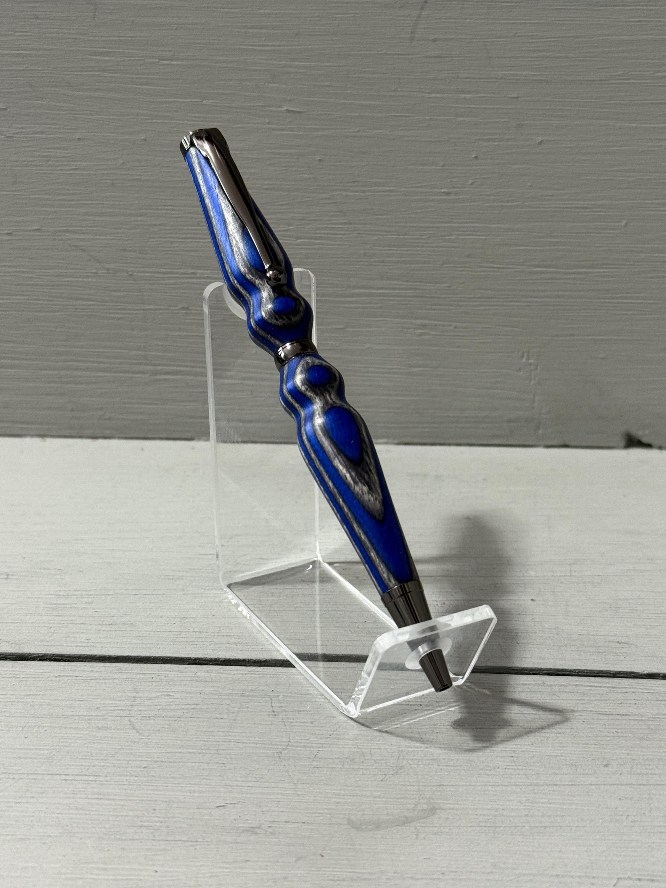 Handcrafted with care and a touch of flair, Serenity is a slim-style pen made from navy blue and gray composite wood (Spectraply) and finished with sleek gunmetal trim. Turned from the Blue Angel Spectraply blank, this pen showcases a dynamic blend of color and texture—no two are ever alike.