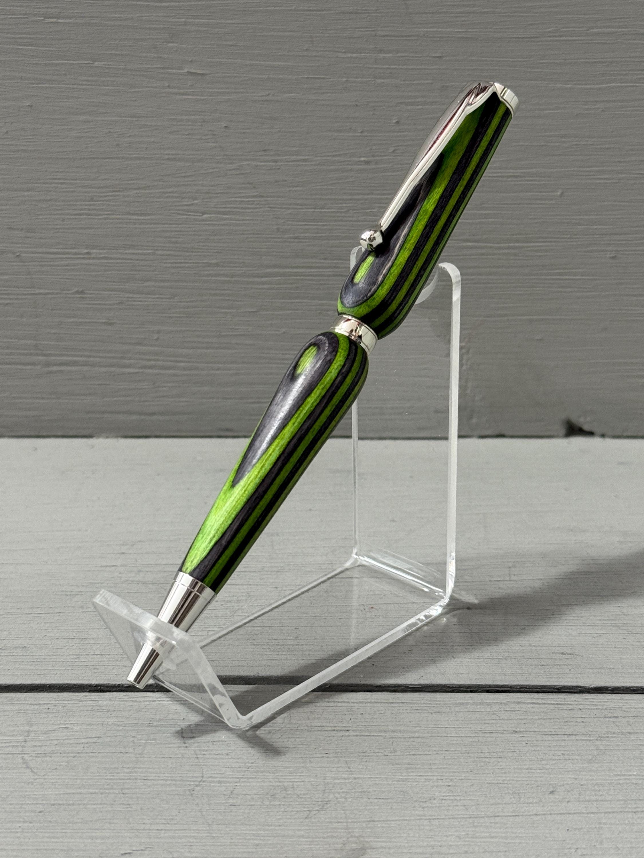 Simple in shape, striking in style—Nature is a handcrafted slimline pen made from vibrant green Spectraply and finished with gleaming chrome trim. Though turned in a traditional slim-style silhouette, this pen is anything but ordinary.