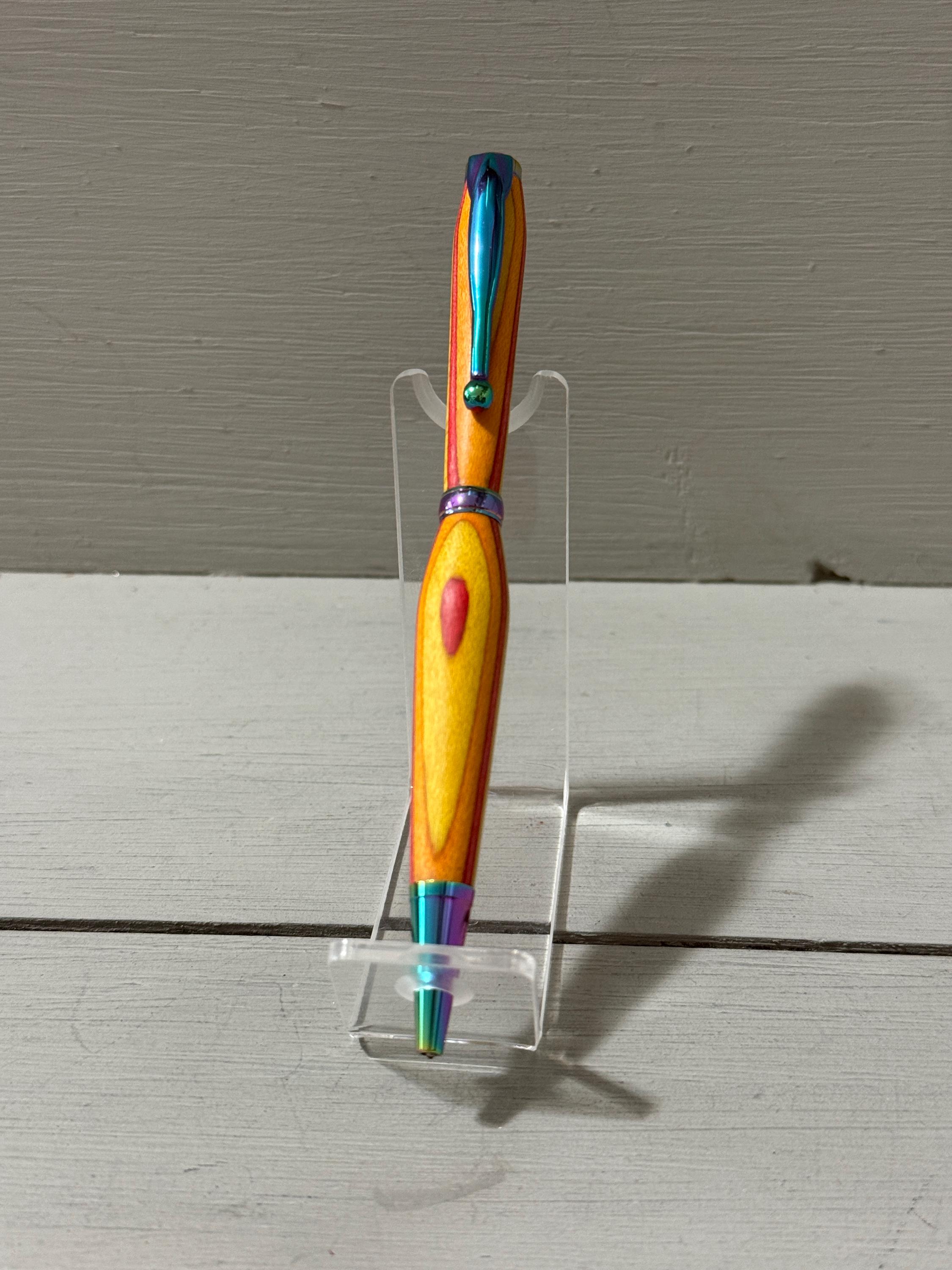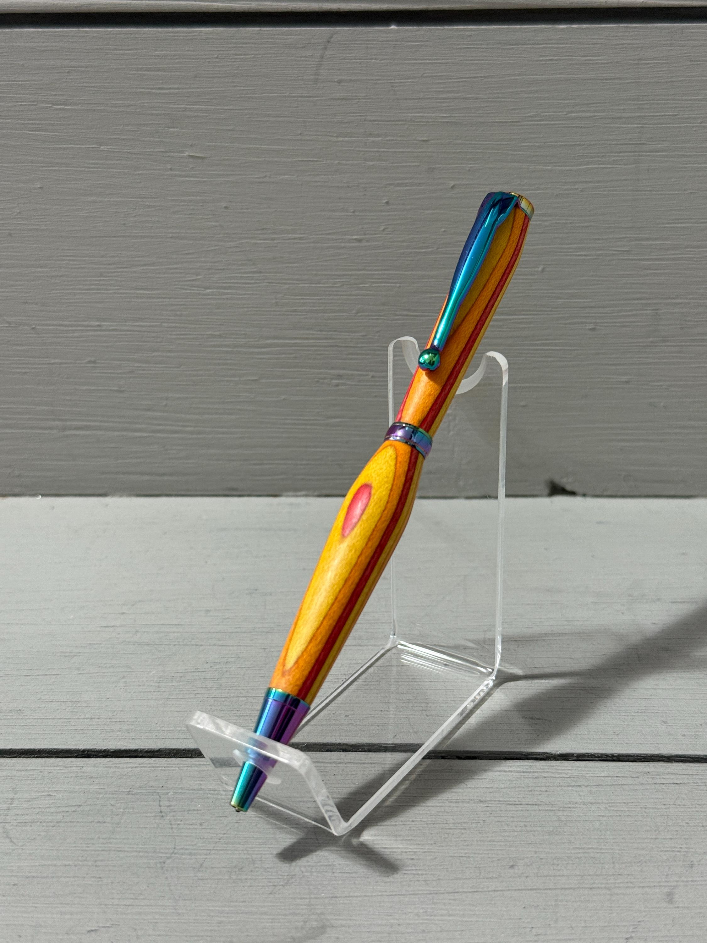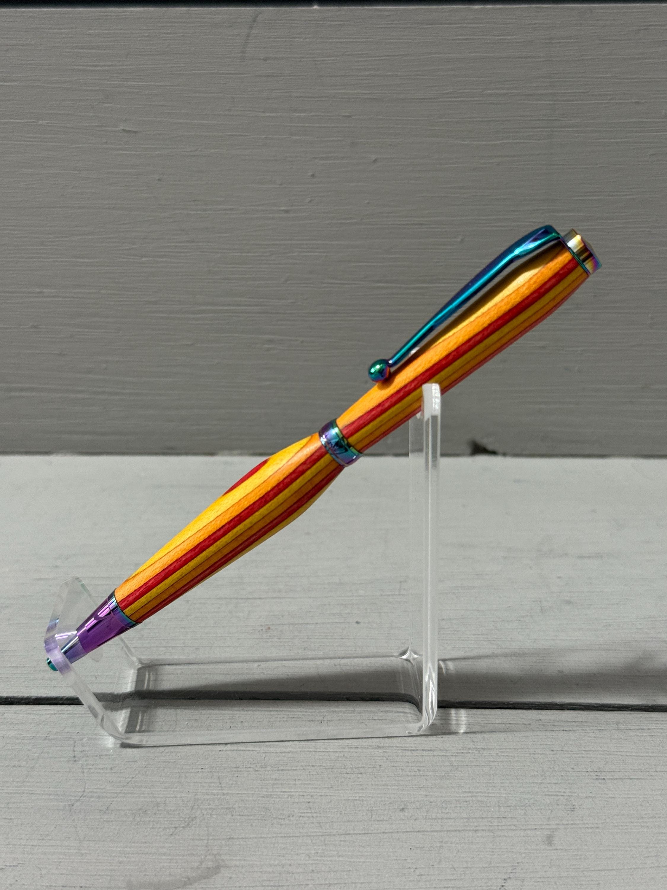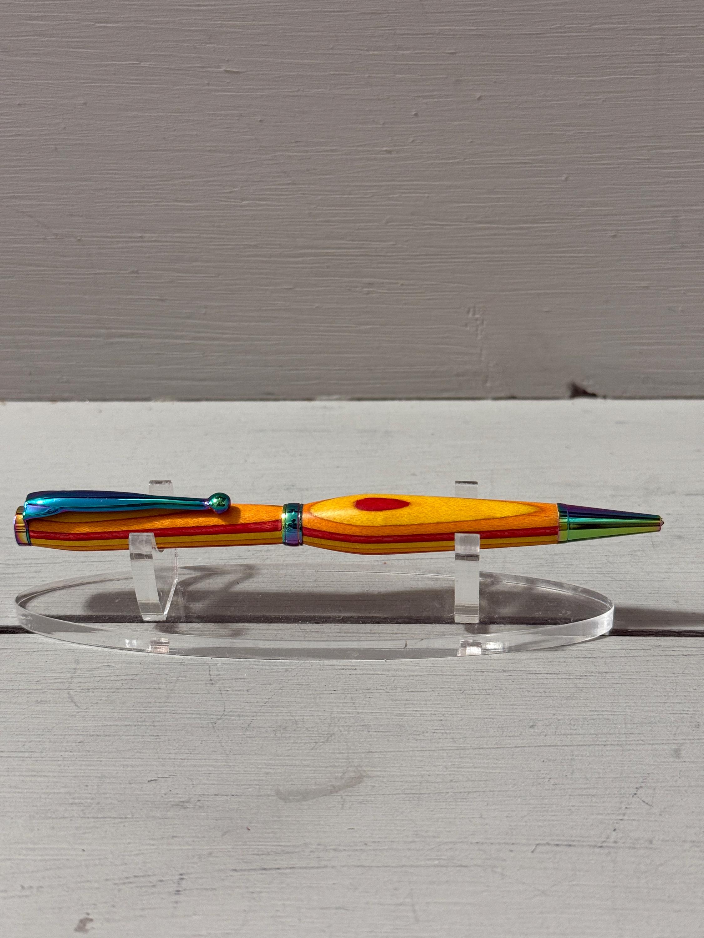 Radiant and full of warmth—Sunset is a handcrafted slim-style pen made from vibrant orange, yellow, and red Spectraply composite wood. Finished with satin gold trim, this pen captures the glow of a golden hour and brings a touch of brilliance to everyday writing.