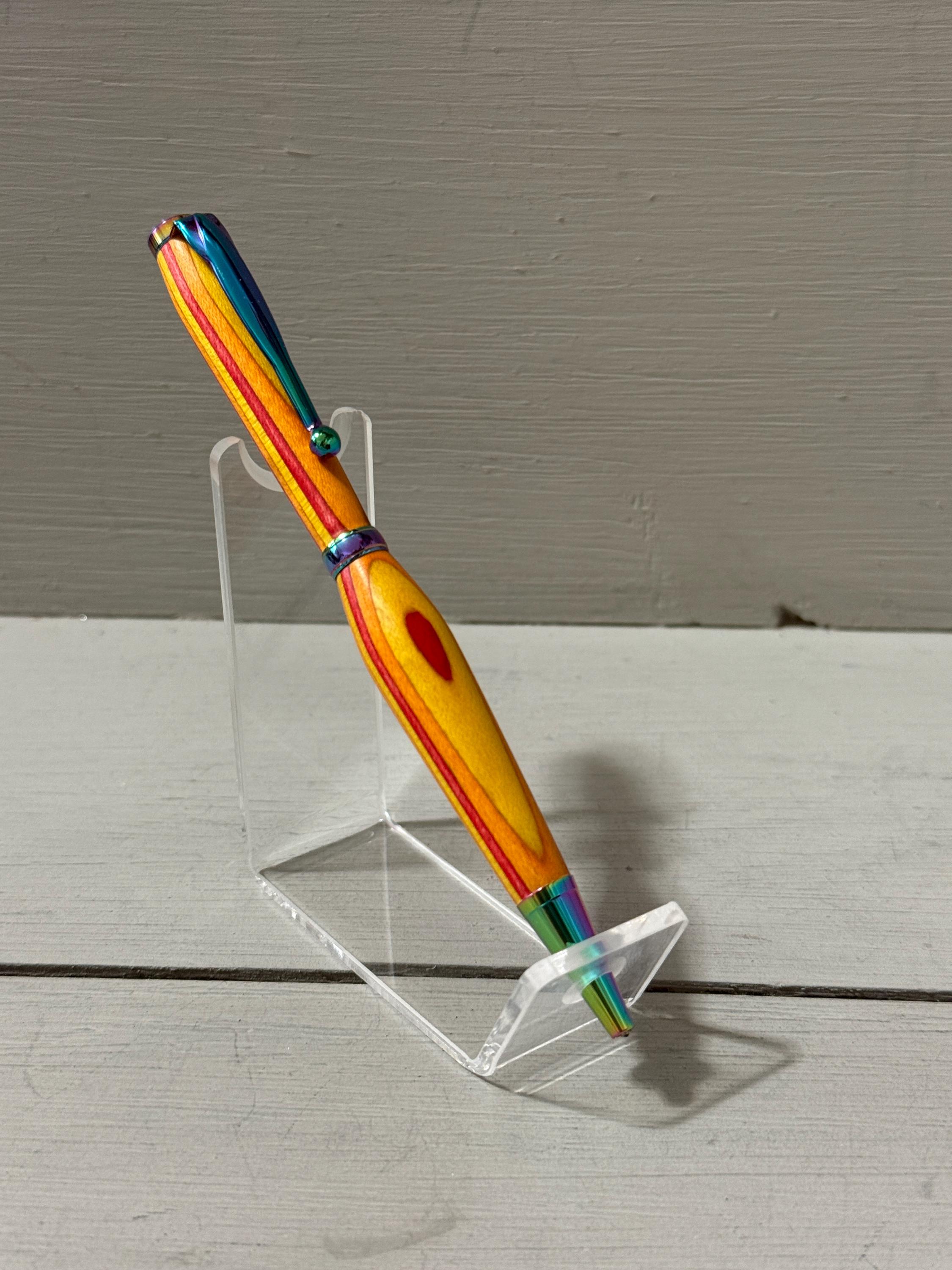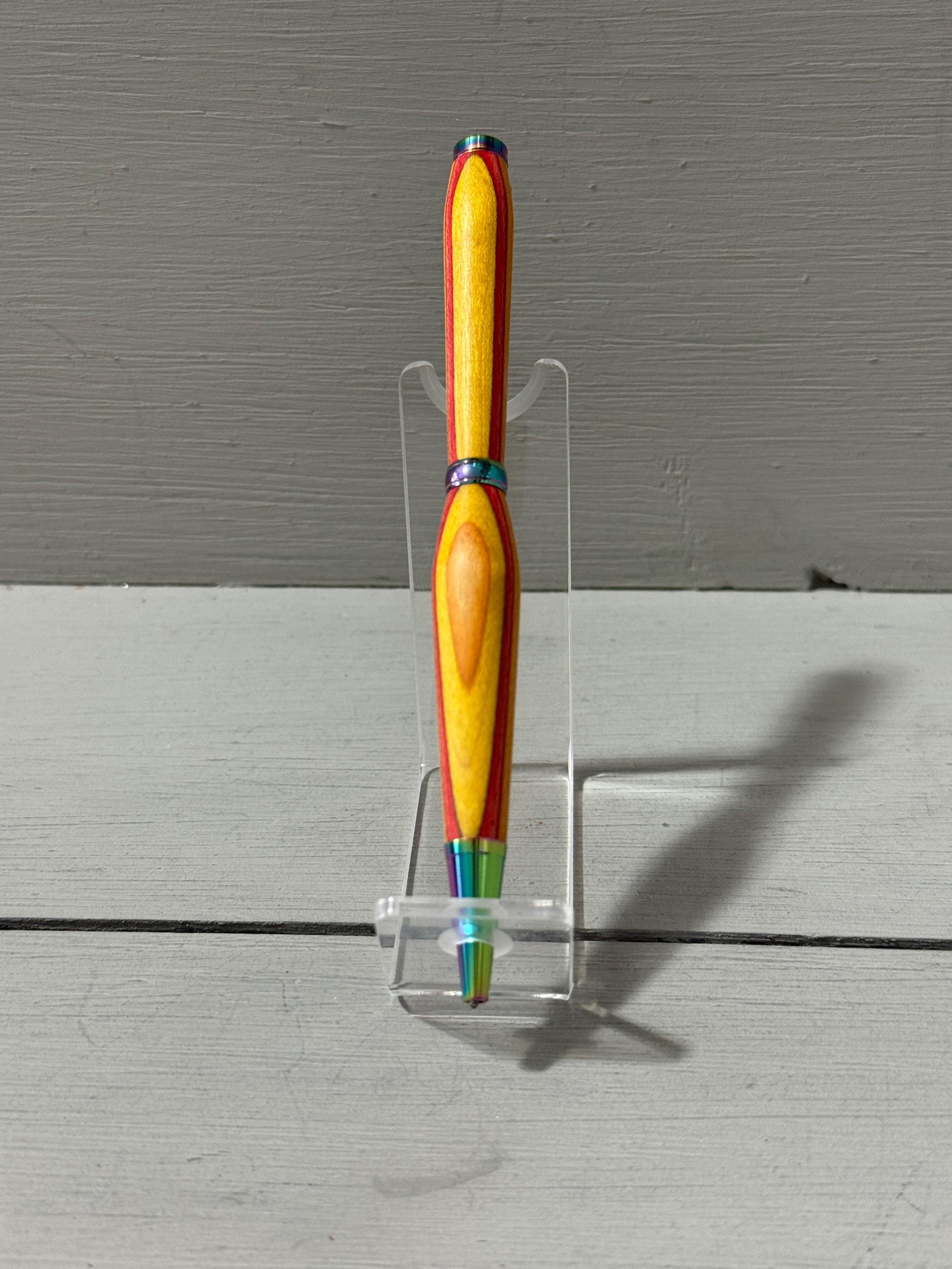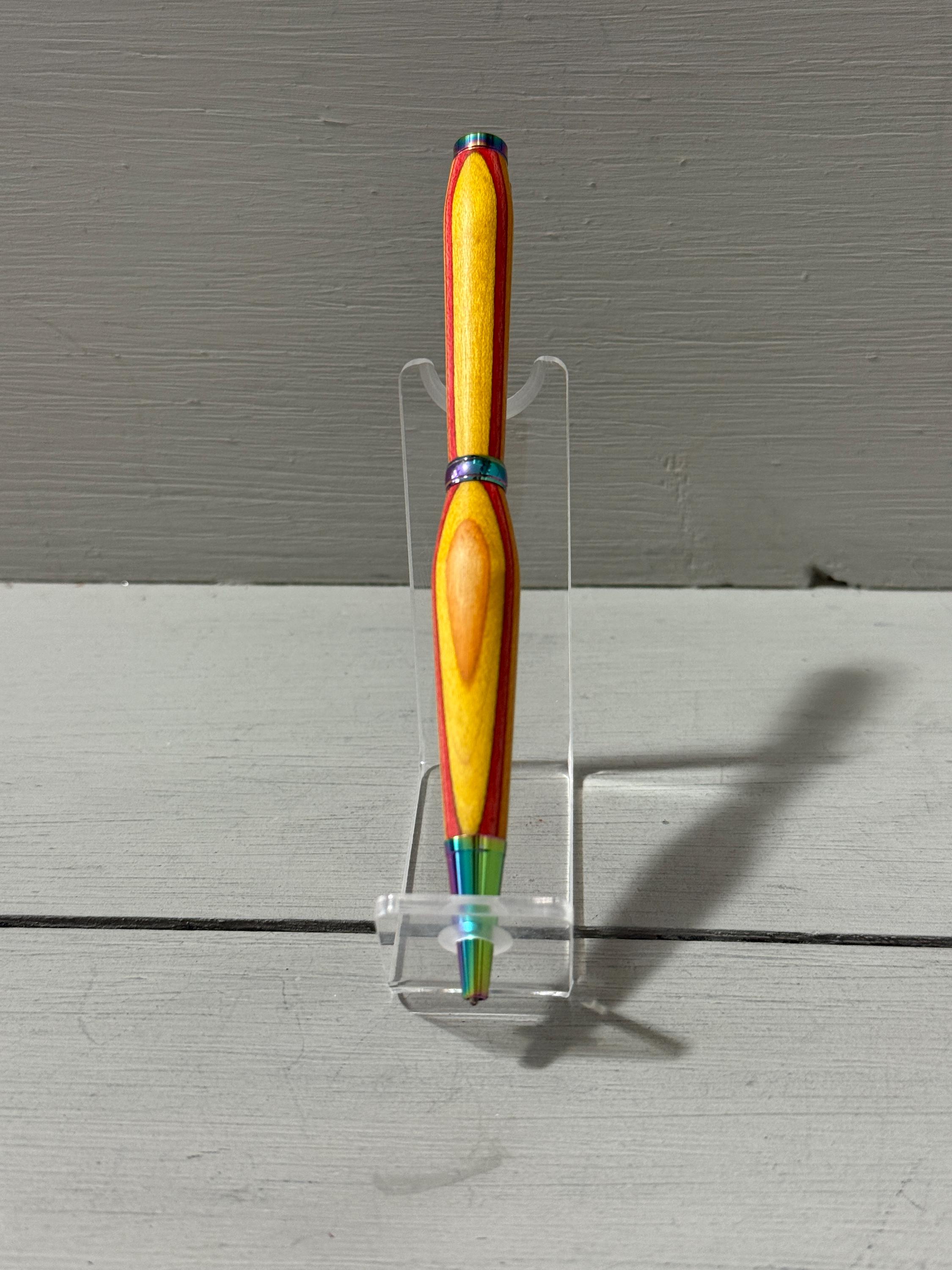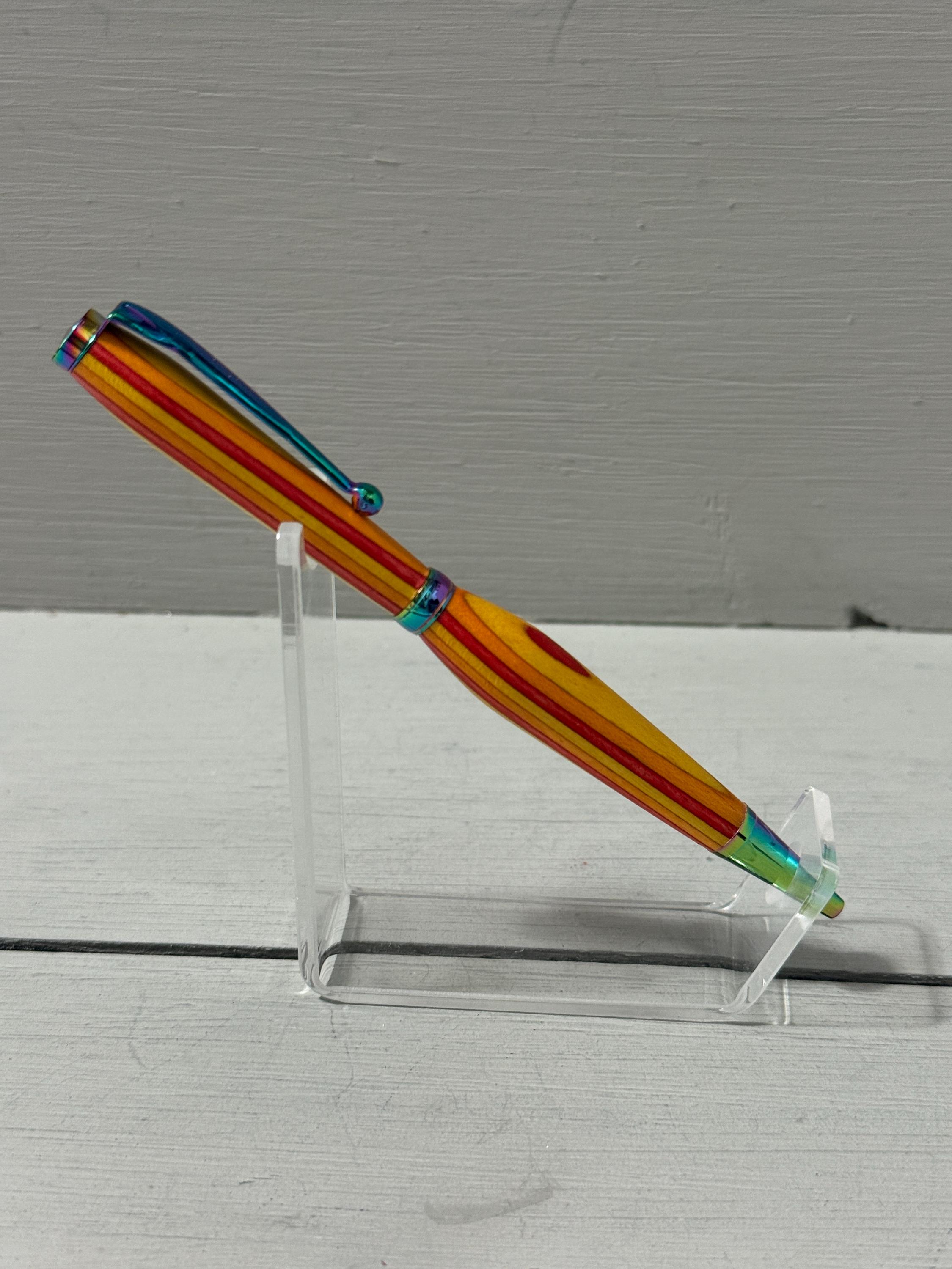 Radiant and full of warmth—Sunset is a handcrafted slim-style pen made from vibrant orange, yellow, and red Spectraply composite wood. Finished with satin gold trim, this pen captures the glow of a golden hour and brings a touch of brilliance to everyday writing.