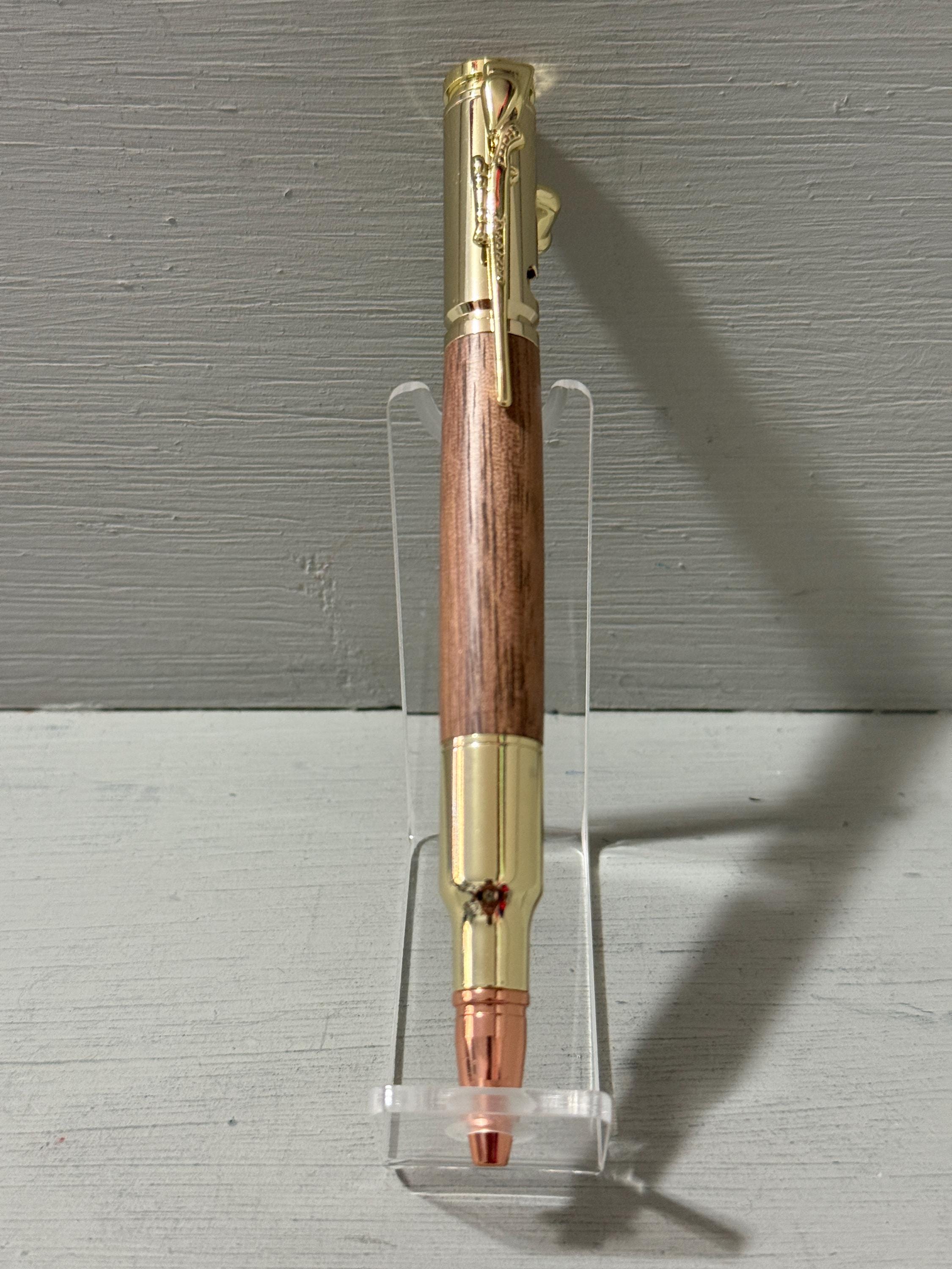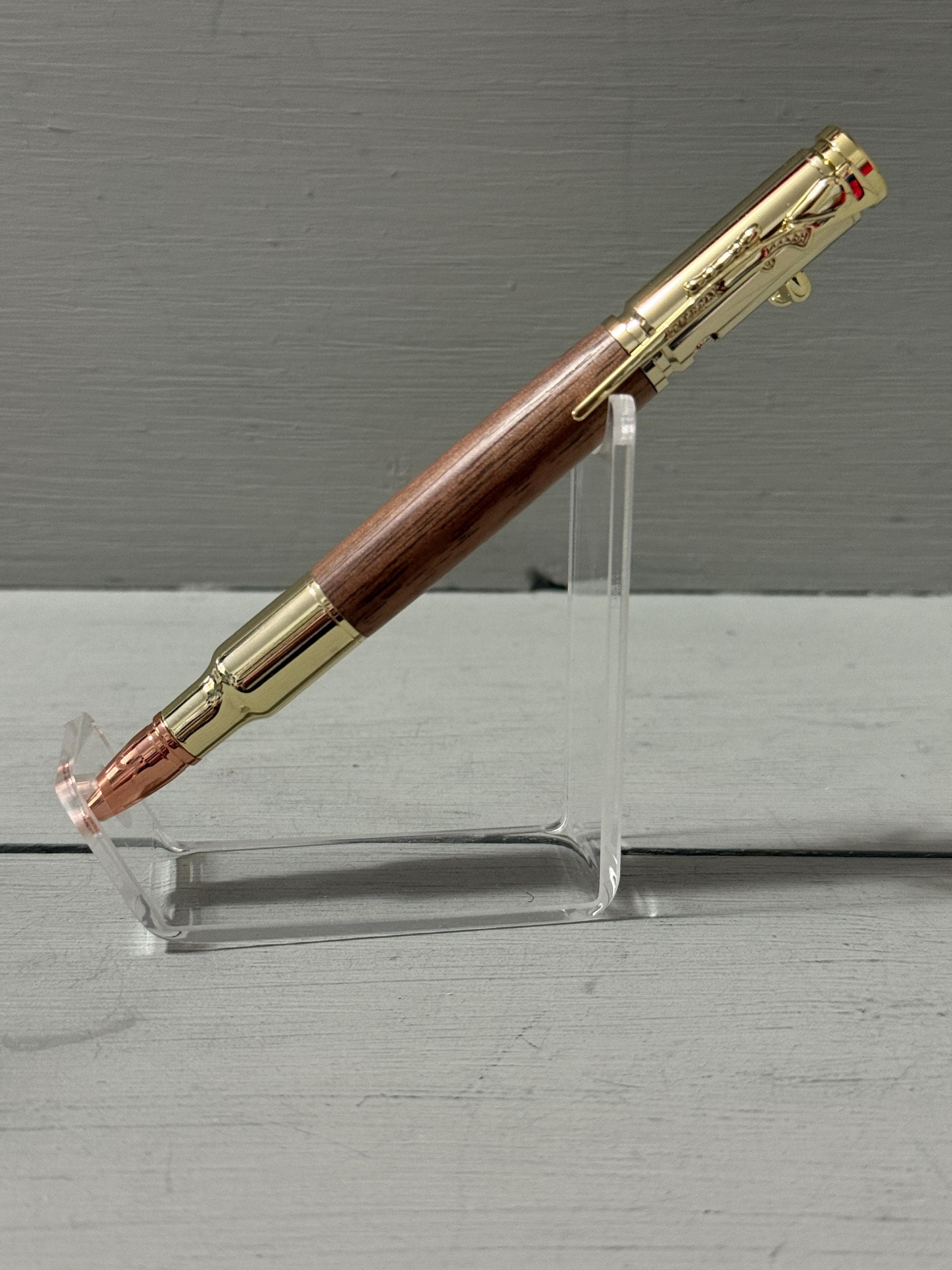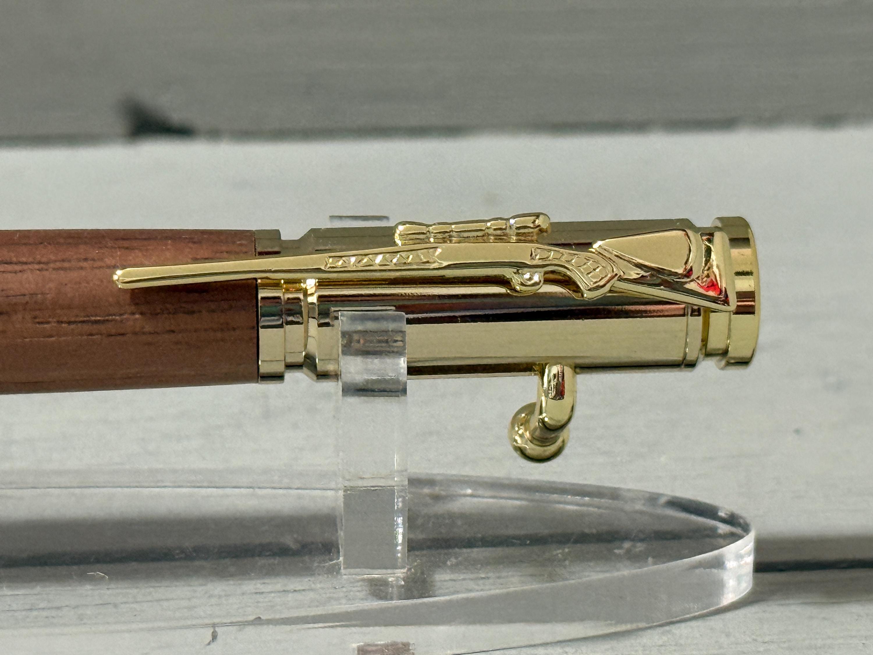 The NC WALNUT BULLET is a completely original and irresistibly fun Bolt Action pen that is perfect for any hunting or target-shooting enthusiast. Every detail, from the one of a kind bolt action mechanism to the precision engineered components, was carefully designed to ensure uniqueness and reliability. The realistic bolt-action handle smoothly advances and retracts to securely lock the refill in place. Includes a bolt action rifle clip and a replica 30 caliber cartridge and rose gold bullet tip for added authenticity. The unique NC Walnut body adds the perfect finish to this most exquisite pen!