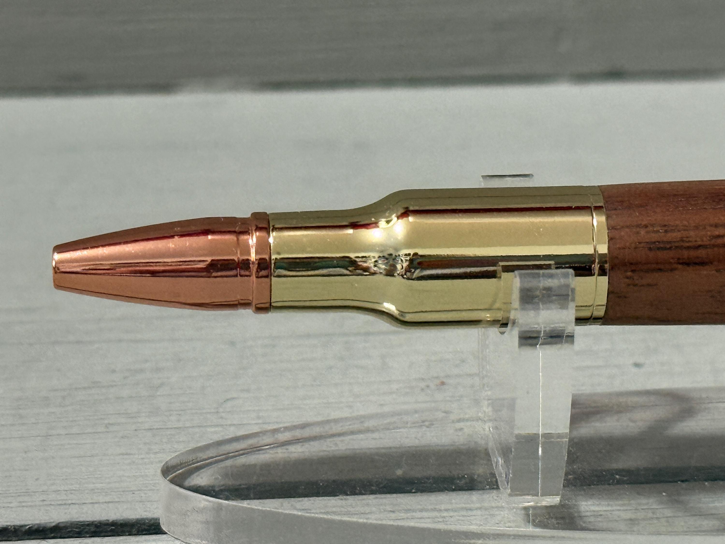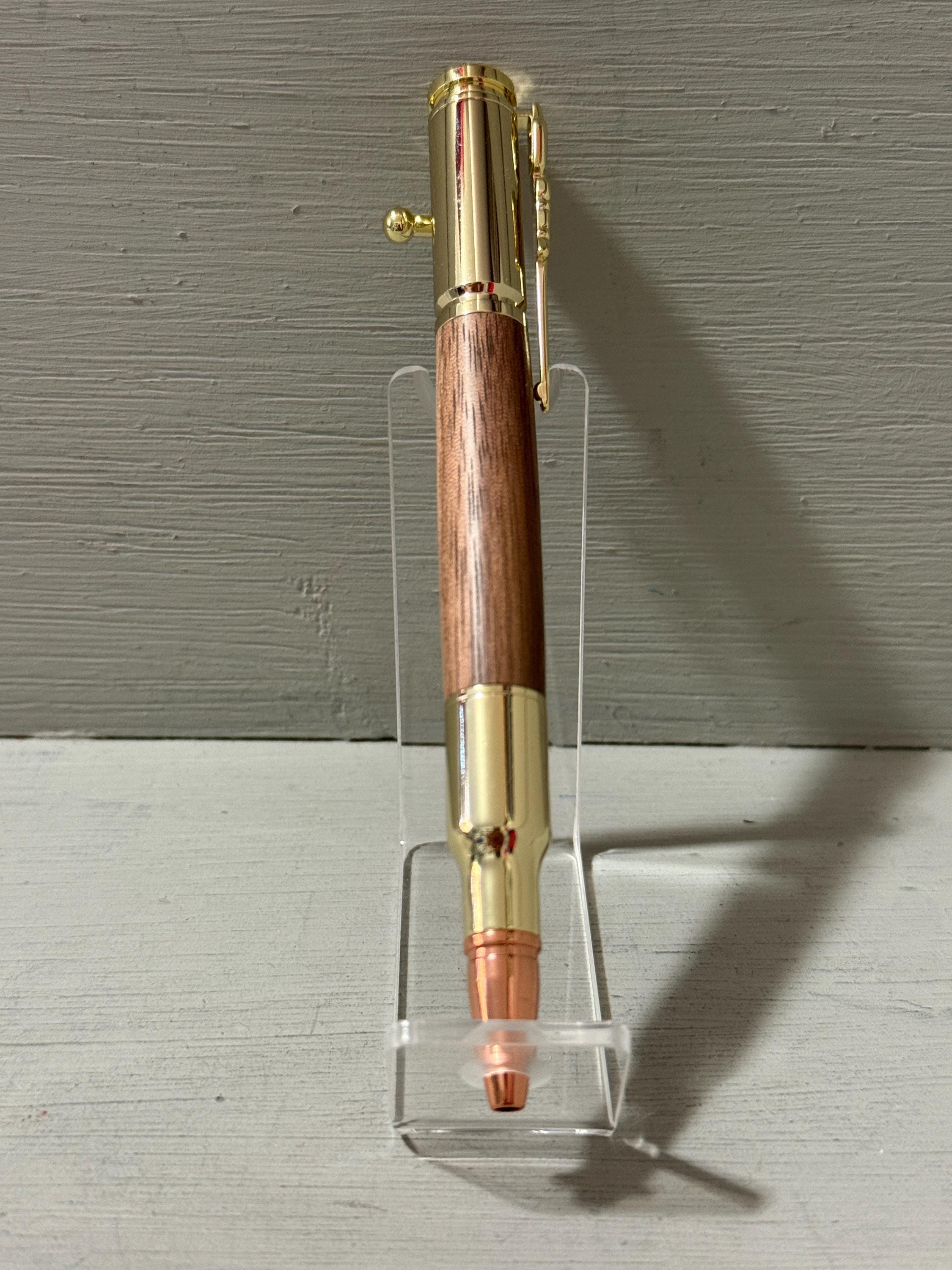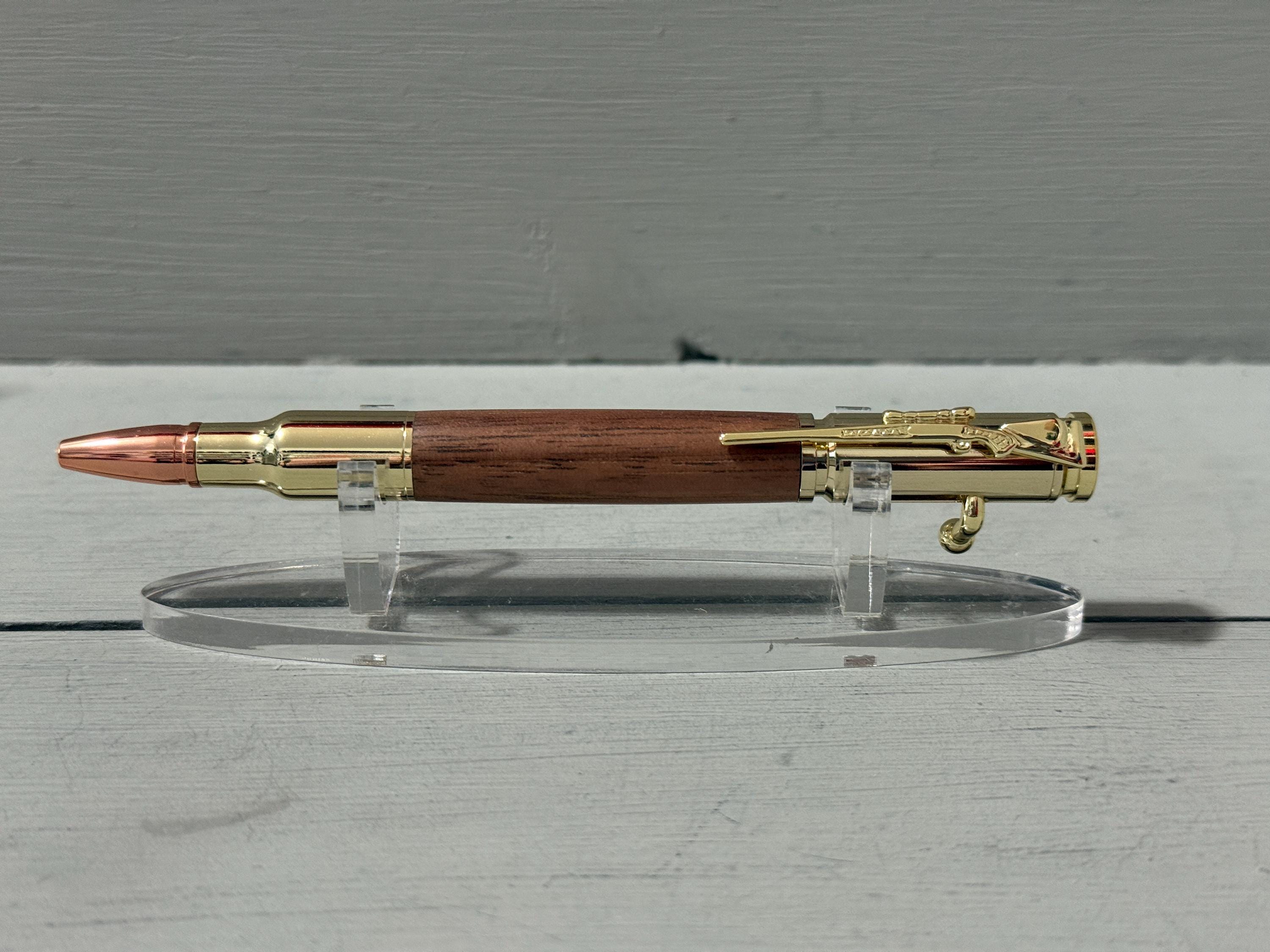 The NC WALNUT BULLET is a completely original and irresistibly fun Bolt Action pen that is perfect for any hunting or target-shooting enthusiast. Every detail, from the one of a kind bolt action mechanism to the precision engineered components, was carefully designed to ensure uniqueness and reliability. The realistic bolt-action handle smoothly advances and retracts to securely lock the refill in place. Includes a bolt action rifle clip and a replica 30 caliber cartridge and rose gold bullet tip for added authenticity. The unique NC Walnut body adds the perfect finish to this most exquisite pen!
