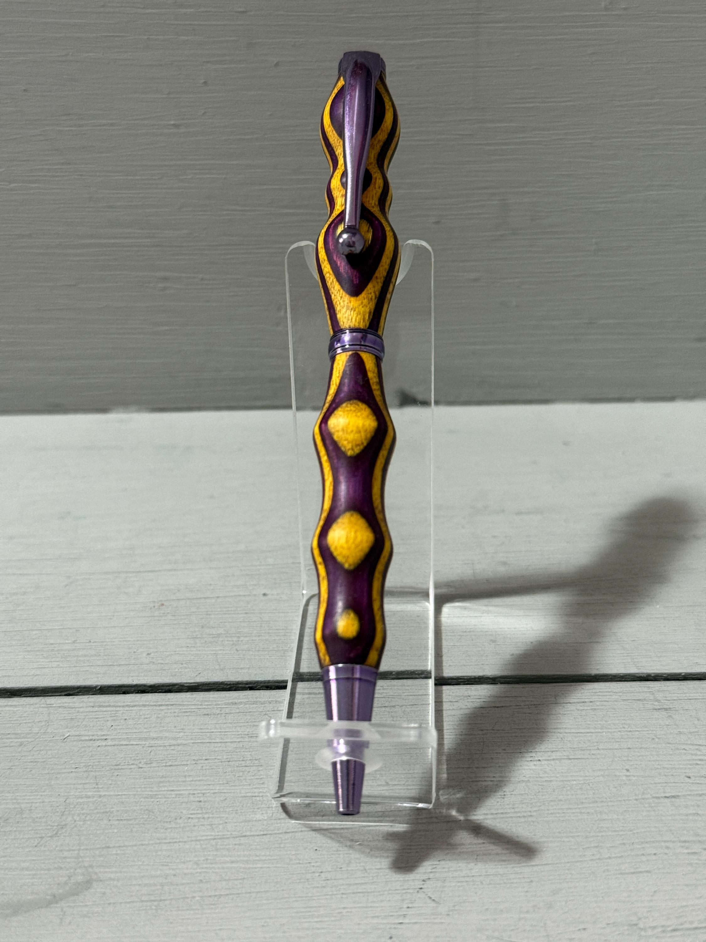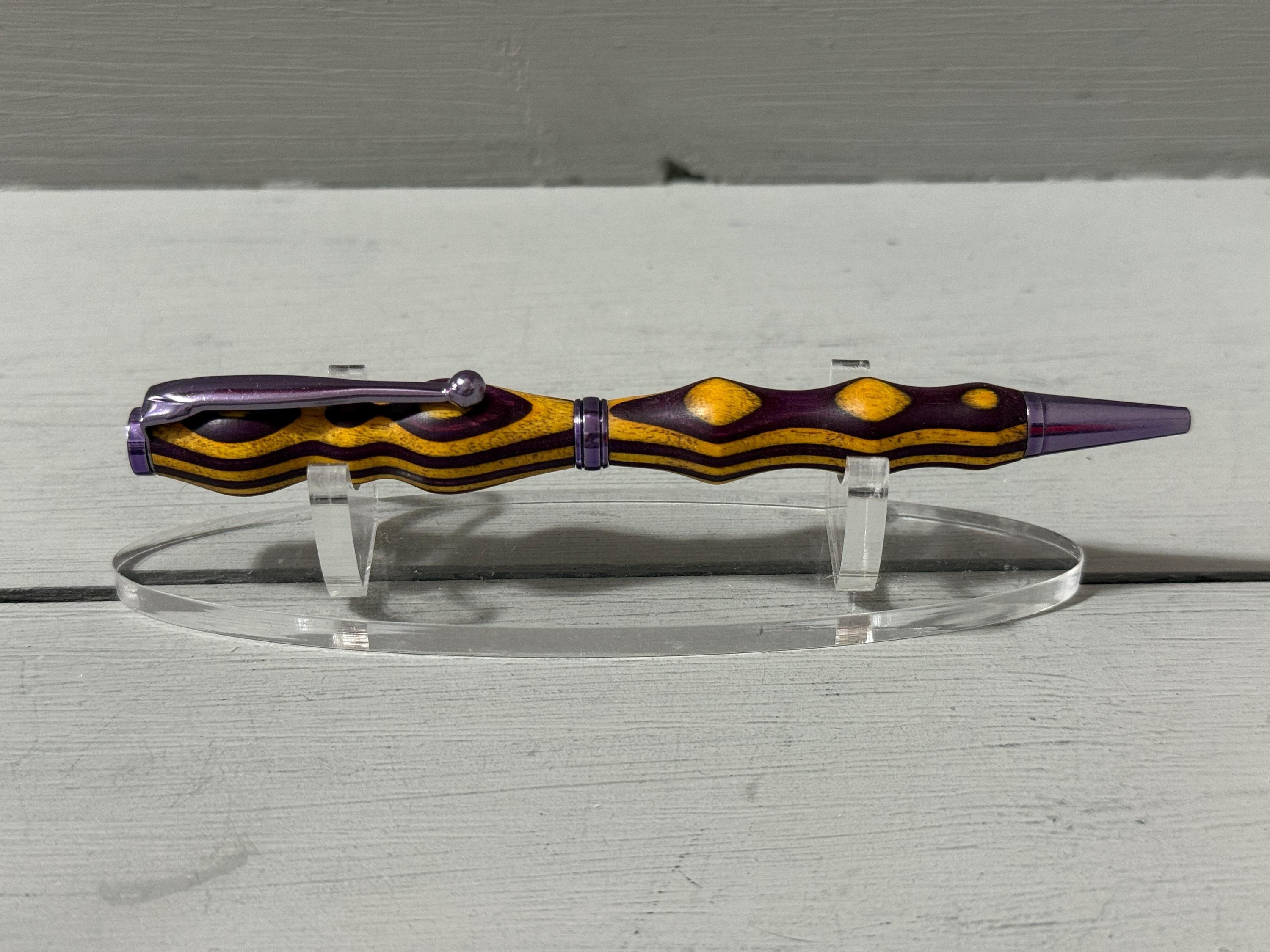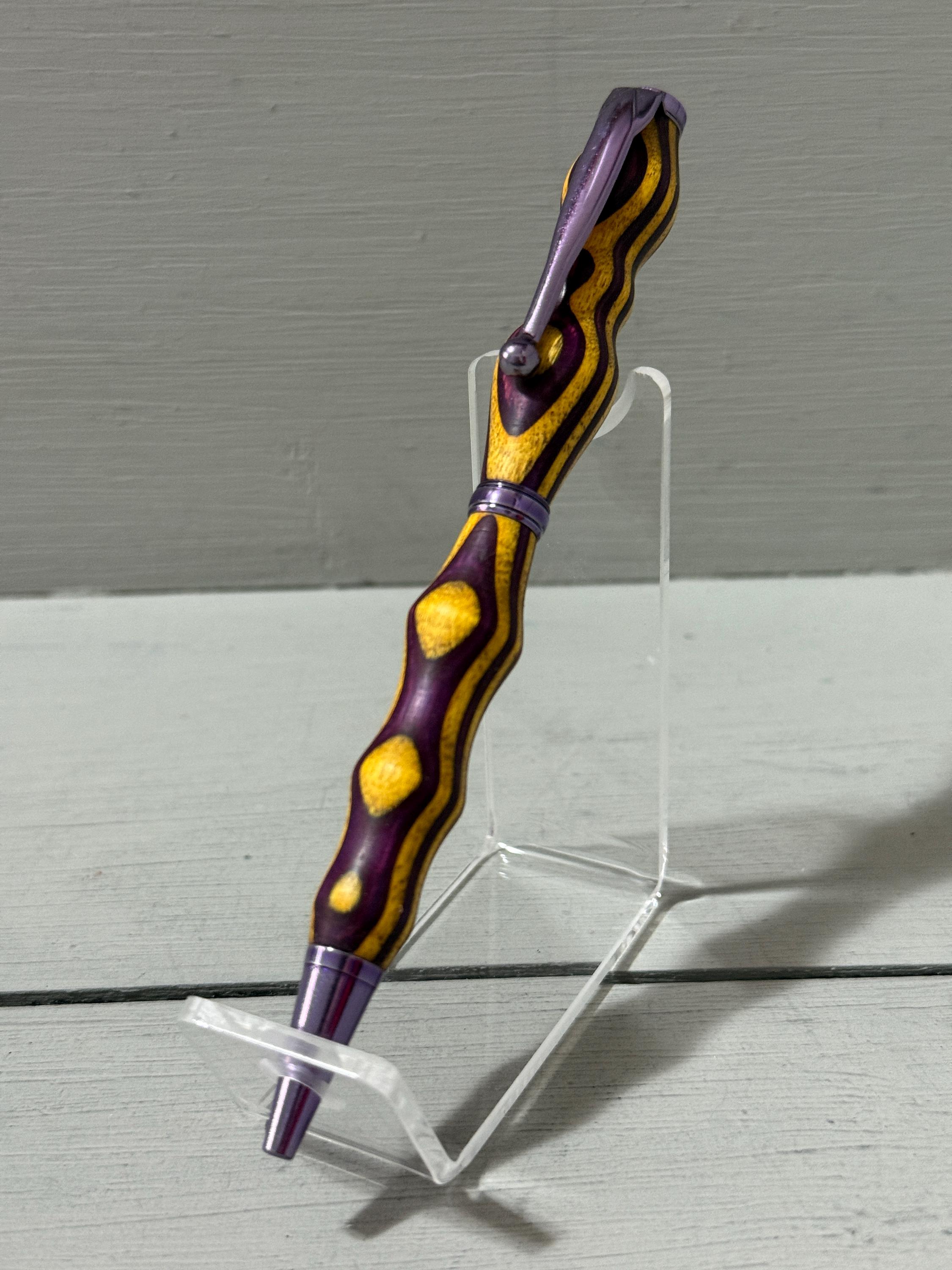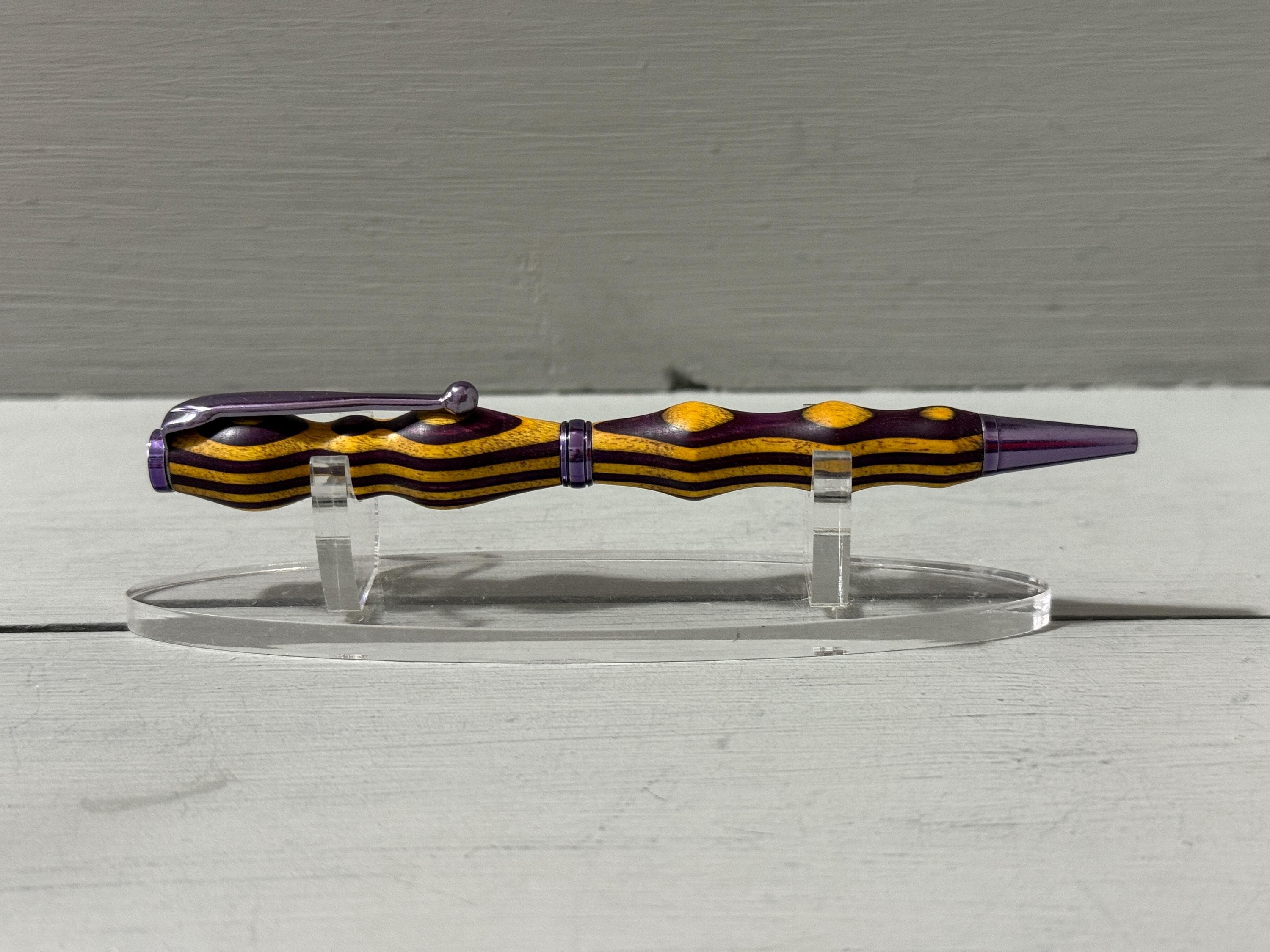 The layered Spectraply wood creates a dynamic pattern of yellow and purple tones, giving this pen a playful yet polished look. Its slim profile makes it comfortable to hold and easy to carry—perfect for everyday use or as a standout gift.