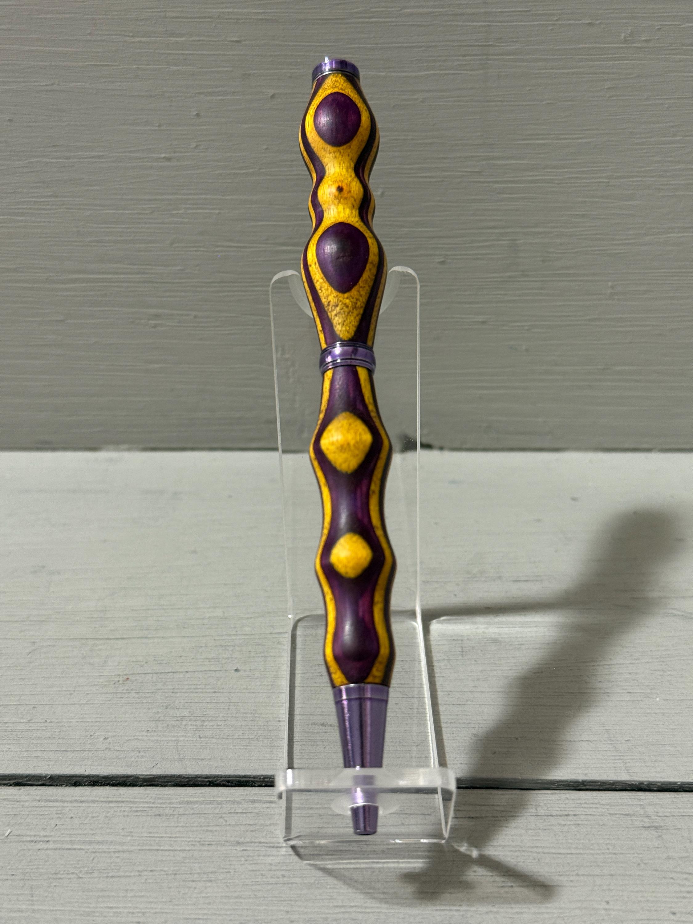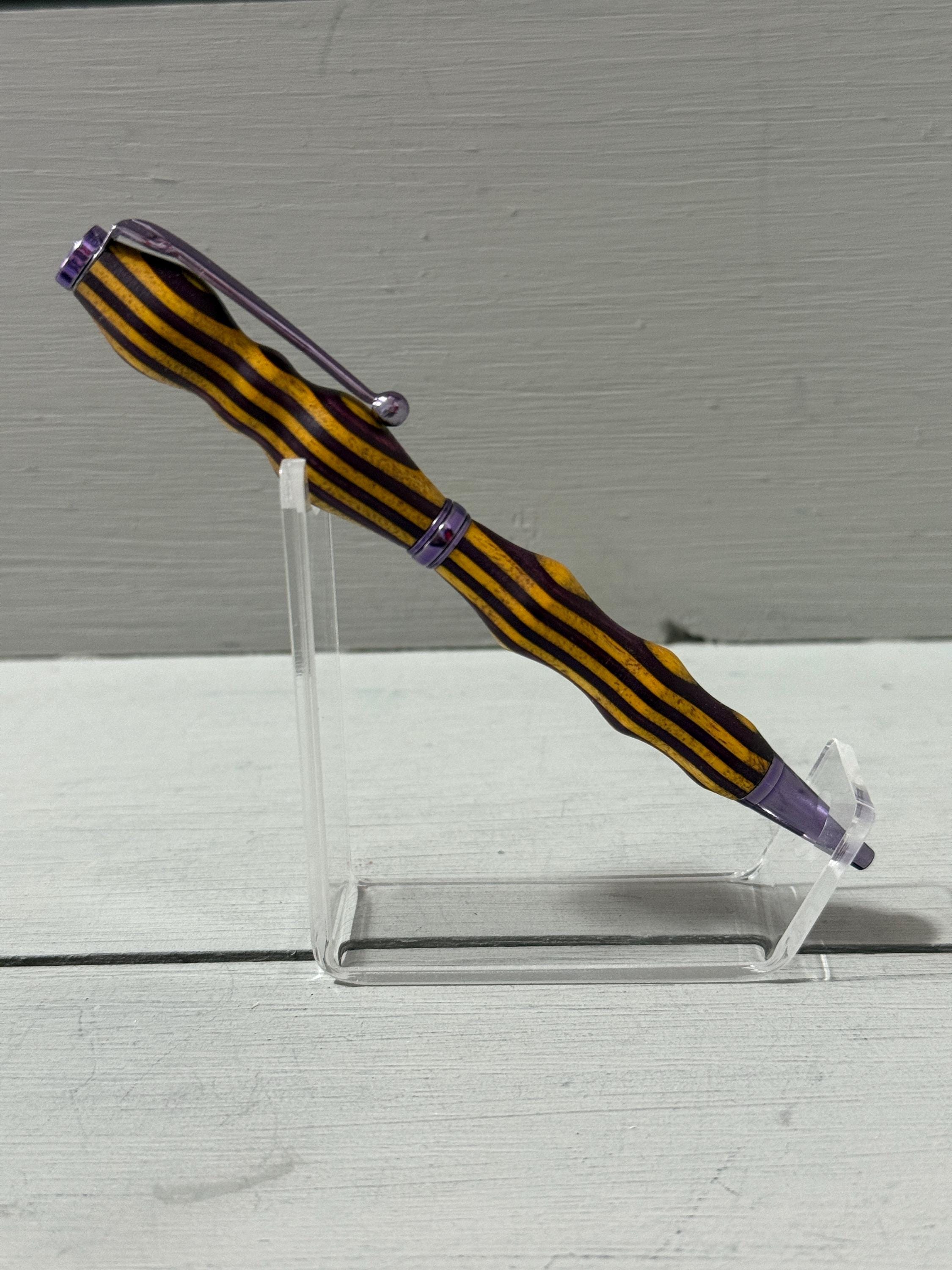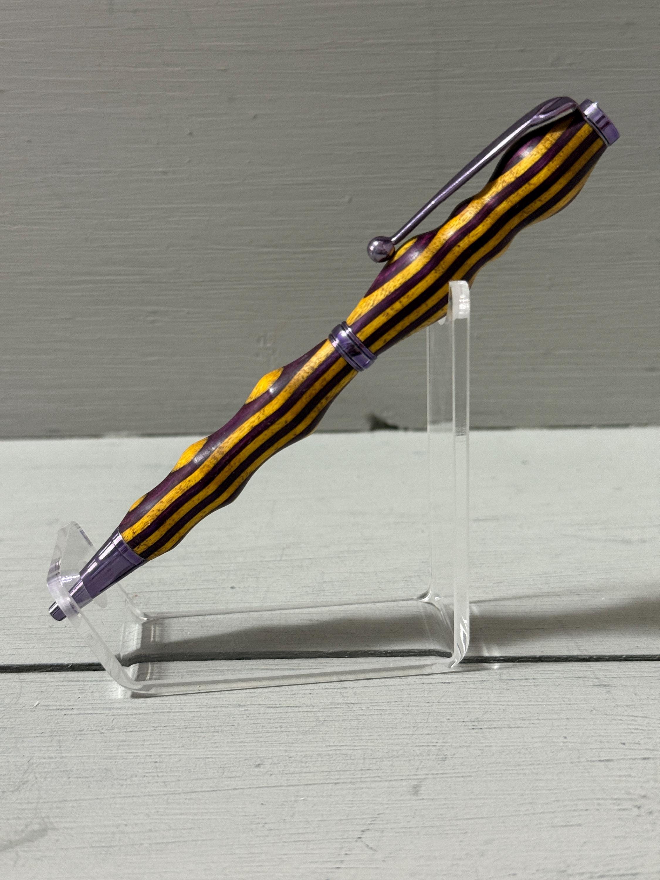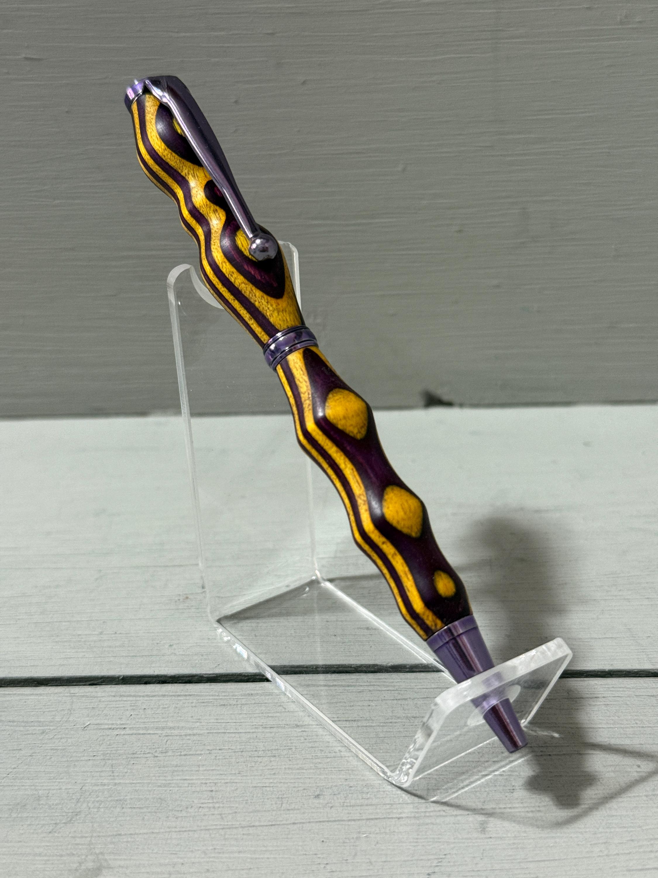 The layered Spectraply wood creates a dynamic pattern of yellow and purple tones, giving this pen a playful yet polished look. Its slim profile makes it comfortable to hold and easy to carry—perfect for everyday use or as a standout gift.