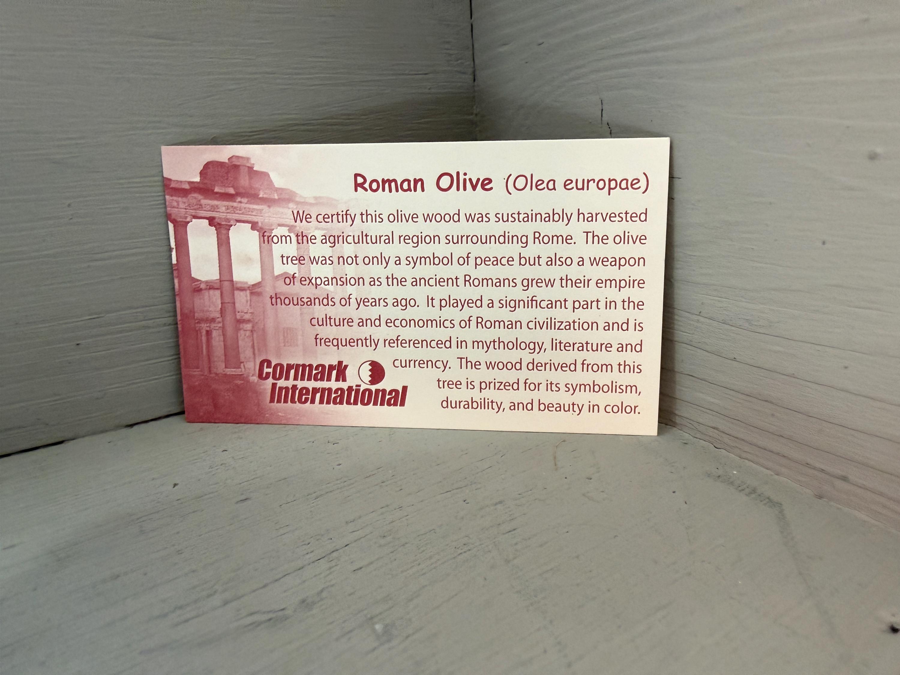 “We certify this olive wood was sustainably harvested from the agricultural region surrounding Rome. The olive tree was not only a symbol of peace but also a weapon of expansion as the ancient Romans grew their empire thousands of years ago. It played a significant part in the culture and economics of Roman civilization and is frequently referenced in mythology, literature and currency. The wood derived from this tree is prized for its symbolism, durability, and beauty in color.”