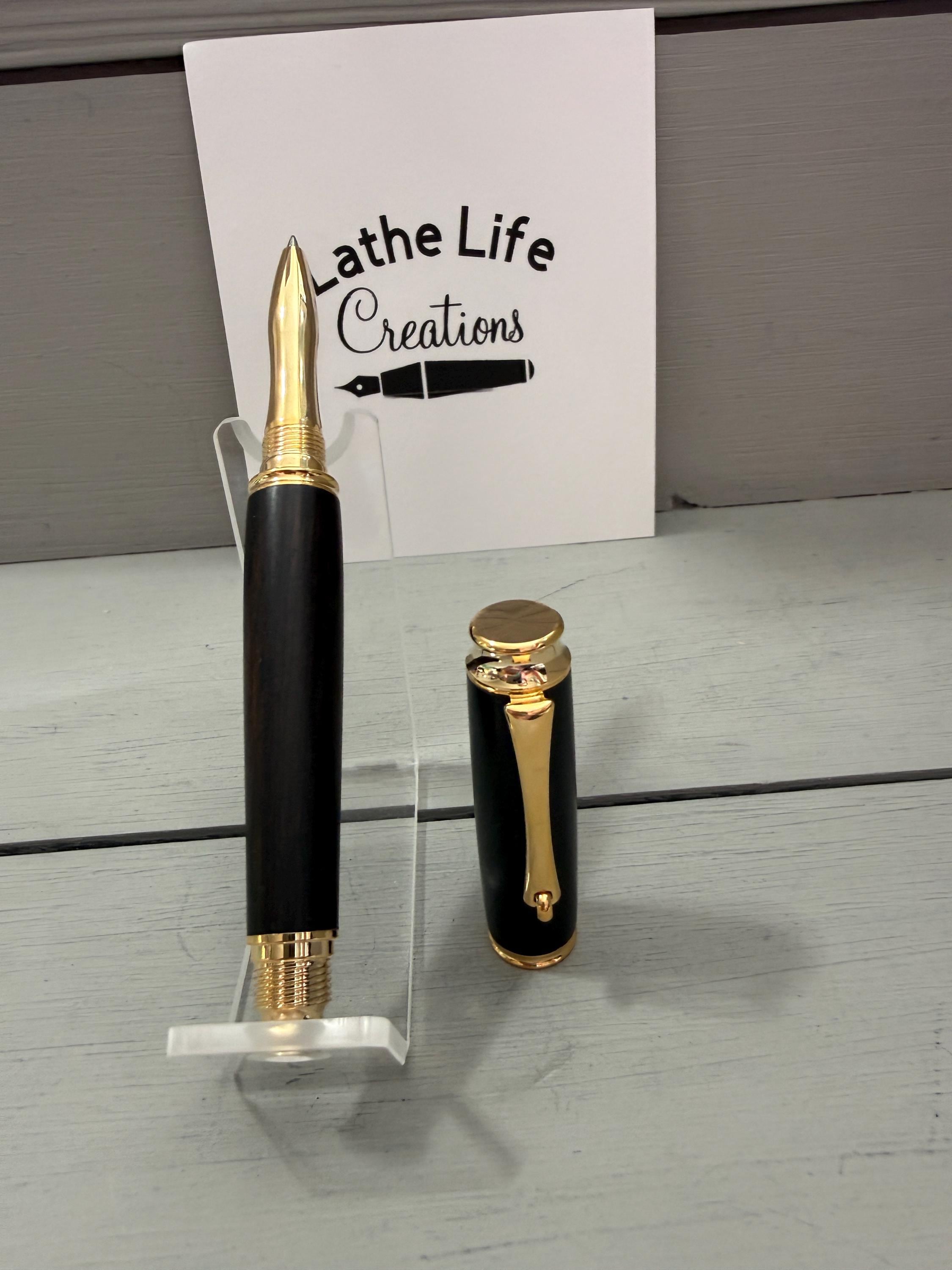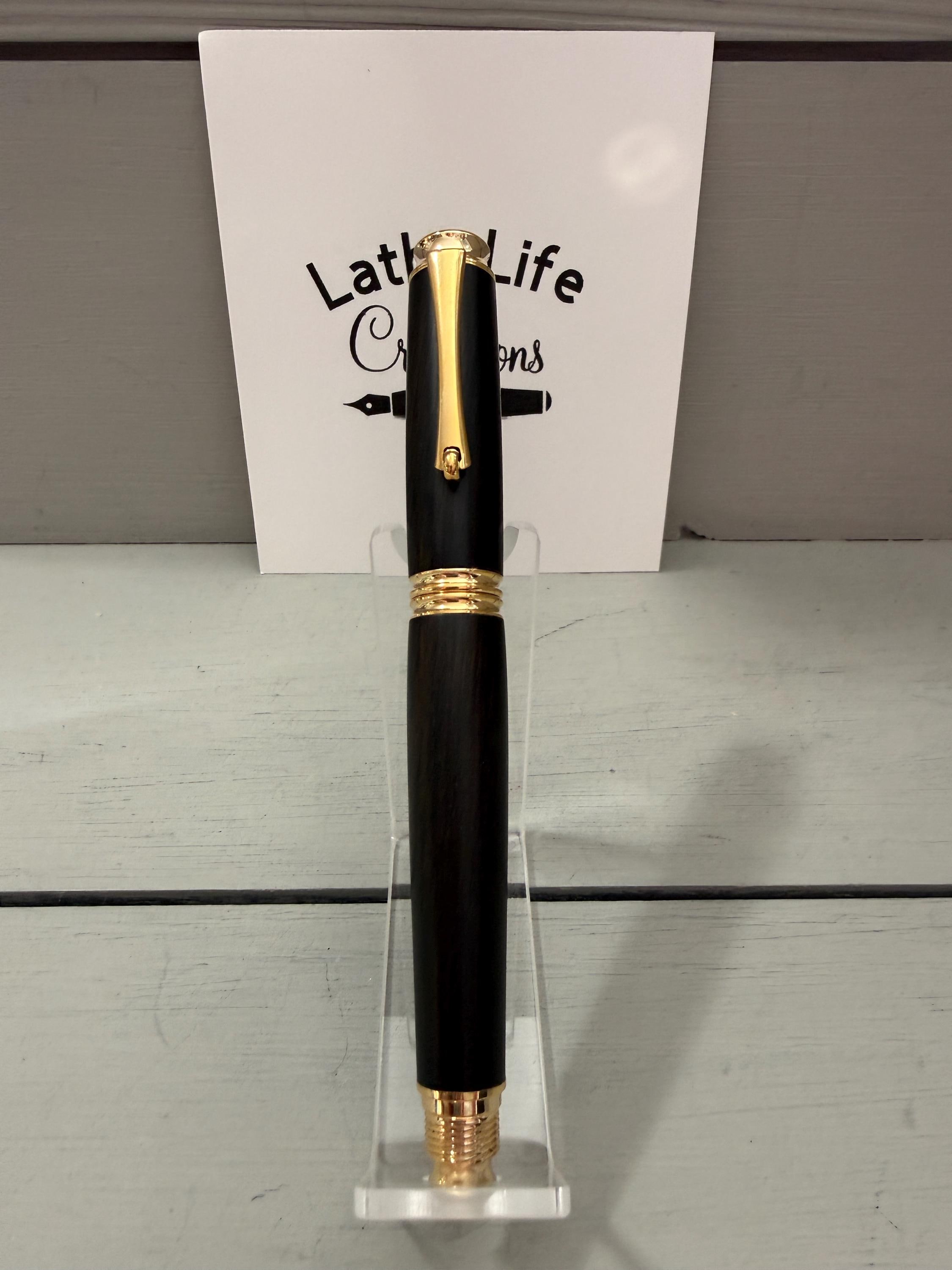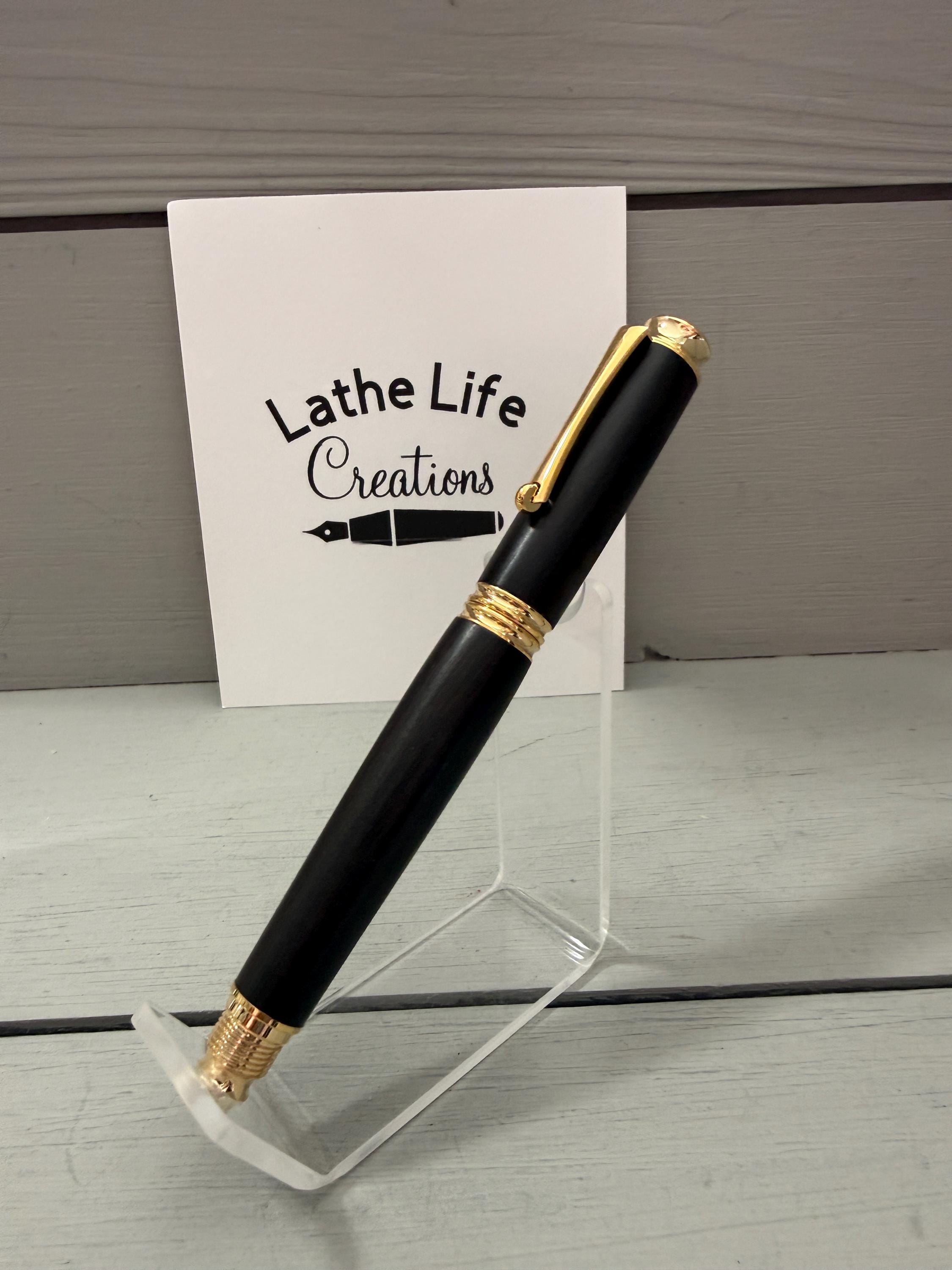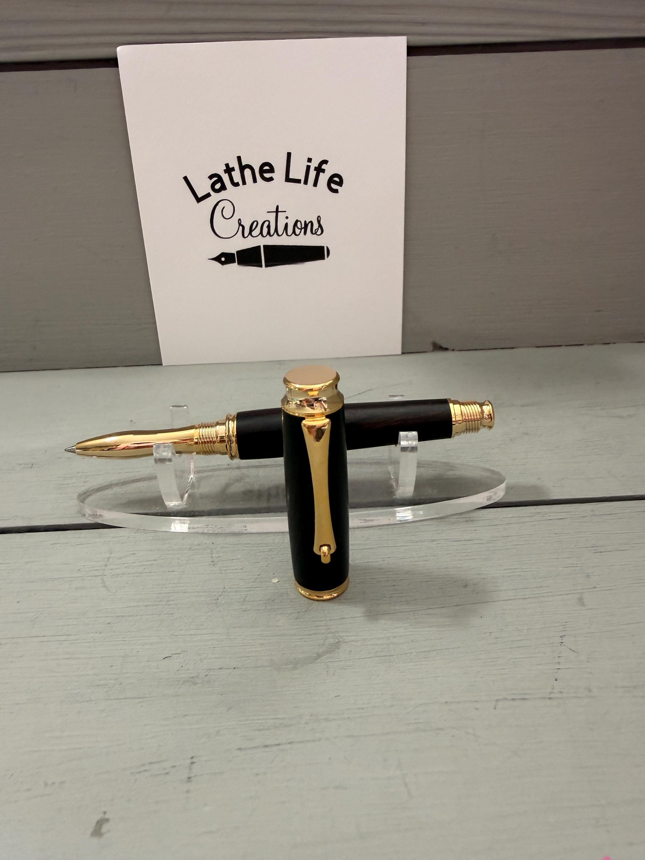 Elevate your writing experience with this handcrafted Metro Style Rollerball Pen, turned from premium African Blackwood and finished with elegant gold‑plated trim. Known for its deep, rich coloration and exceptional density, African Blackwood has long been prized for fine instruments and heirloom‑quality pieces.