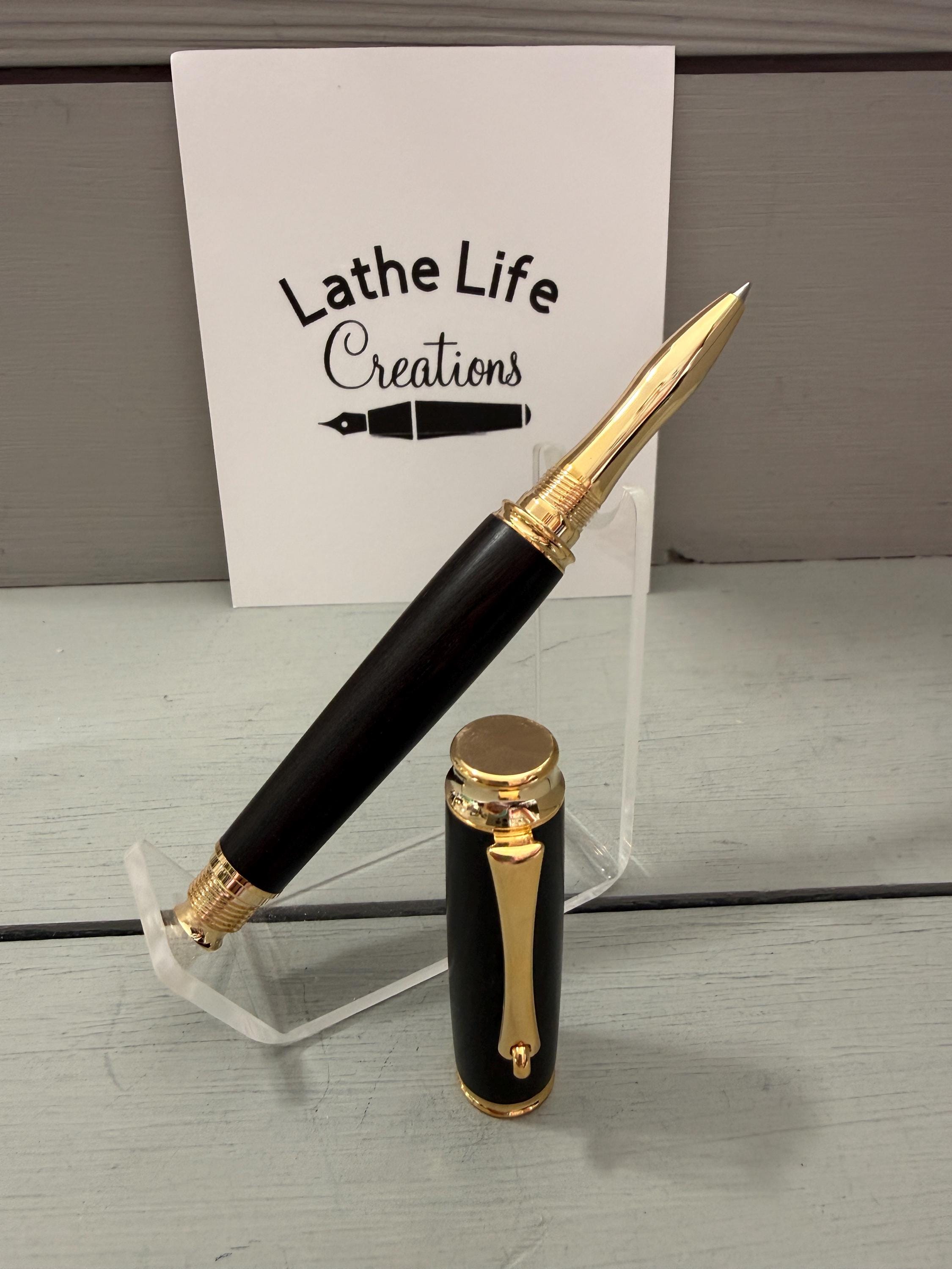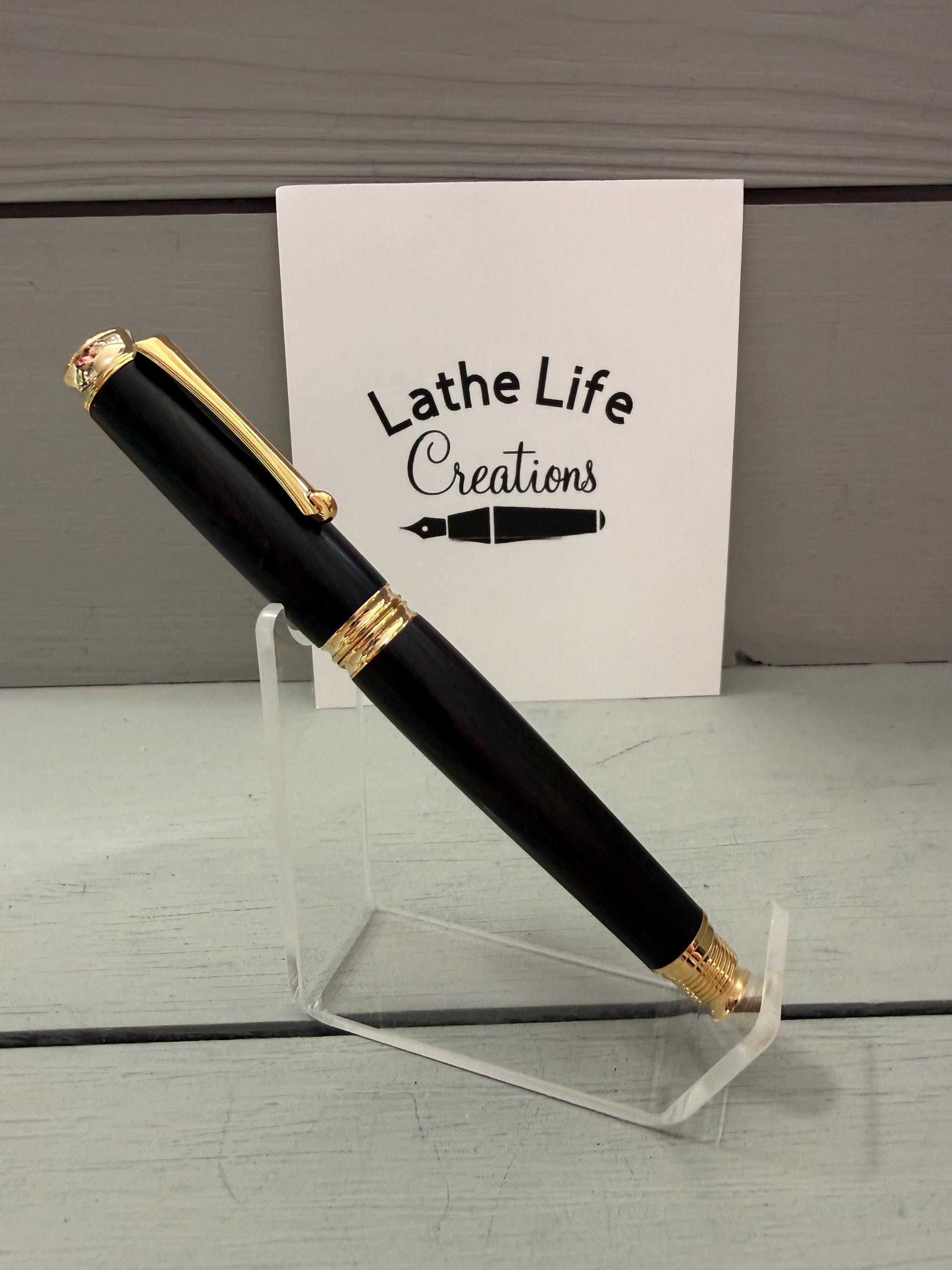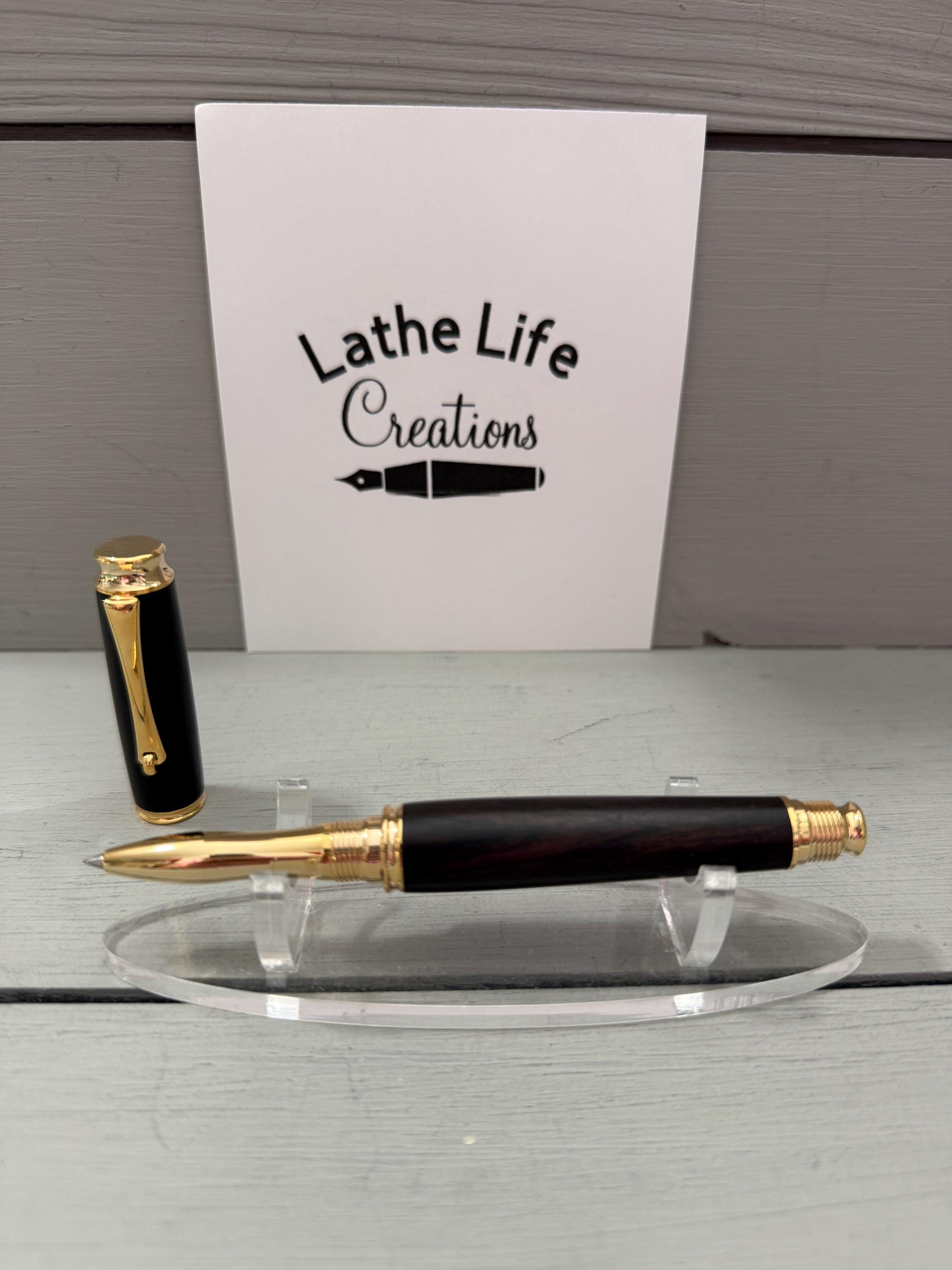Elevate your writing experience with this handcrafted Metro Style Rollerball Pen, turned from premium African Blackwood and finished with elegant gold‑plated trim. Known for its deep, rich coloration and exceptional density, African Blackwood has long been prized for fine instruments and heirloom‑quality pieces.