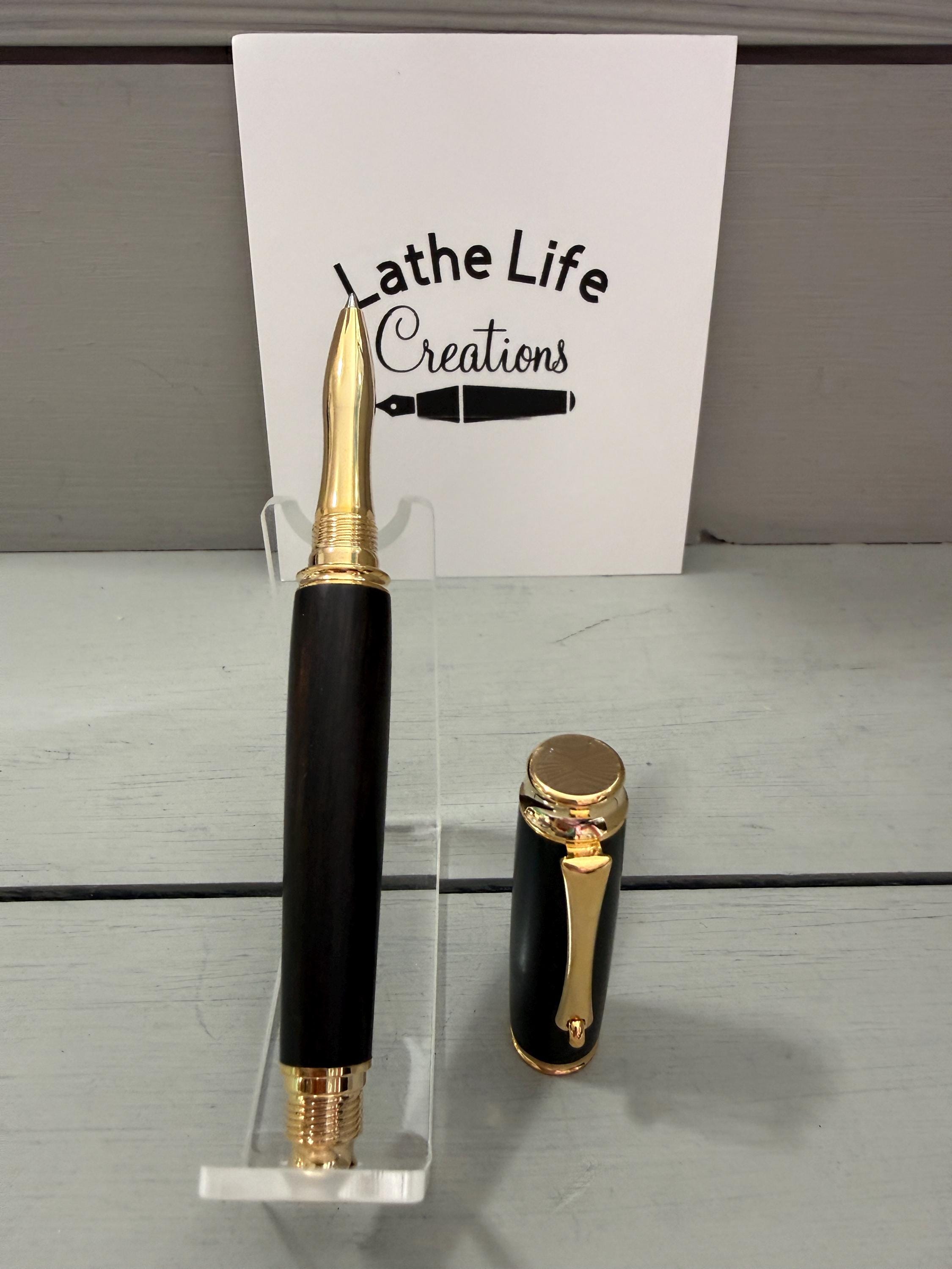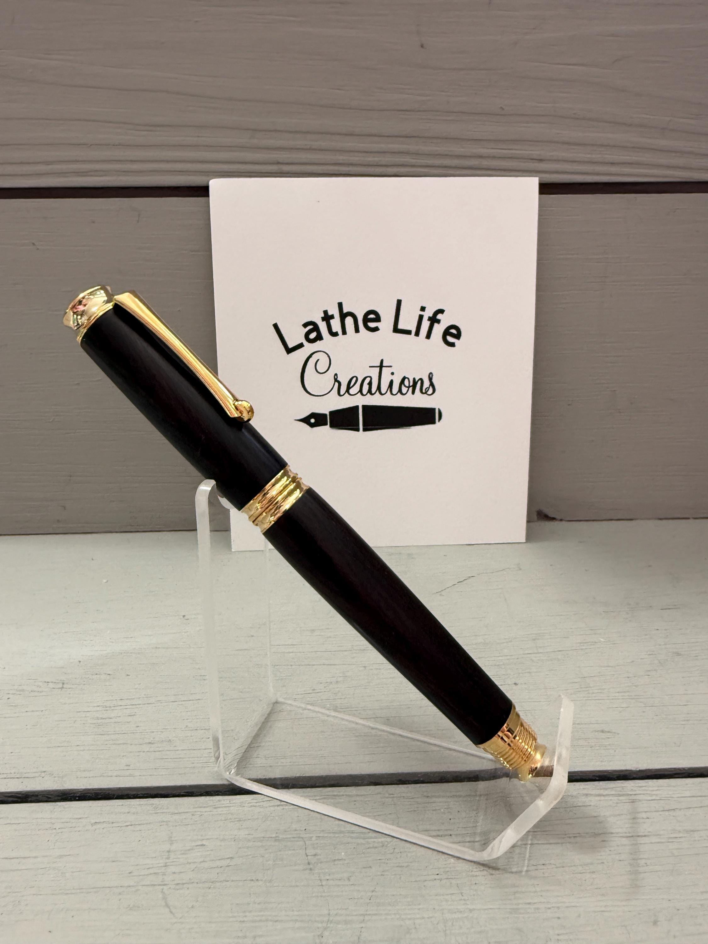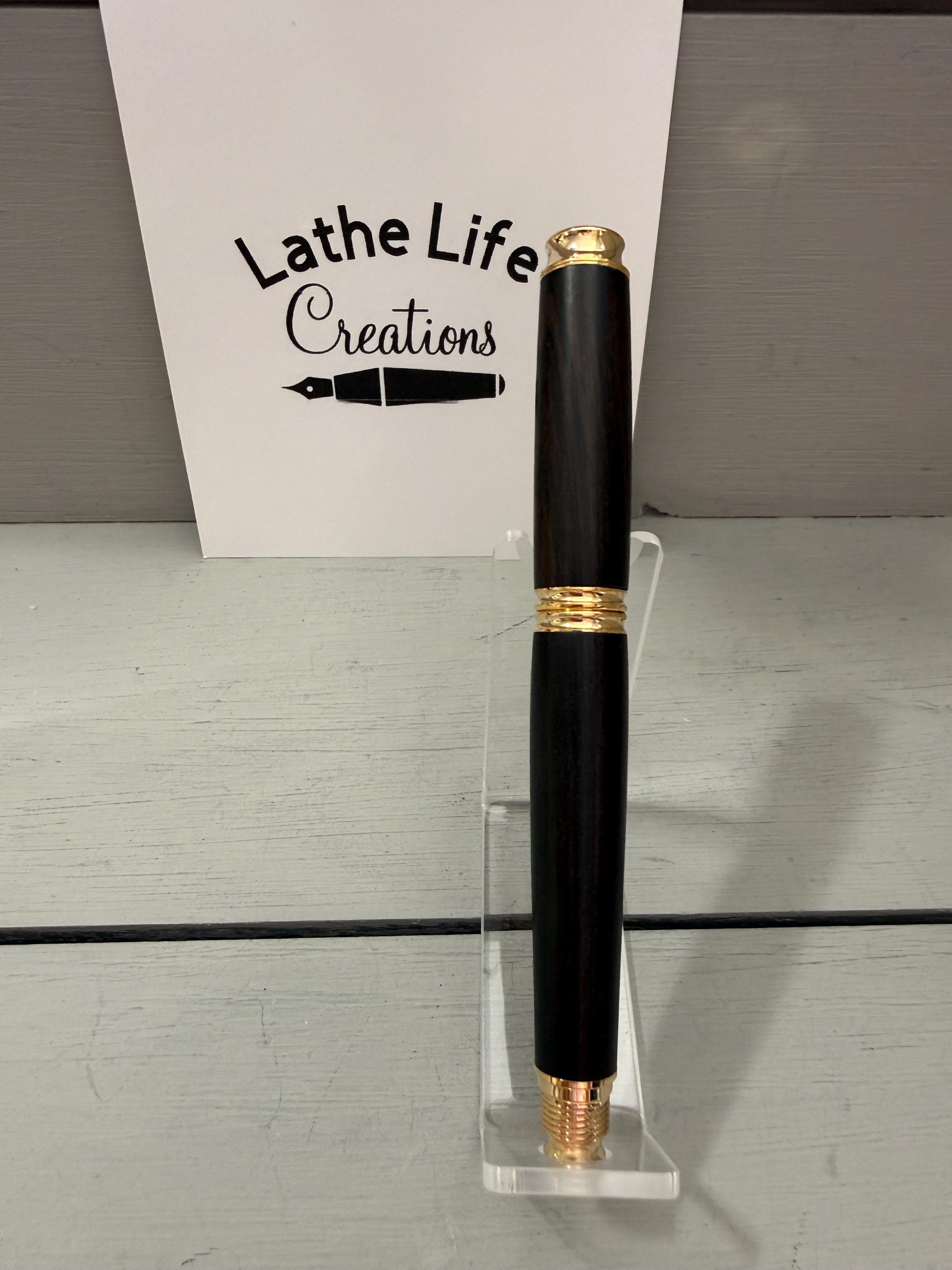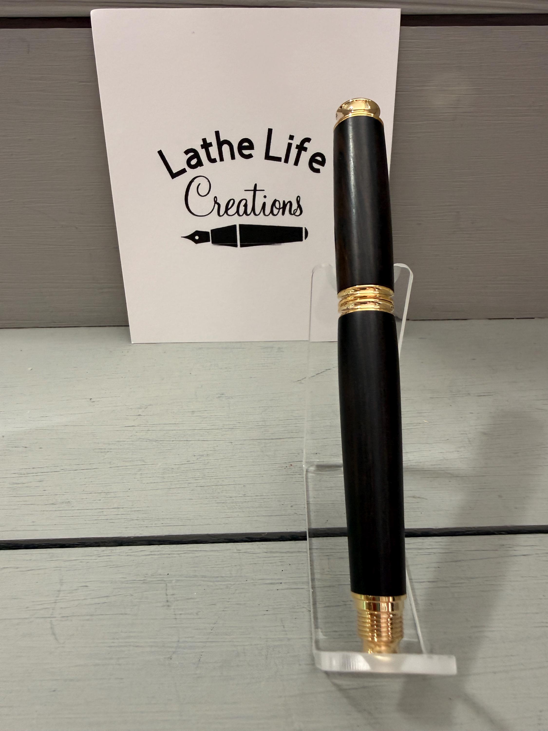 Elevate your writing experience with this handcrafted Metro Style Rollerball Pen, turned from premium African Blackwood and finished with elegant gold‑plated trim. Known for its deep, rich coloration and exceptional density, African Blackwood has long been prized for fine instruments and heirloom‑quality pieces.