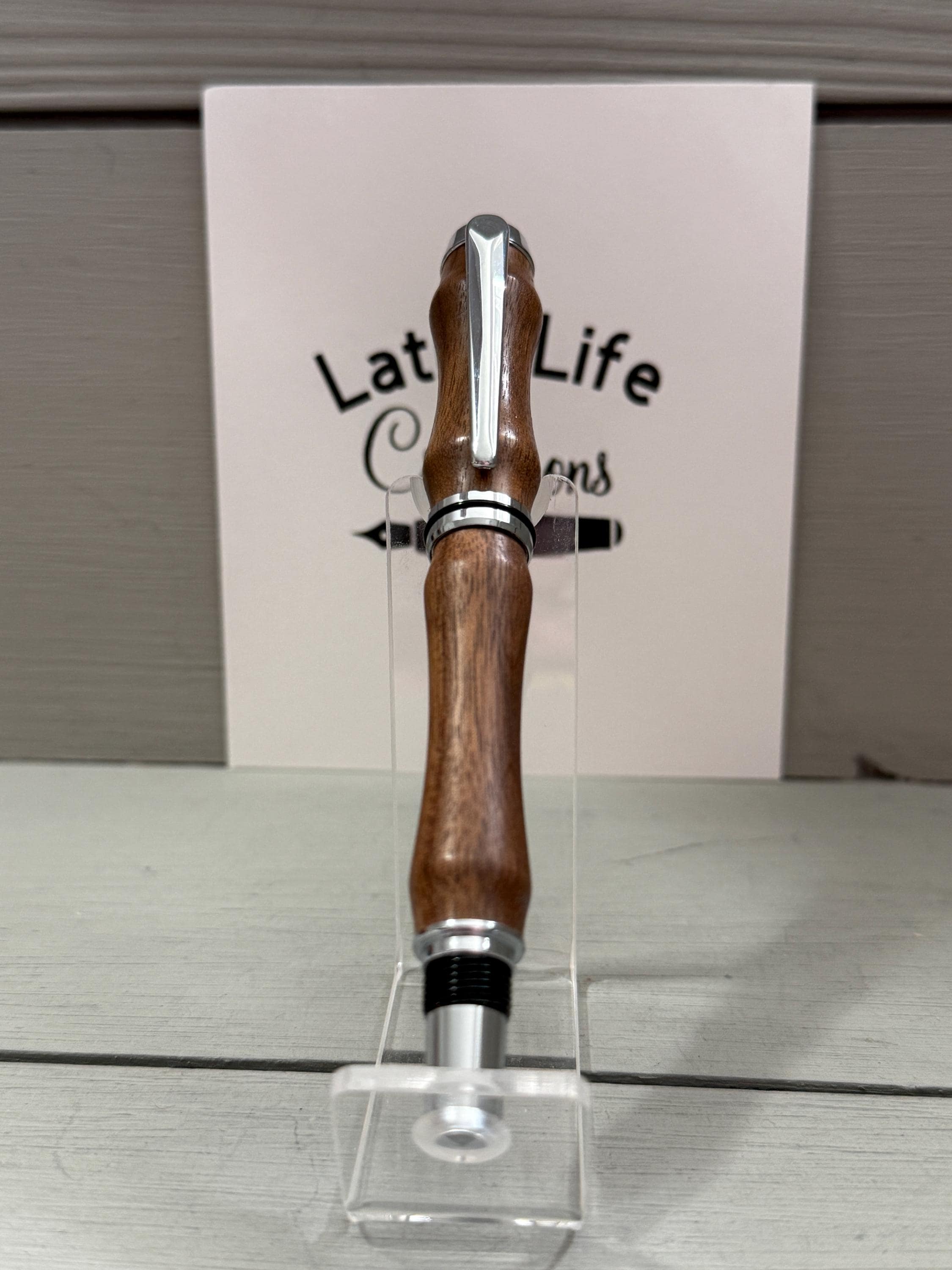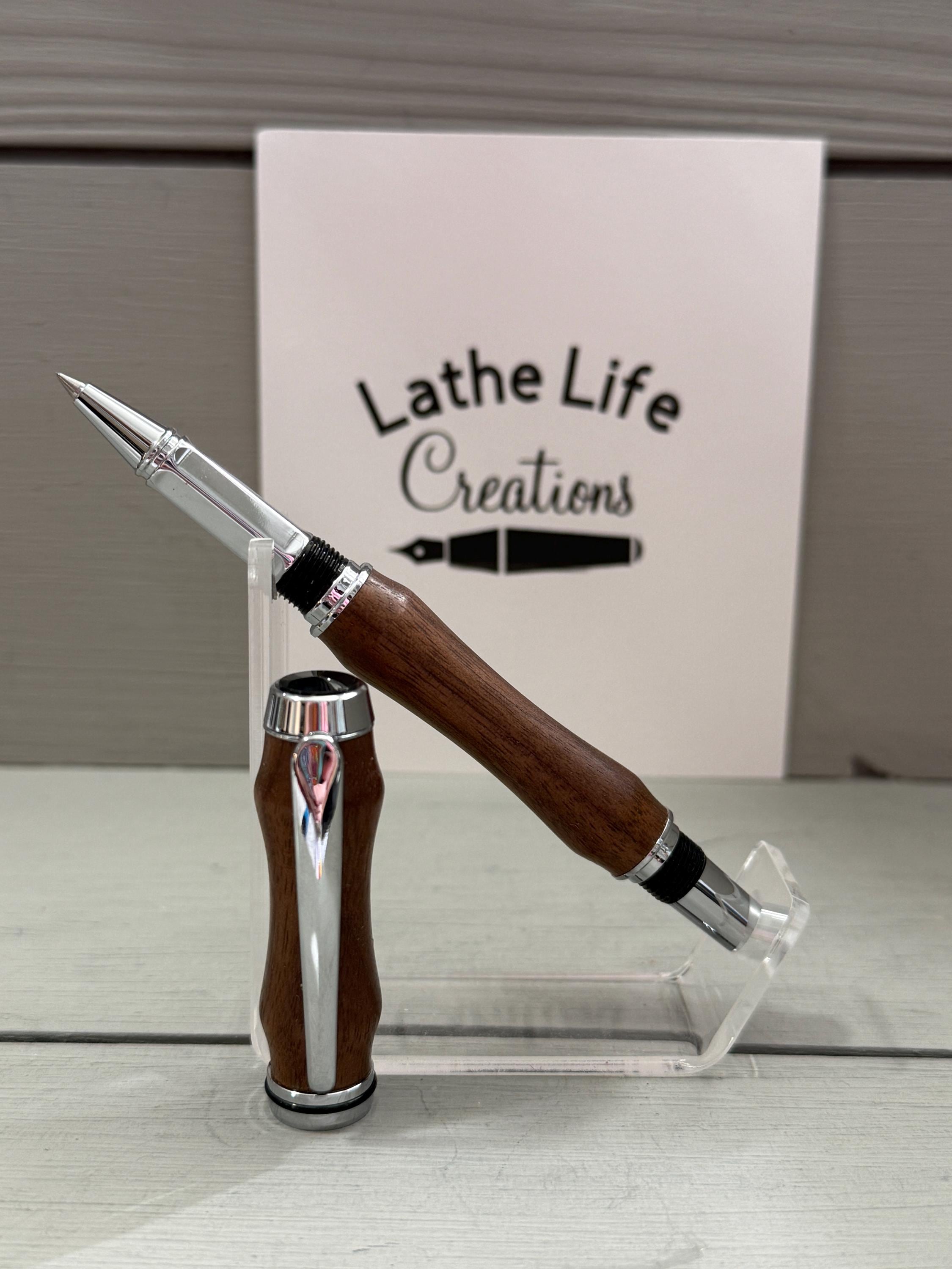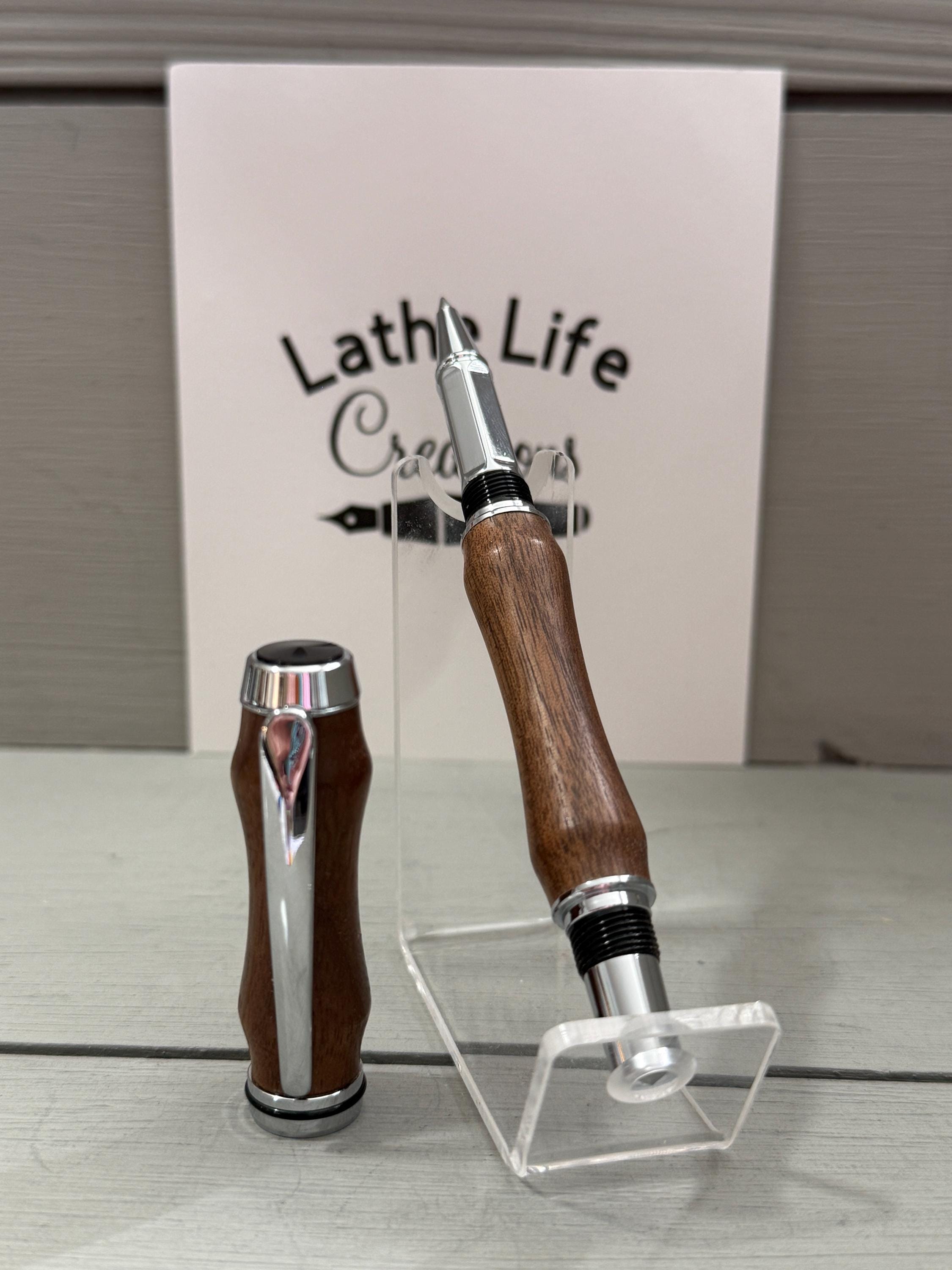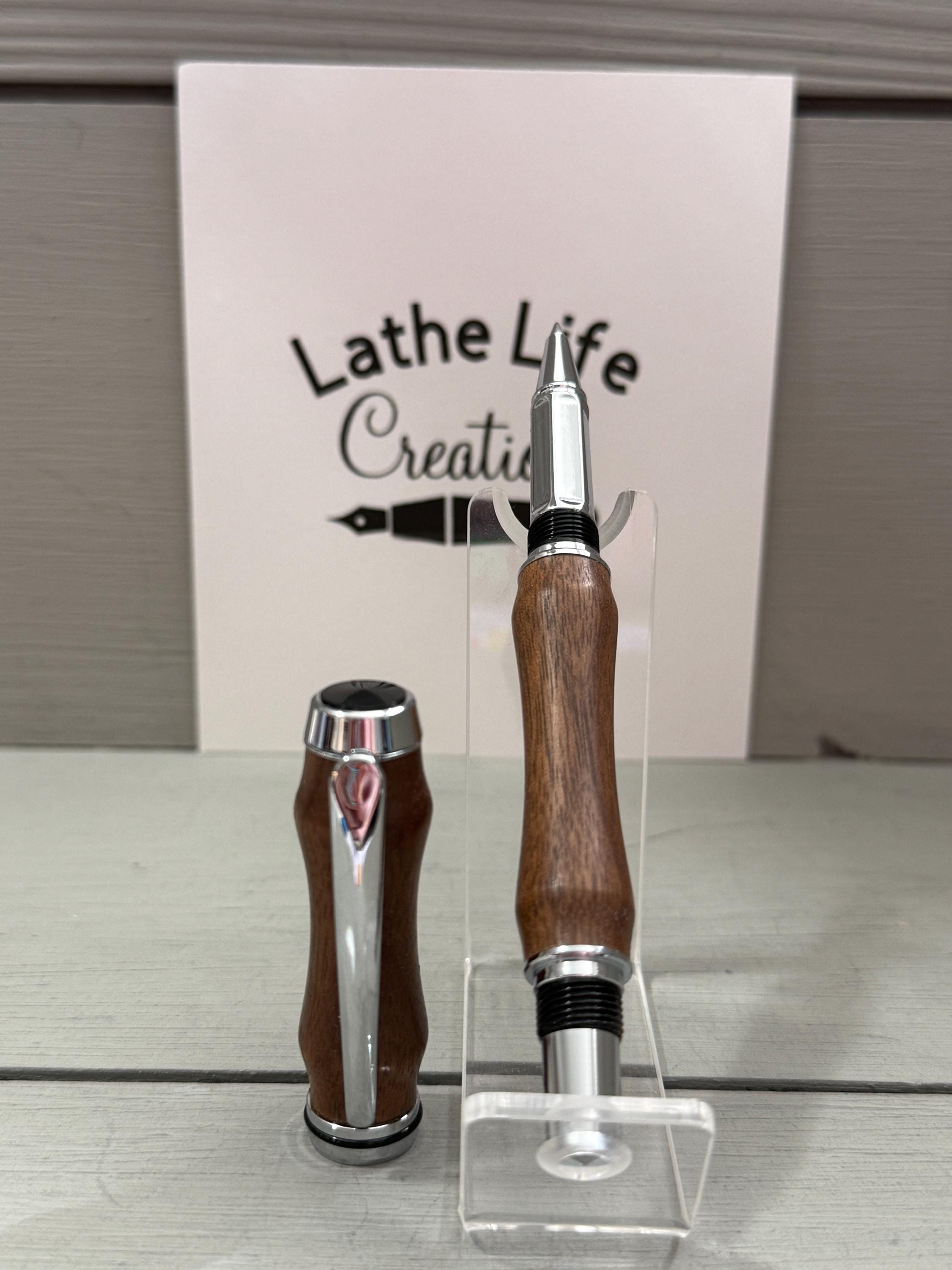 The Wicked Walnut is a handcrafted pen made of Walnut, a native North Carolina product. This beautiful and unique navigator pen is sure to please both the eyes and the hand. The beautiful Chrome finish highlights this locally sourced natural wood.