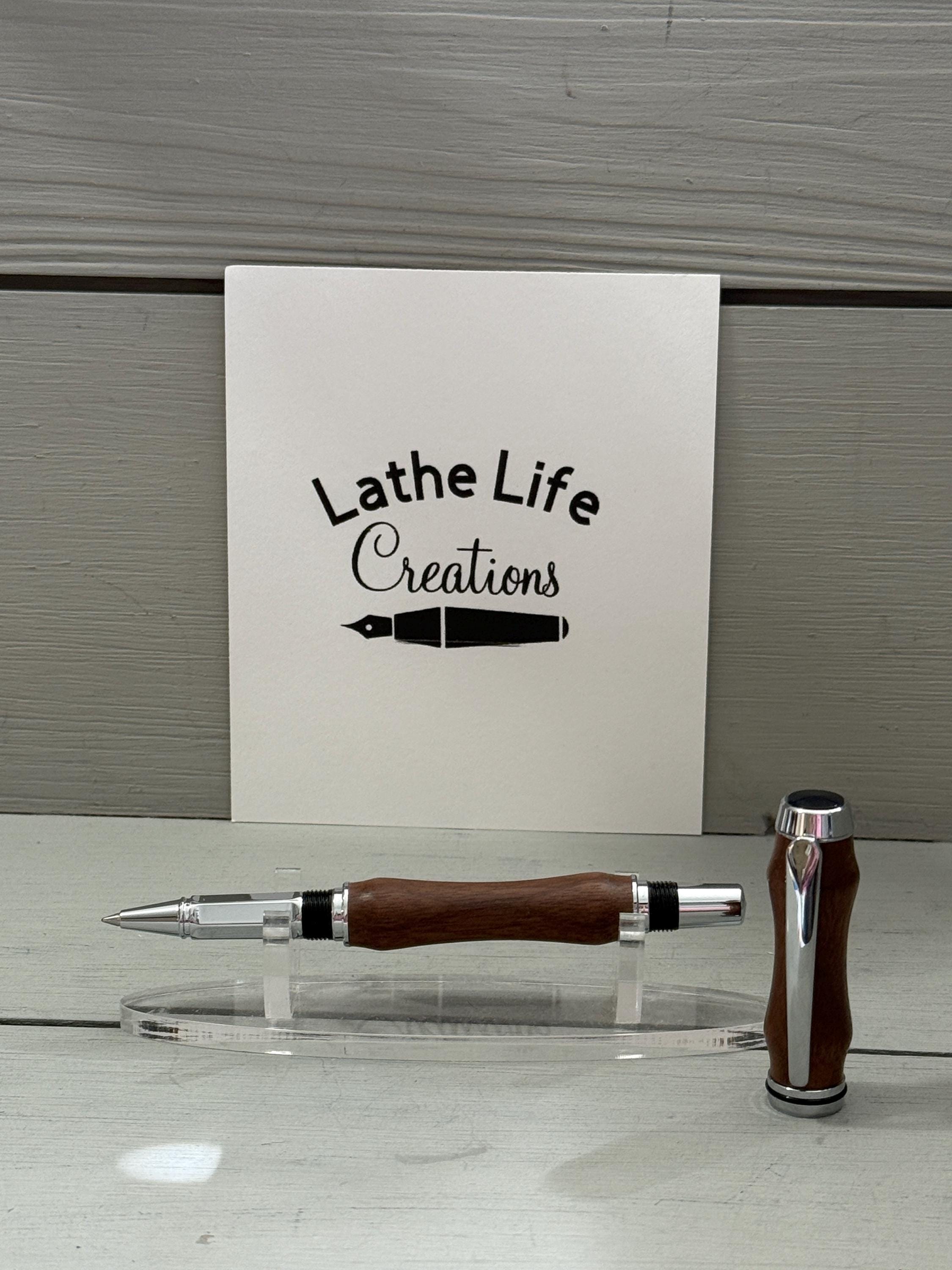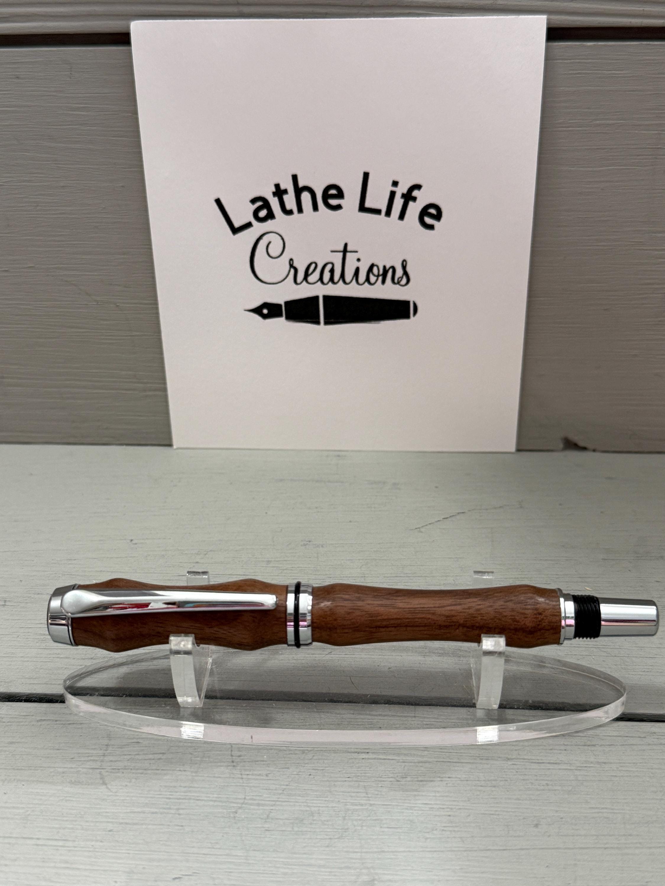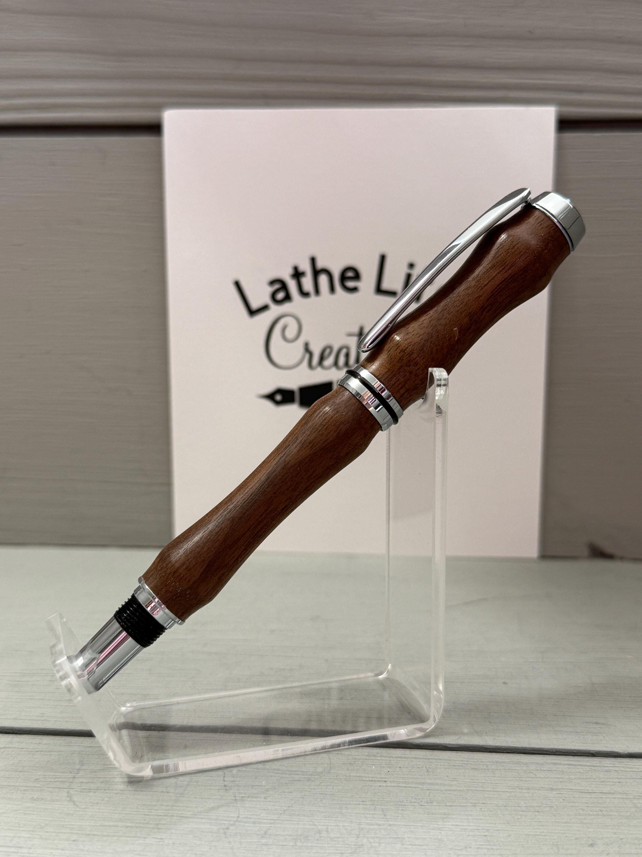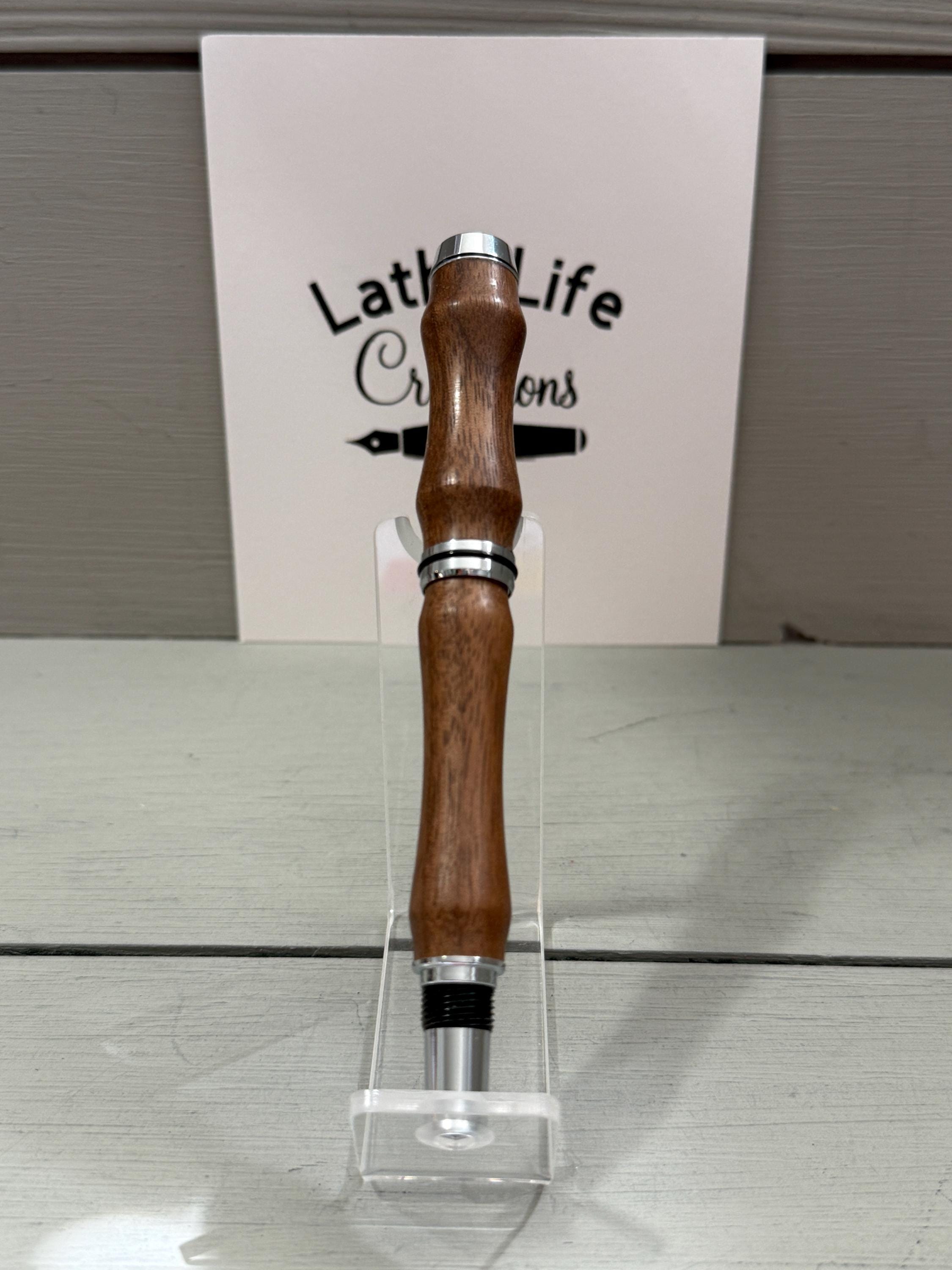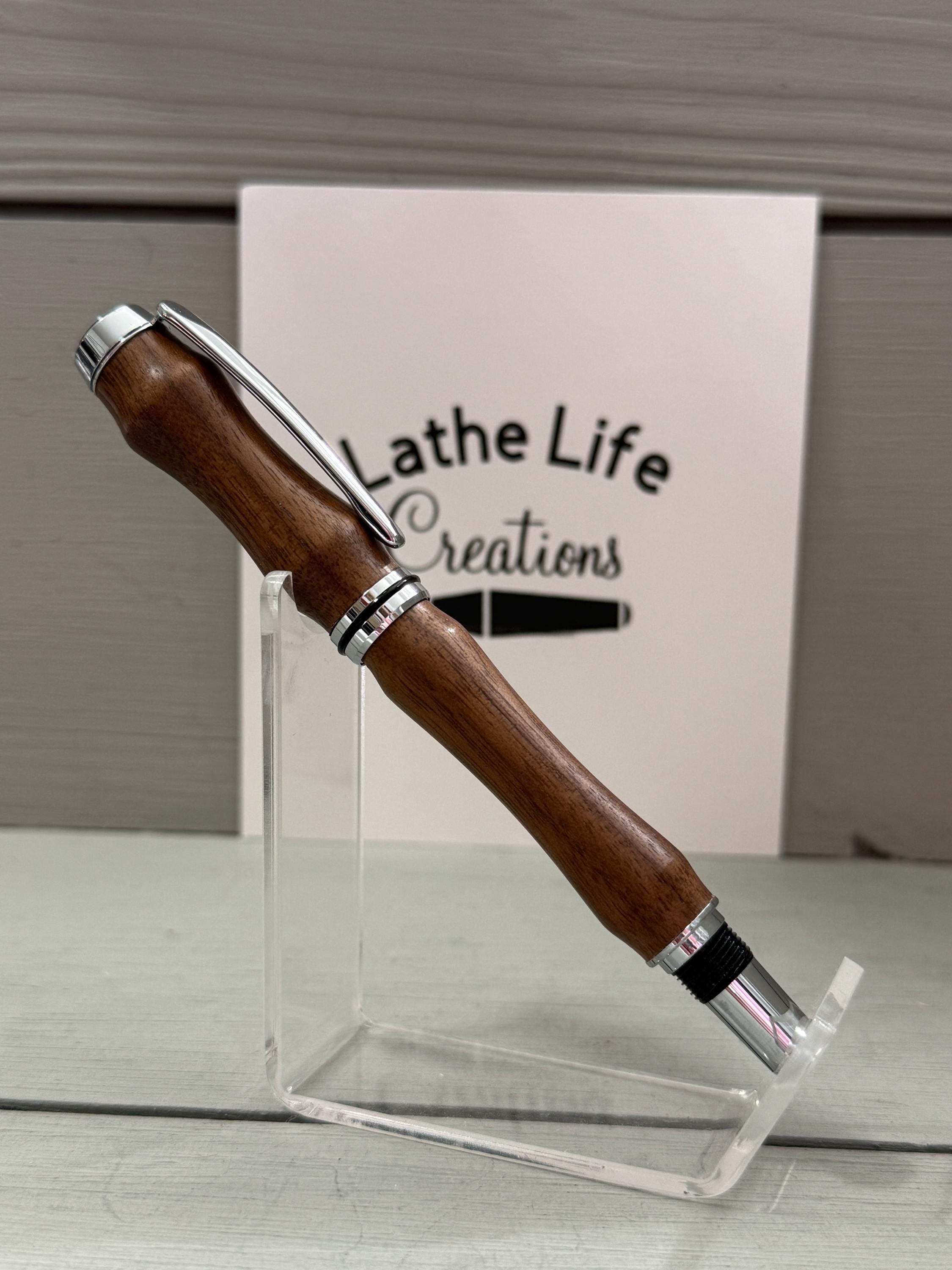 The Wicked Walnut is a handcrafted pen made of Walnut, a native North Carolina product. This beautiful and unique navigator pen is sure to please both the eyes and the hand. The beautiful Chrome finish highlights this locally sourced natural wood.