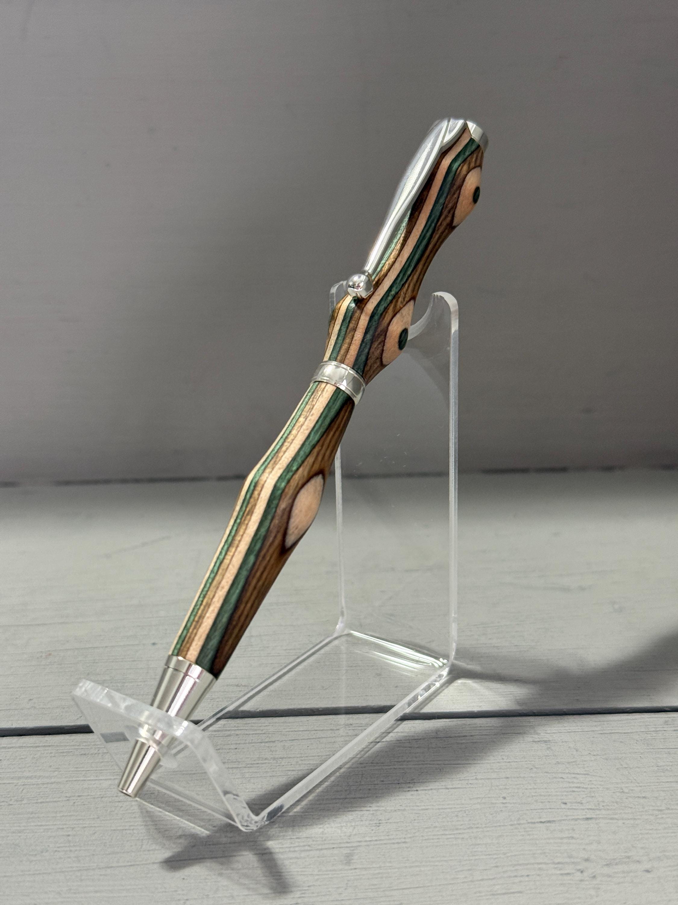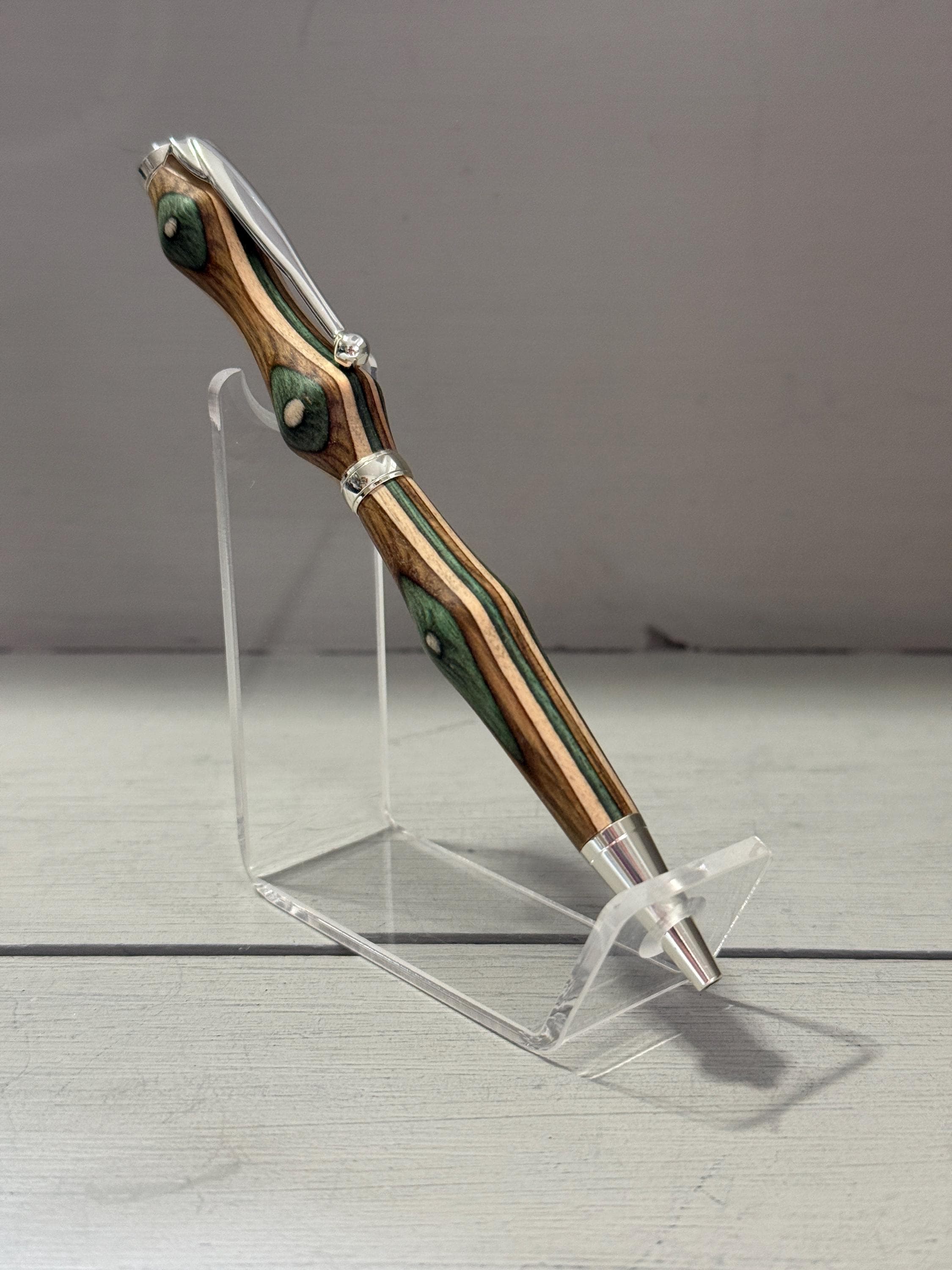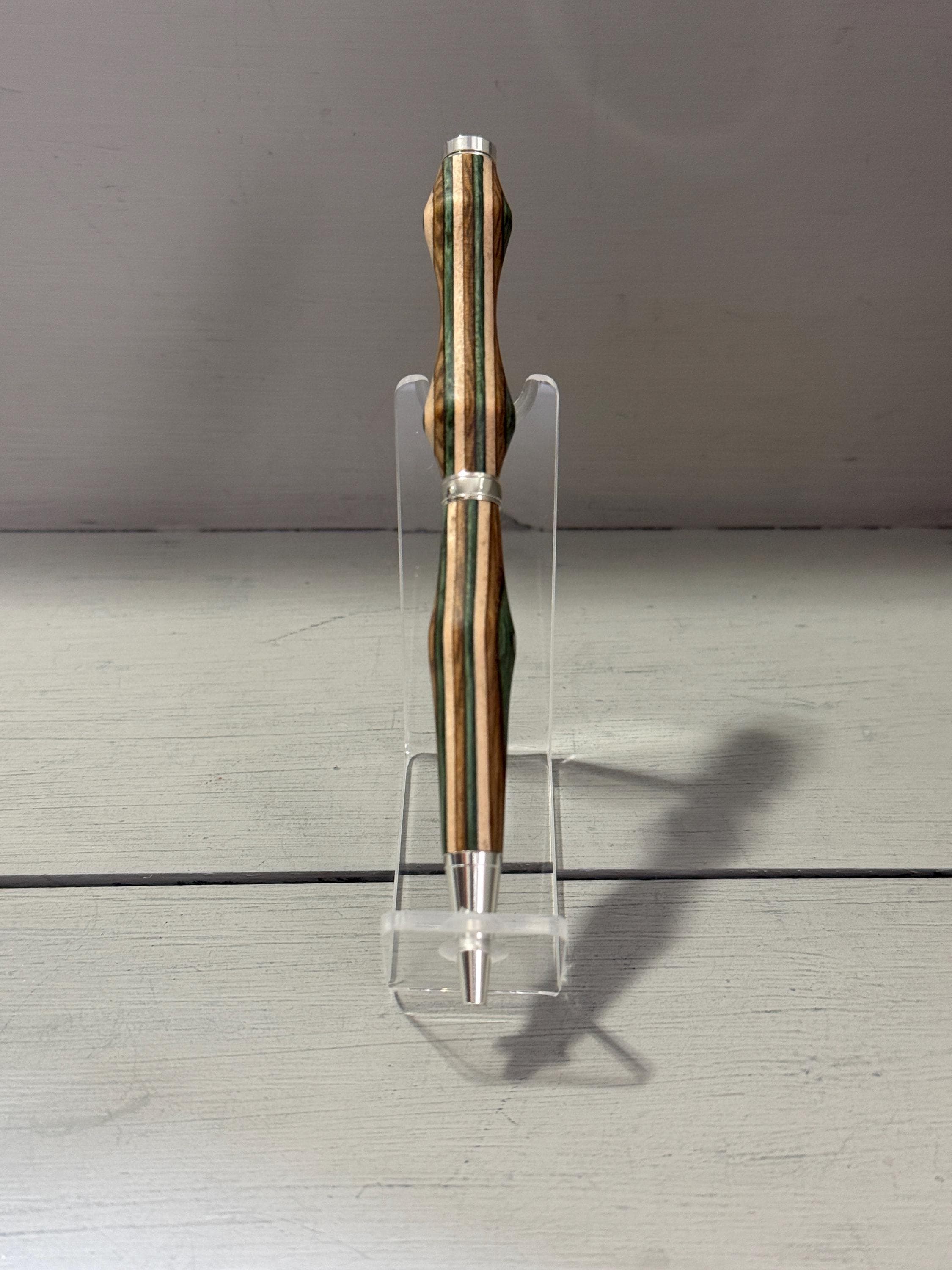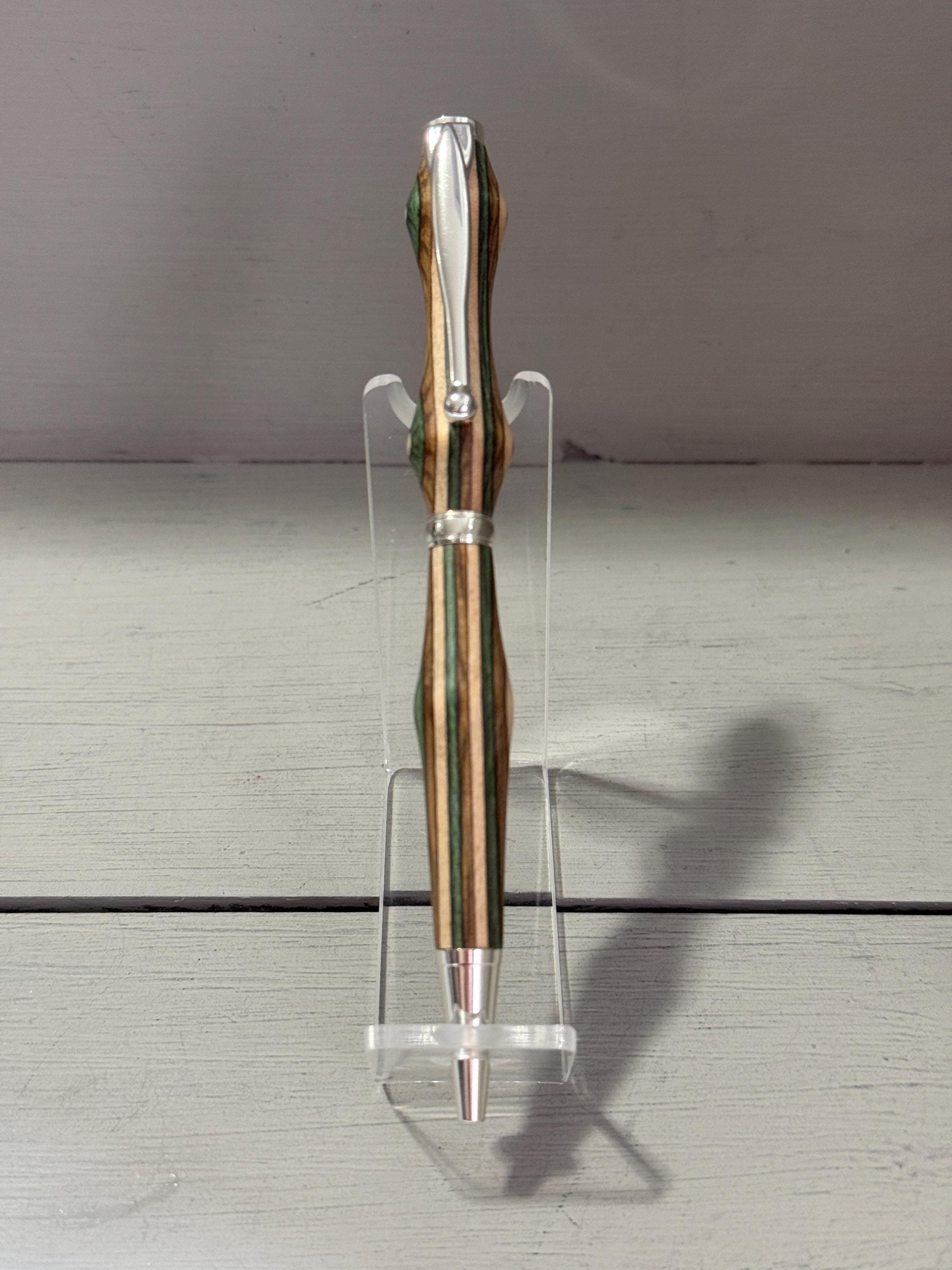 Add a touch of outdoorsy charm to your everyday writing with this handcrafted Slim Style Pen, turned from Green Mountain Camo Spectraply. With its layered tones of green, brown, and tan, this pen brings a natural, woodsy character to your desk or pocket. Finished in sleek silver chrome trim, it’s a perfect blend of rugged style and polished elegance.