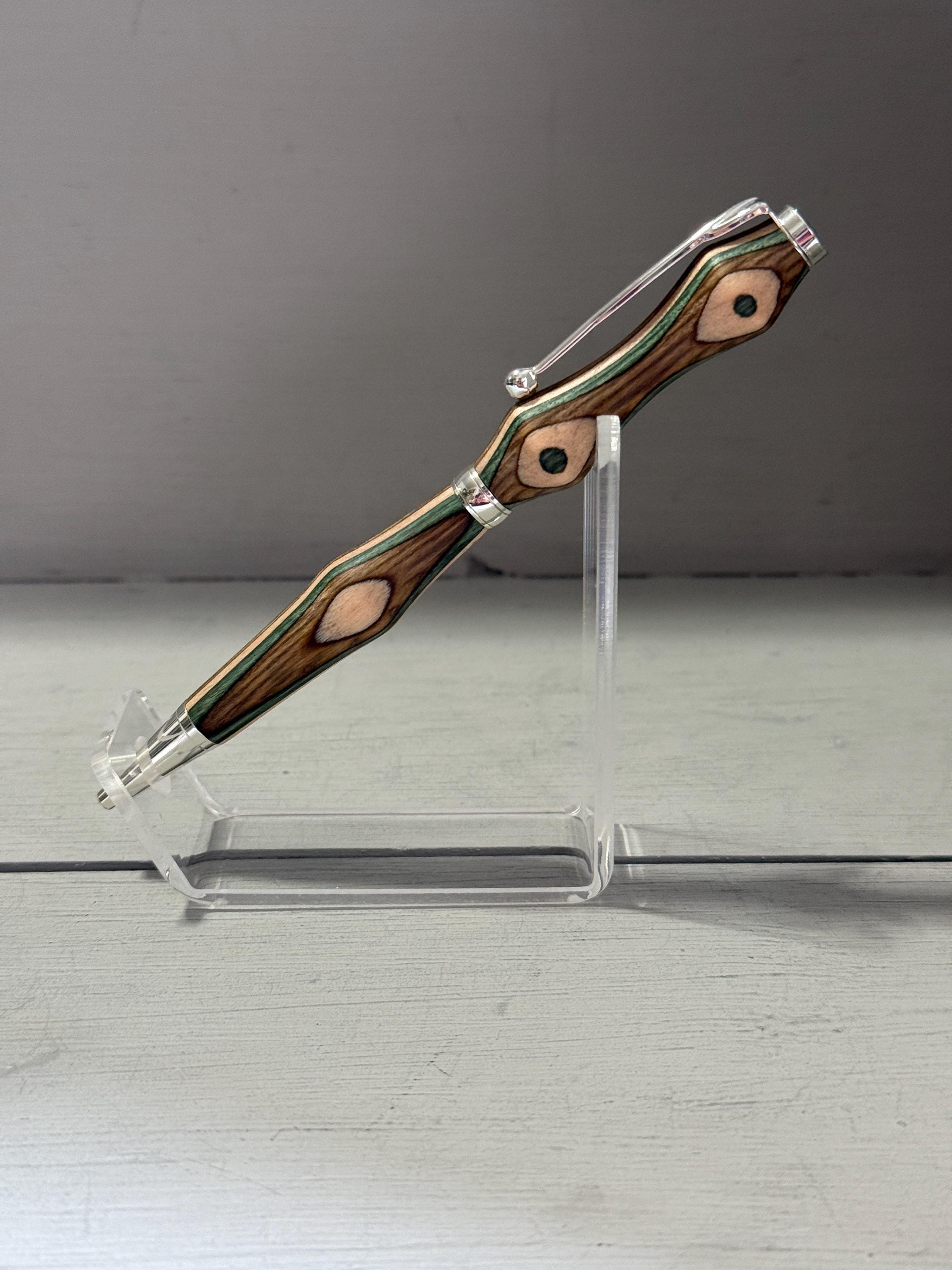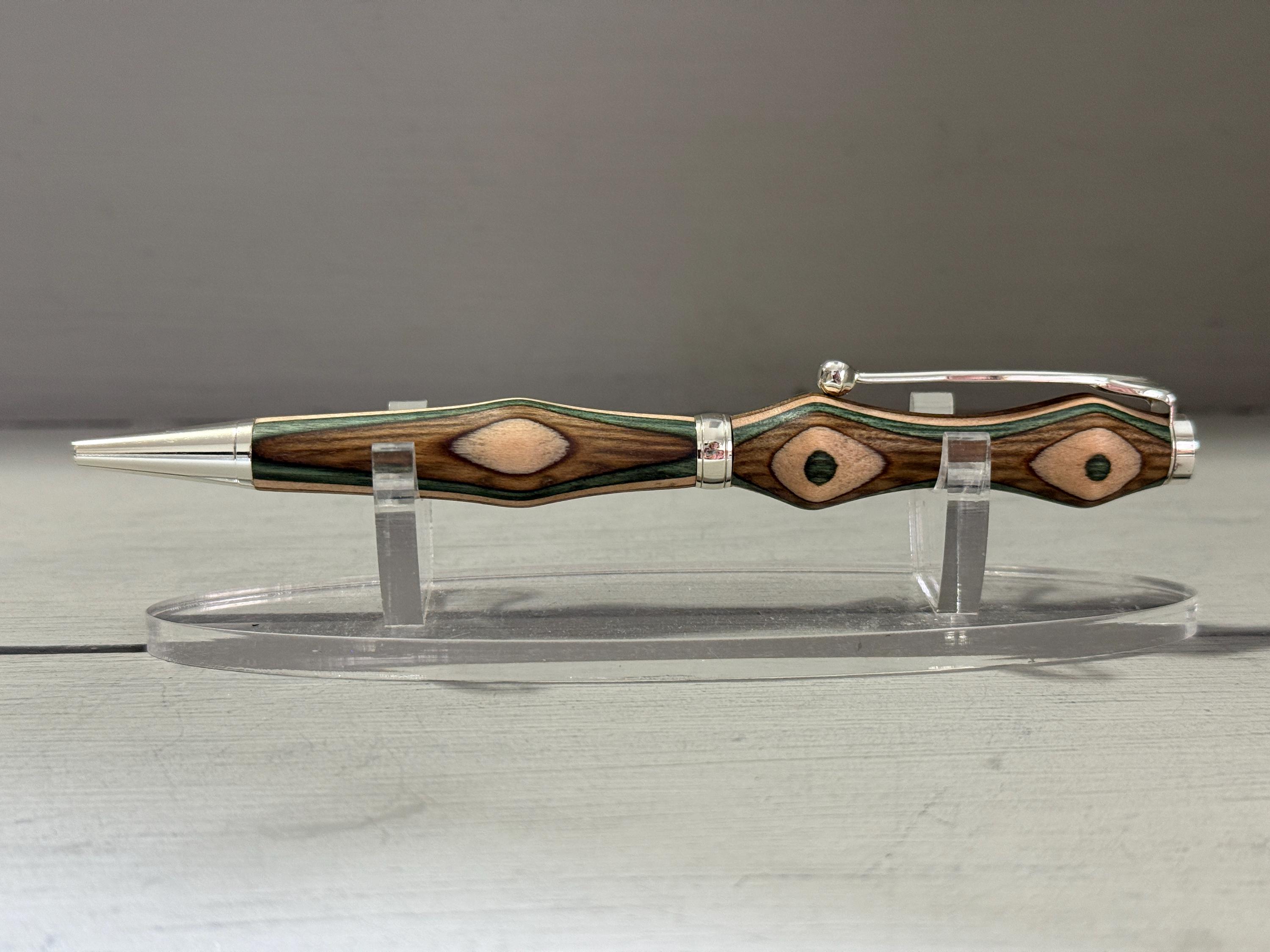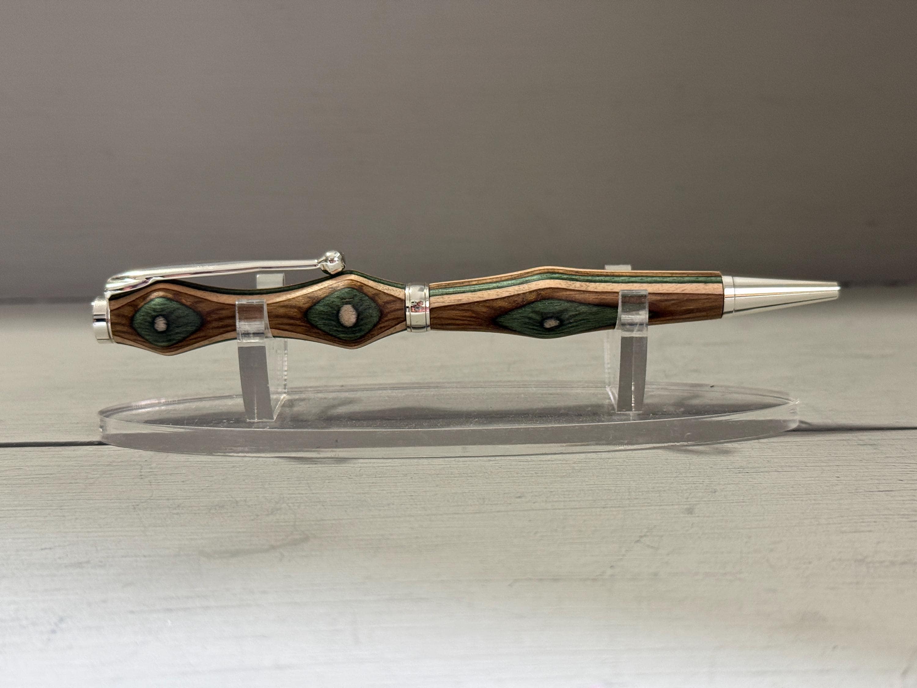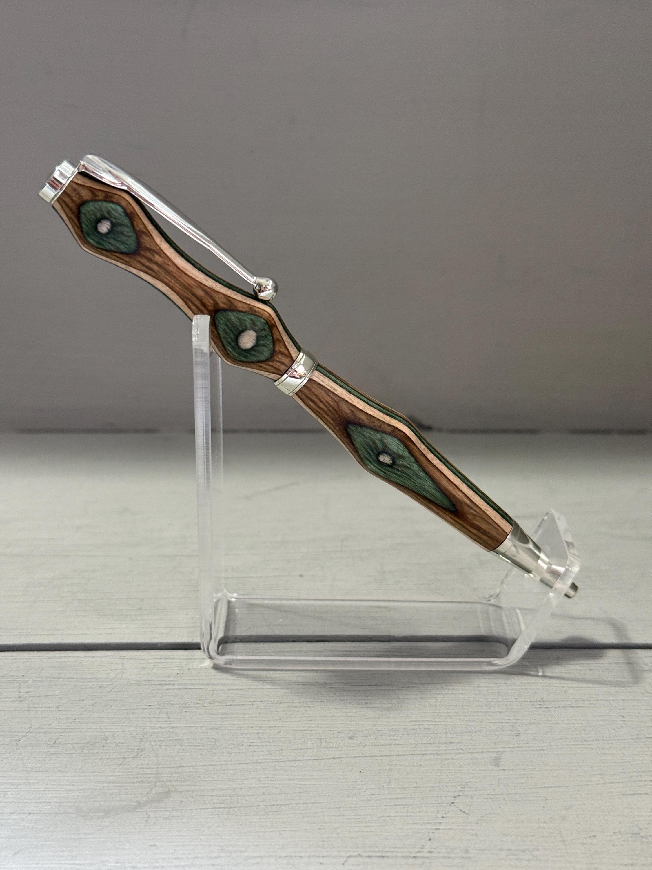 Add a touch of outdoorsy charm to your everyday writing with this handcrafted Slim Style Pen, turned from Green Mountain Camo Spectraply. With its layered tones of green, brown, and tan, this pen brings a natural, woodsy character to your desk or pocket. Finished in sleek silver chrome trim, it’s a perfect blend of rugged style and polished elegance.