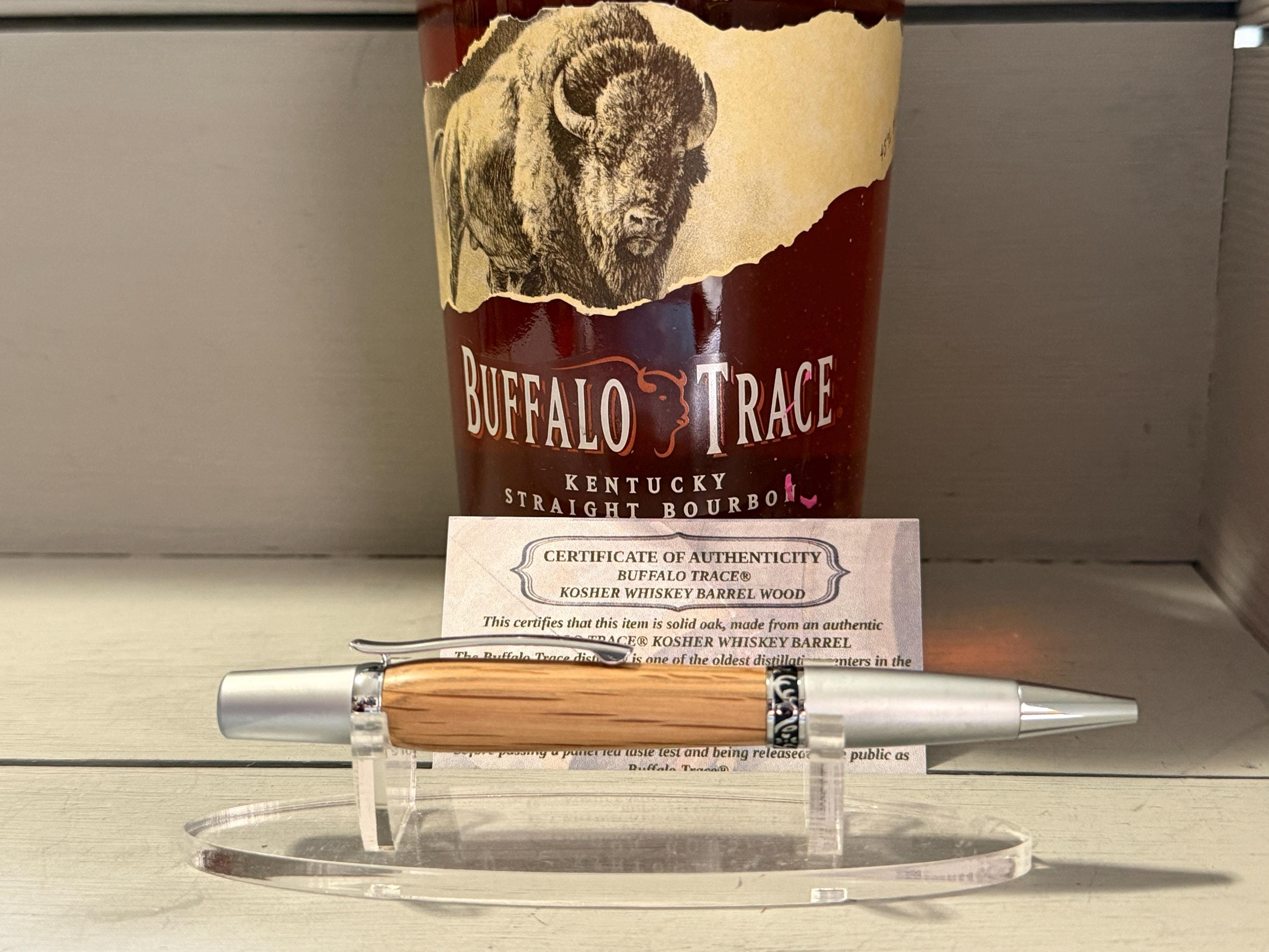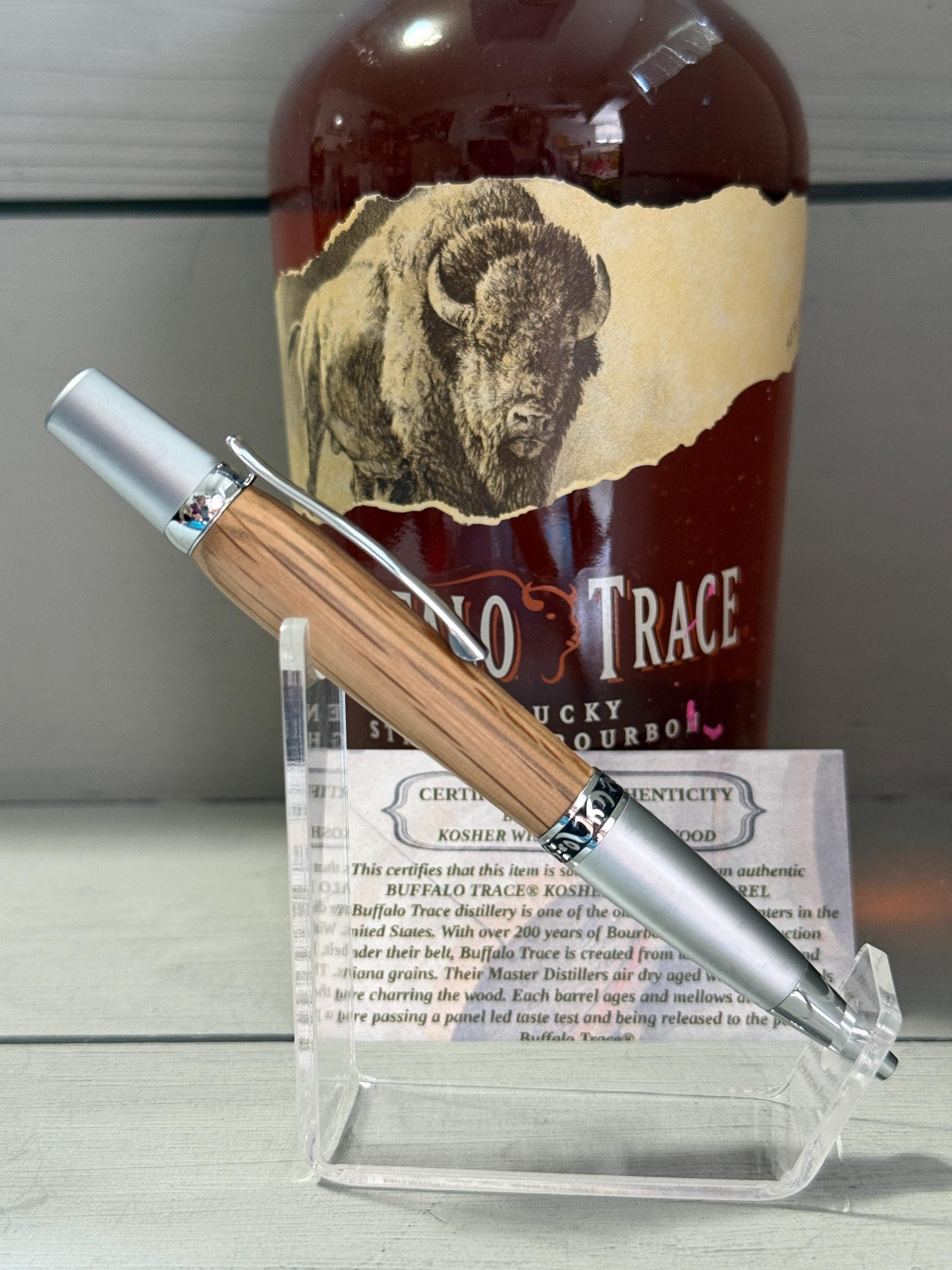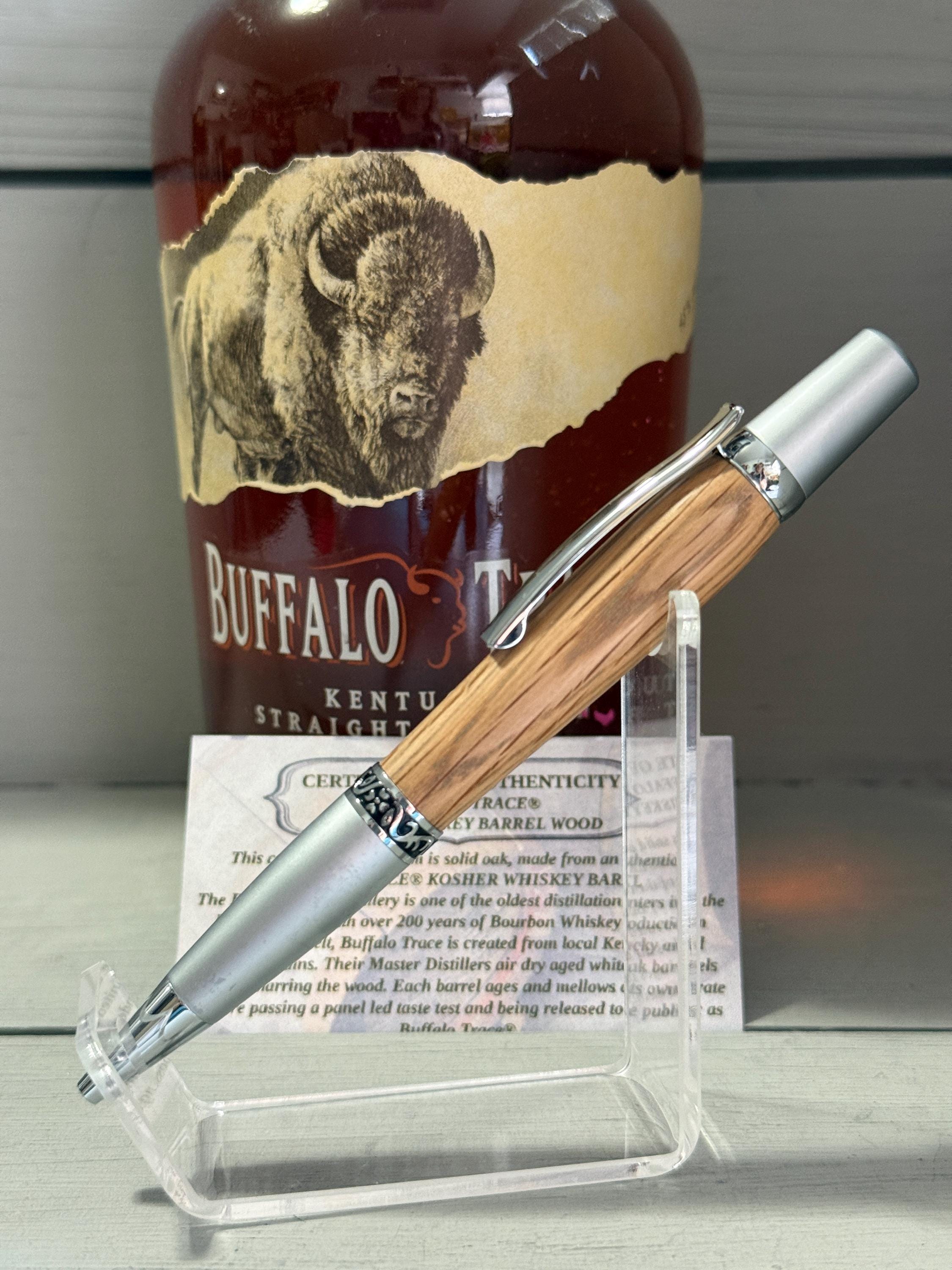 Handcrafted by Gayle Akerman at Lathe Life Creations, The Satin Buffalo is an elegant Wall Street II pen made from certified Buffalo Trace® Kosher Whiskey Barrel wood. With its rich oak tones and deep, expressive grain, this pen is elevated by sleek Satin Chrome trim, with its filigree—bringing warmth, elegance, and a touch of legacy to your writing experience.