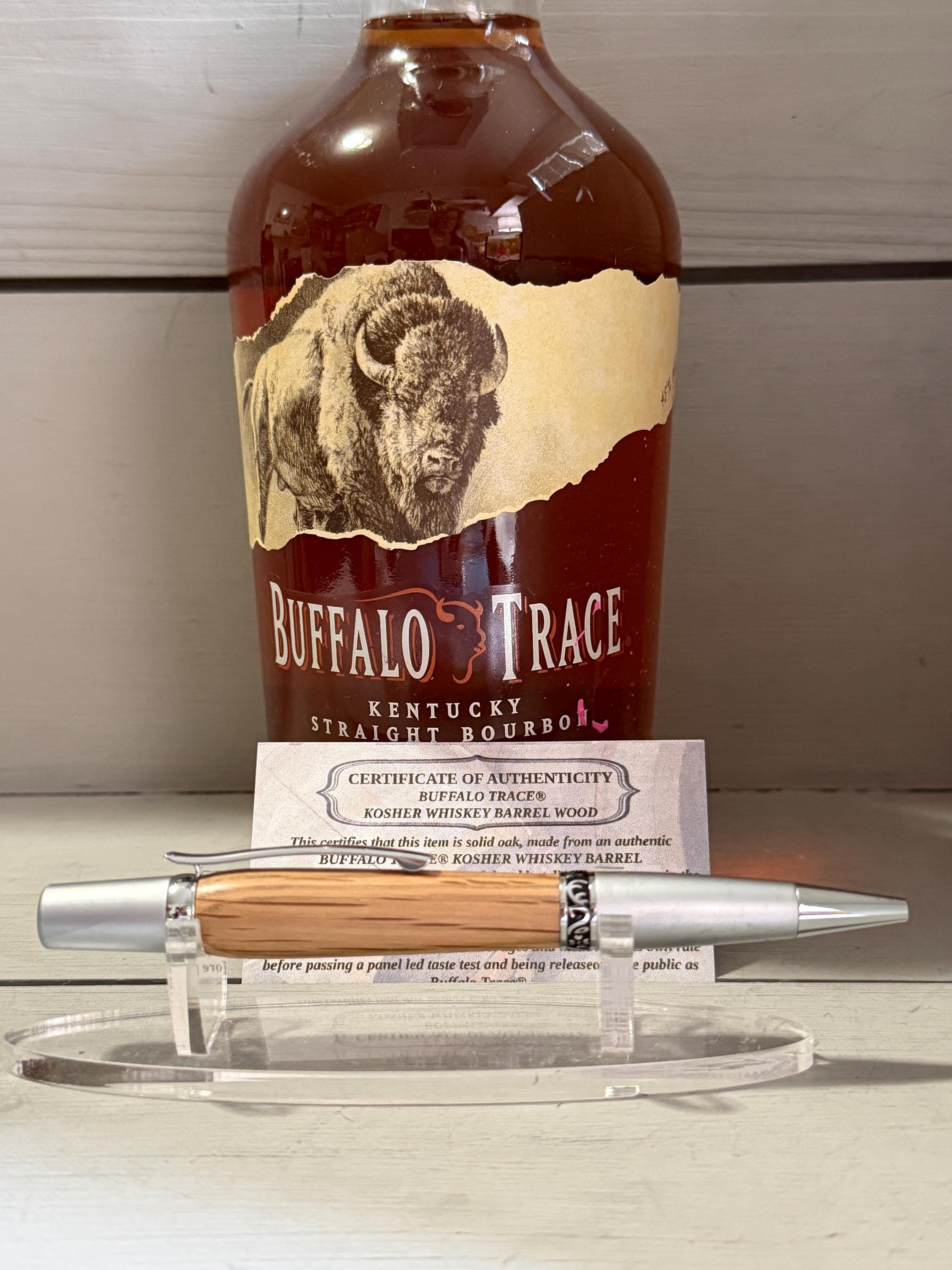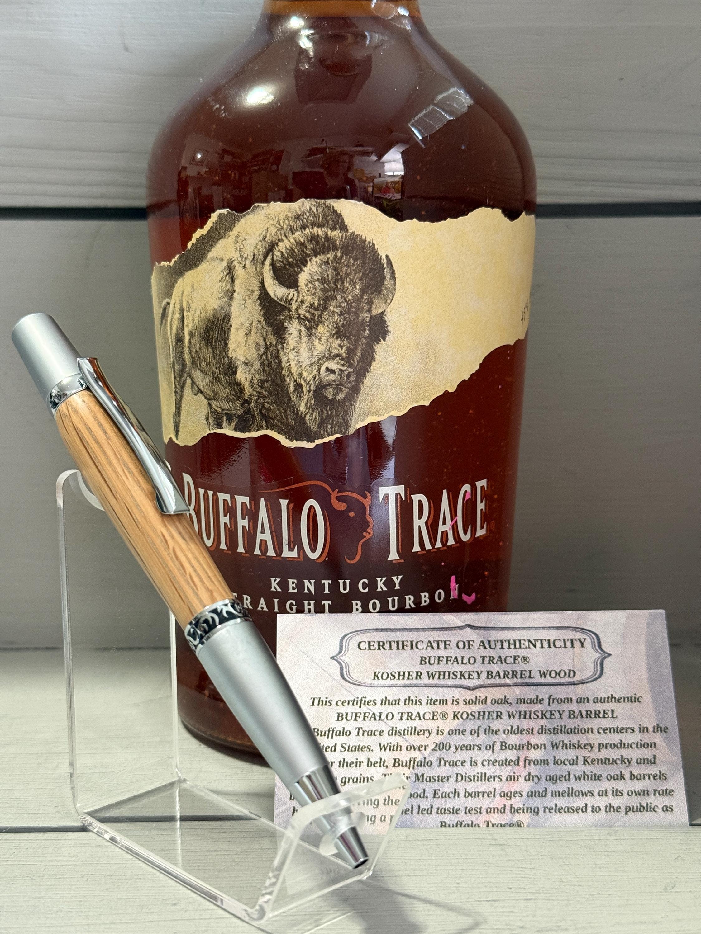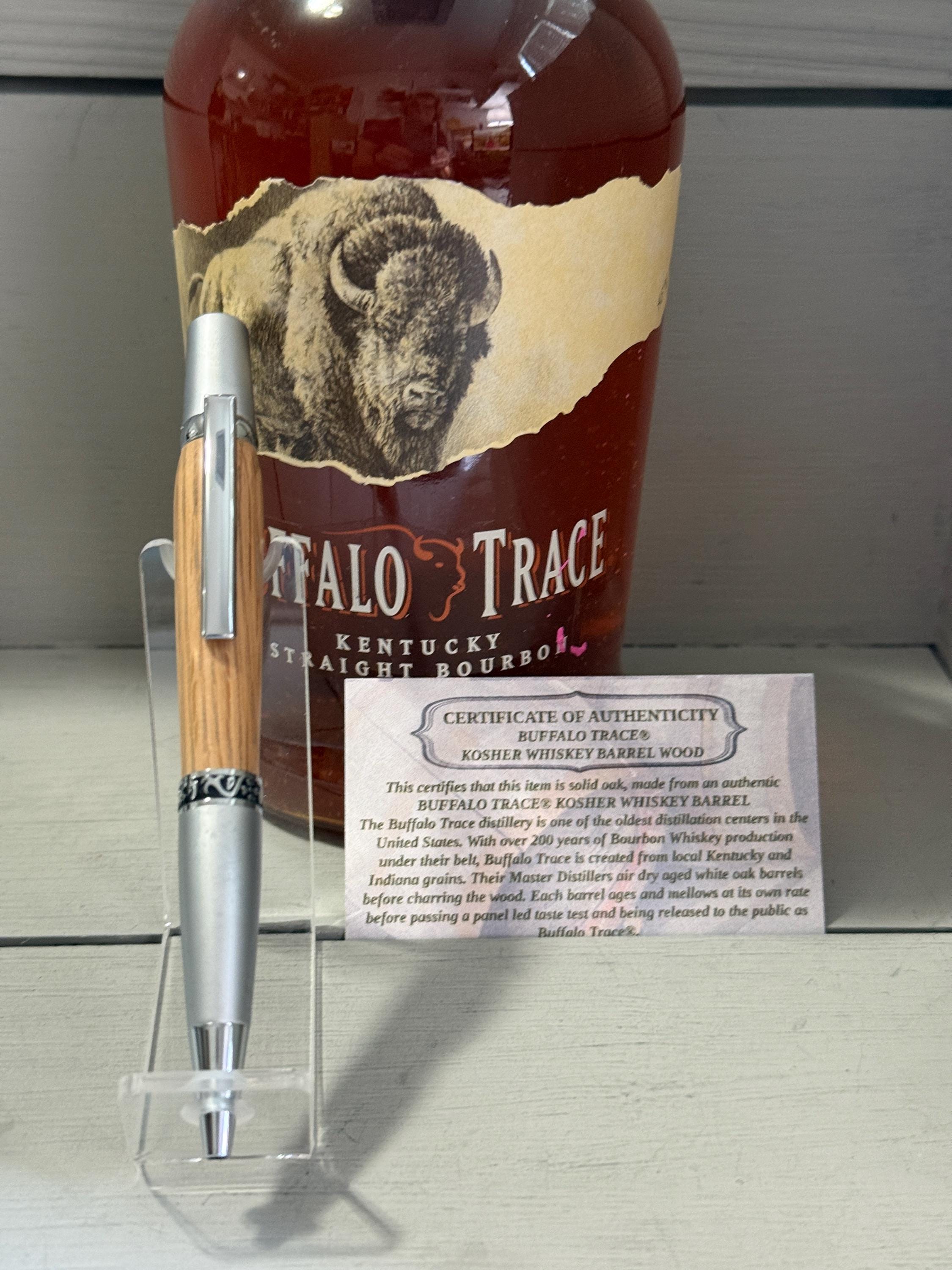 Handcrafted by Gayle Akerman at Lathe Life Creations, The Satin Buffalo is an elegant Wall Street II pen made from certified Buffalo Trace® Kosher Whiskey Barrel wood. With its rich oak tones and deep, expressive grain, this pen is elevated by sleek Satin Chrome trim, with its filigree—bringing warmth, elegance, and a touch of legacy to your writing experience.