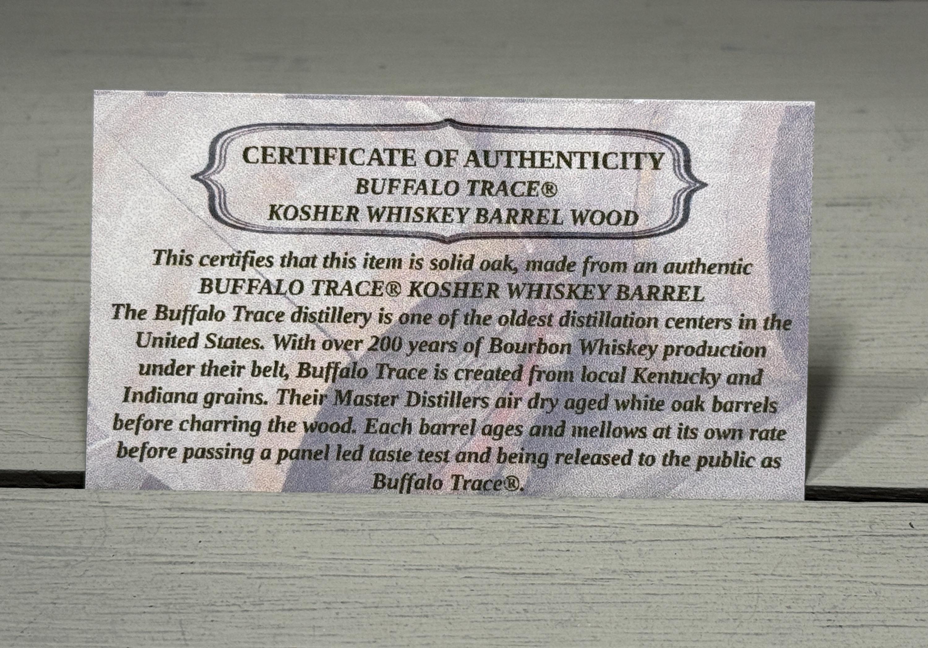 “This certifies that this item is solid oak, made from an authentic BUFFALO TRACE® KOSHER WHISKEY BARREL. The Buffalo Trace® distillery is one of the oldest distillation centers in the United States. With over 200 years of Bourbon Whiskey production under their belt, Buffalo Trace® is created from local Kentucky and Indiana grains. Their Master Distillers air dry aged white oak barrels before charring the wood. Each barrel ages and mellows at its own rate before passing a panel led taste test and being released to the public as Buffalo Trace®.”