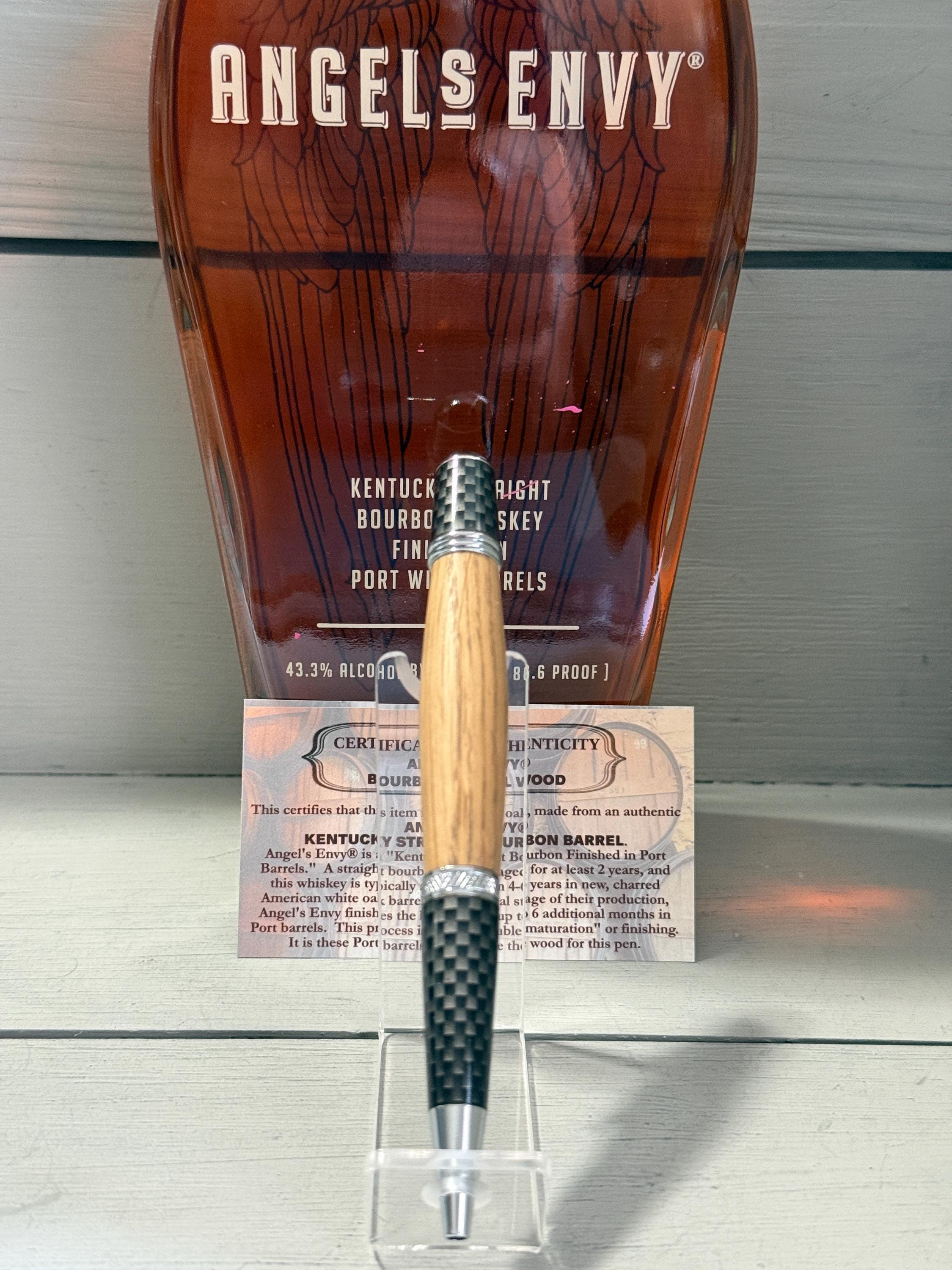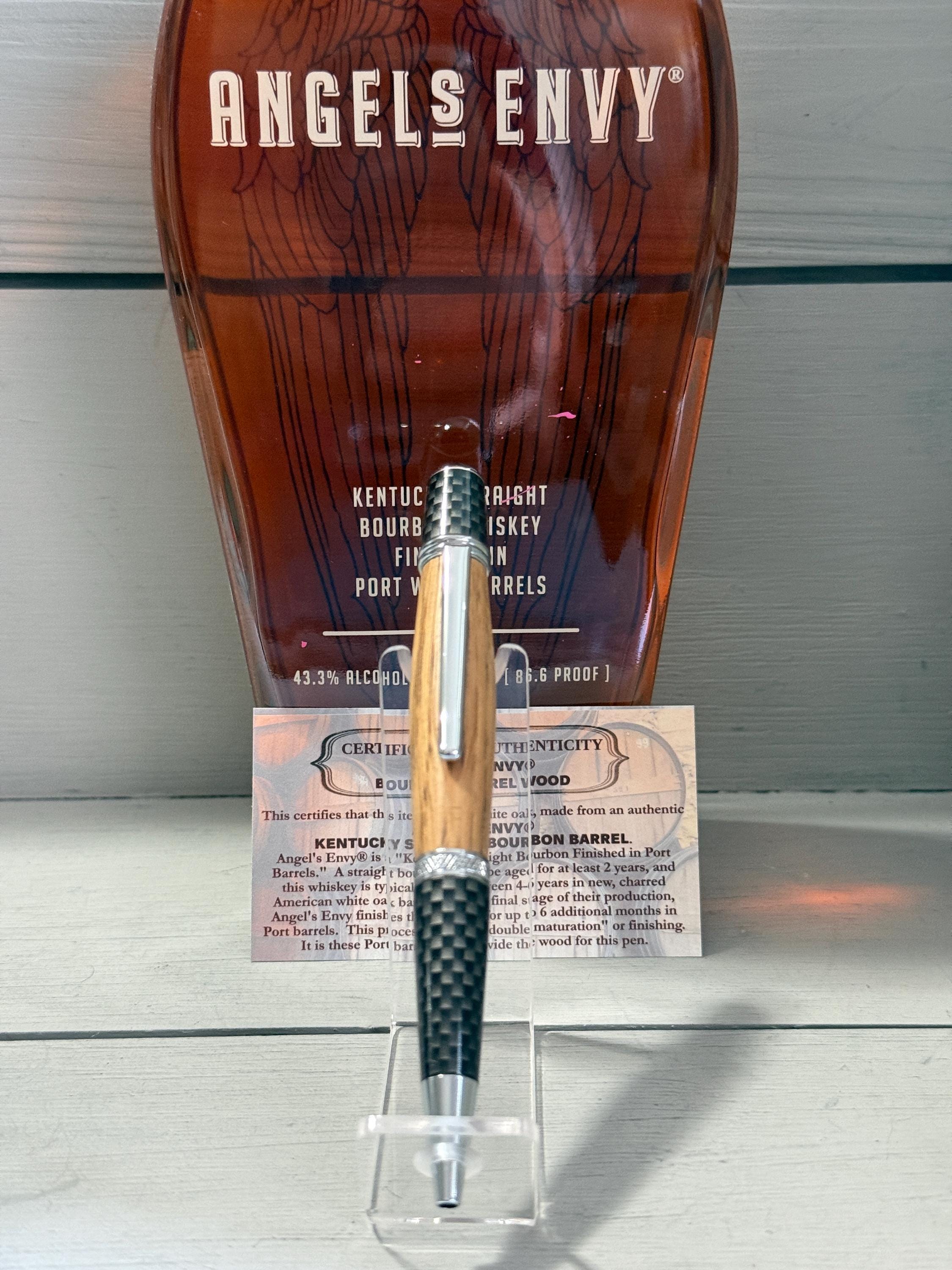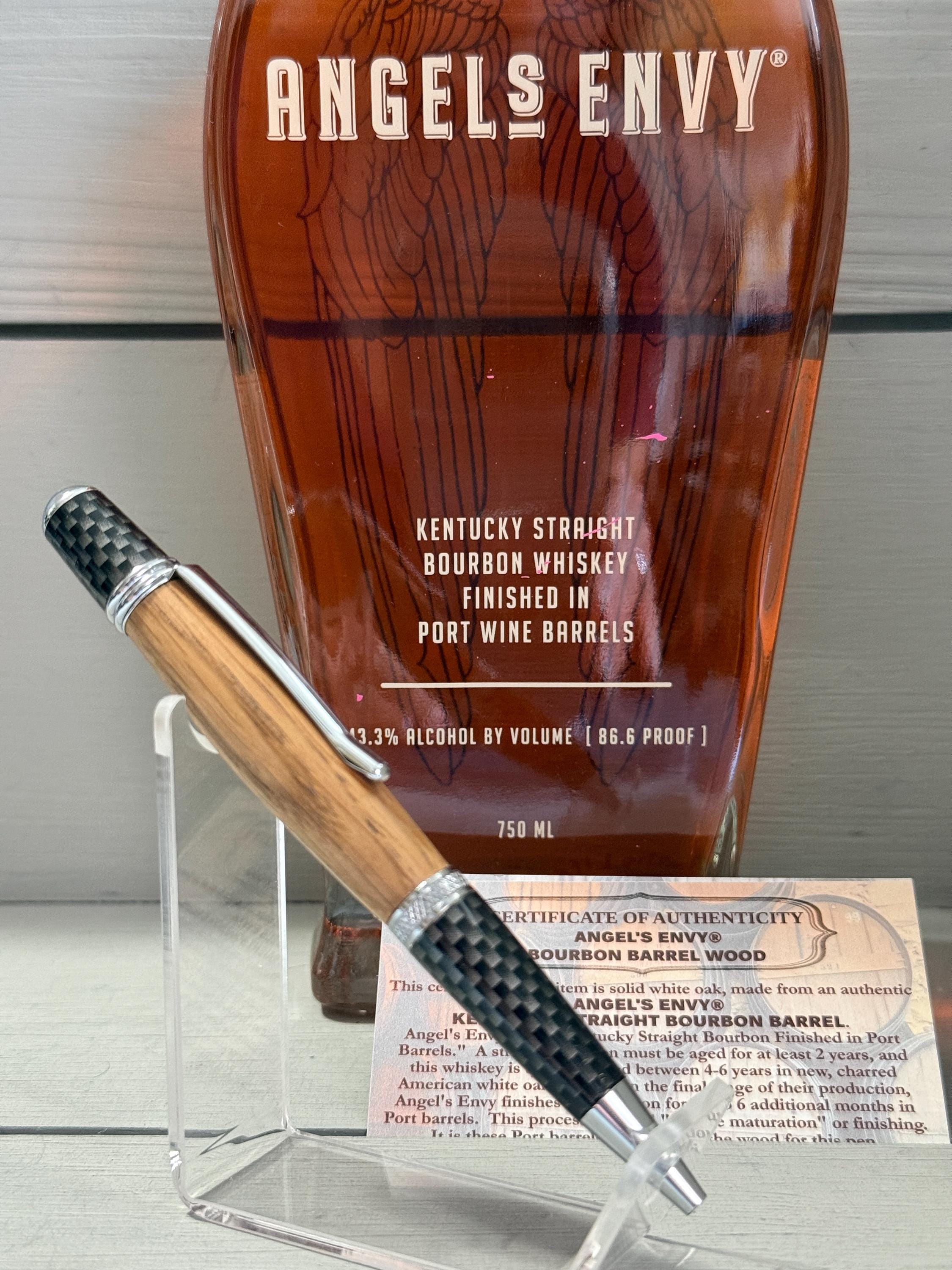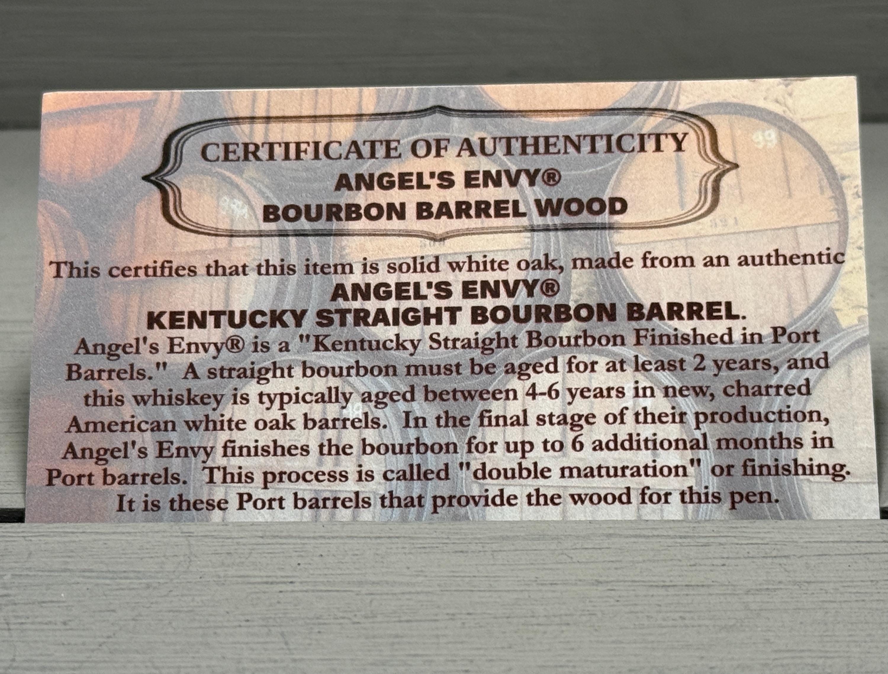 “This certifies that this item is solid white oak, made from an authentic ANGEL'S ENVY® KENTUCKY STRAIGHT BOURBON BARREL. Angel’s Envy is a Kentucky Straight Bourbon Finished in Port Barrels. A straight bourbon must be aged for at least 2 years, and this whiskey is typically aged between 4–6 years in new, charred American white oak barrels. In the final stage of production, Angel’s Envy finishes the bourbon for up to 6 additional months in Port barrels. This process is called ‘double maturation’ or ‘finishing’. It is these Port barrels that provide the wood for this pen.”