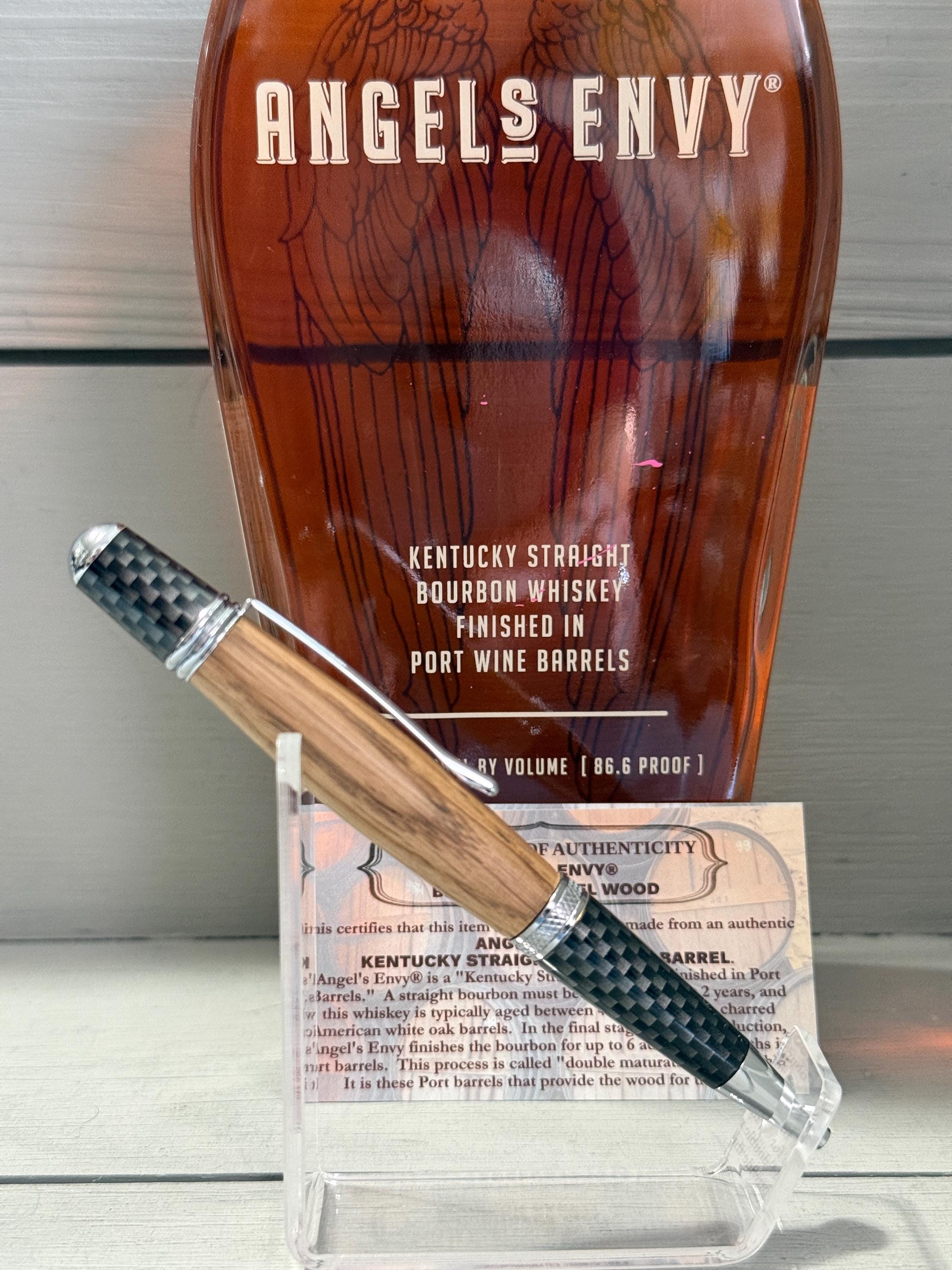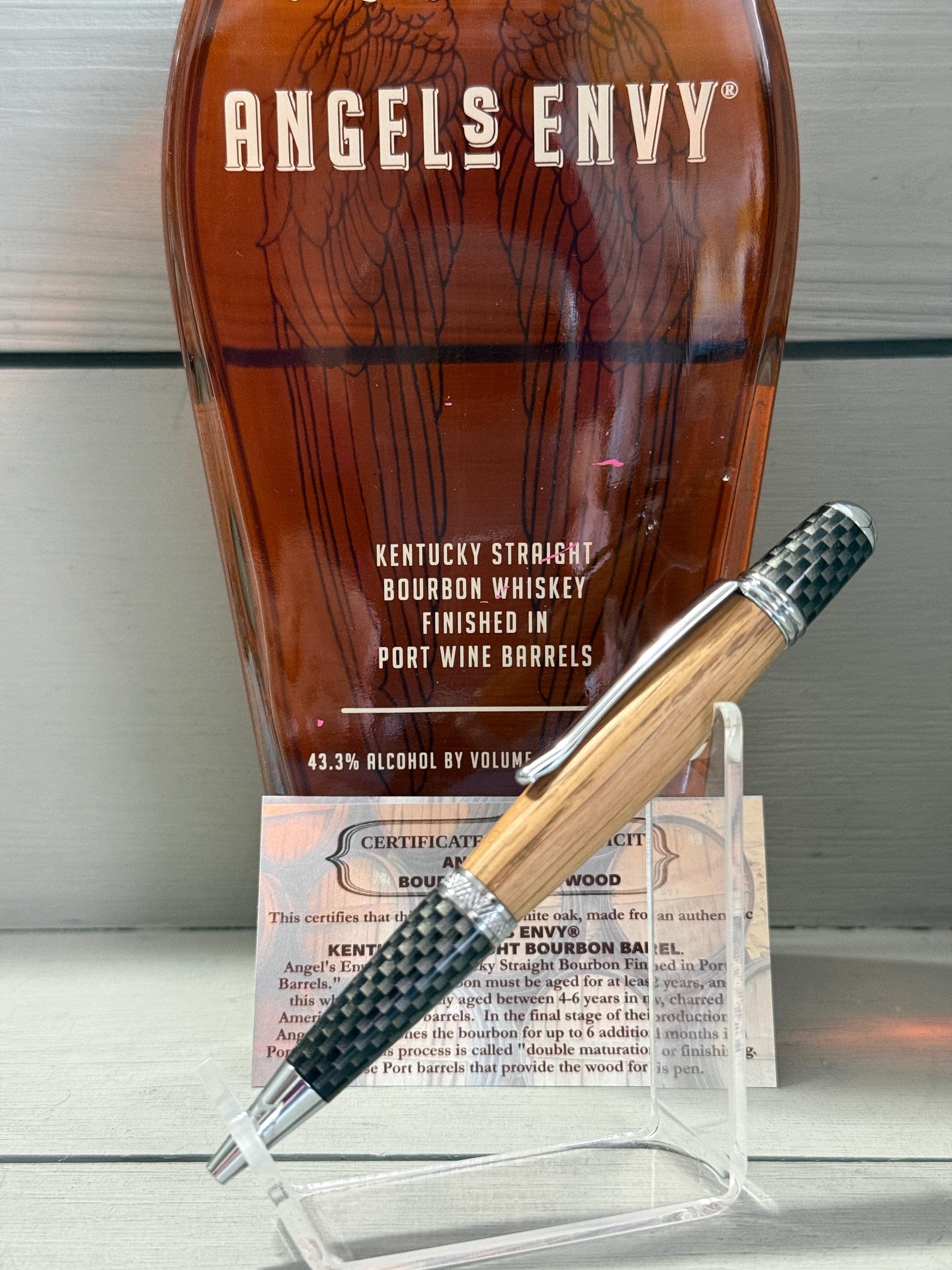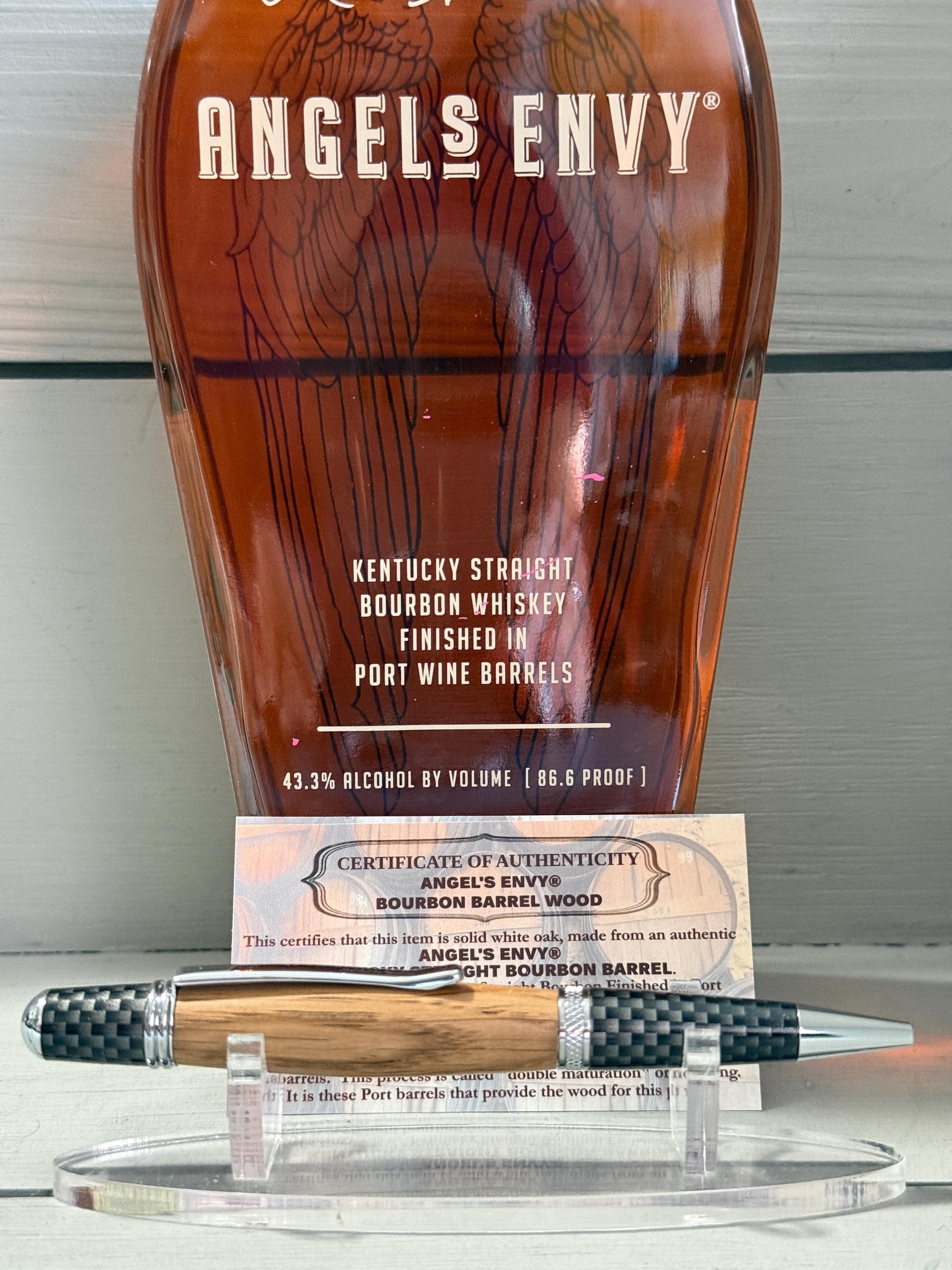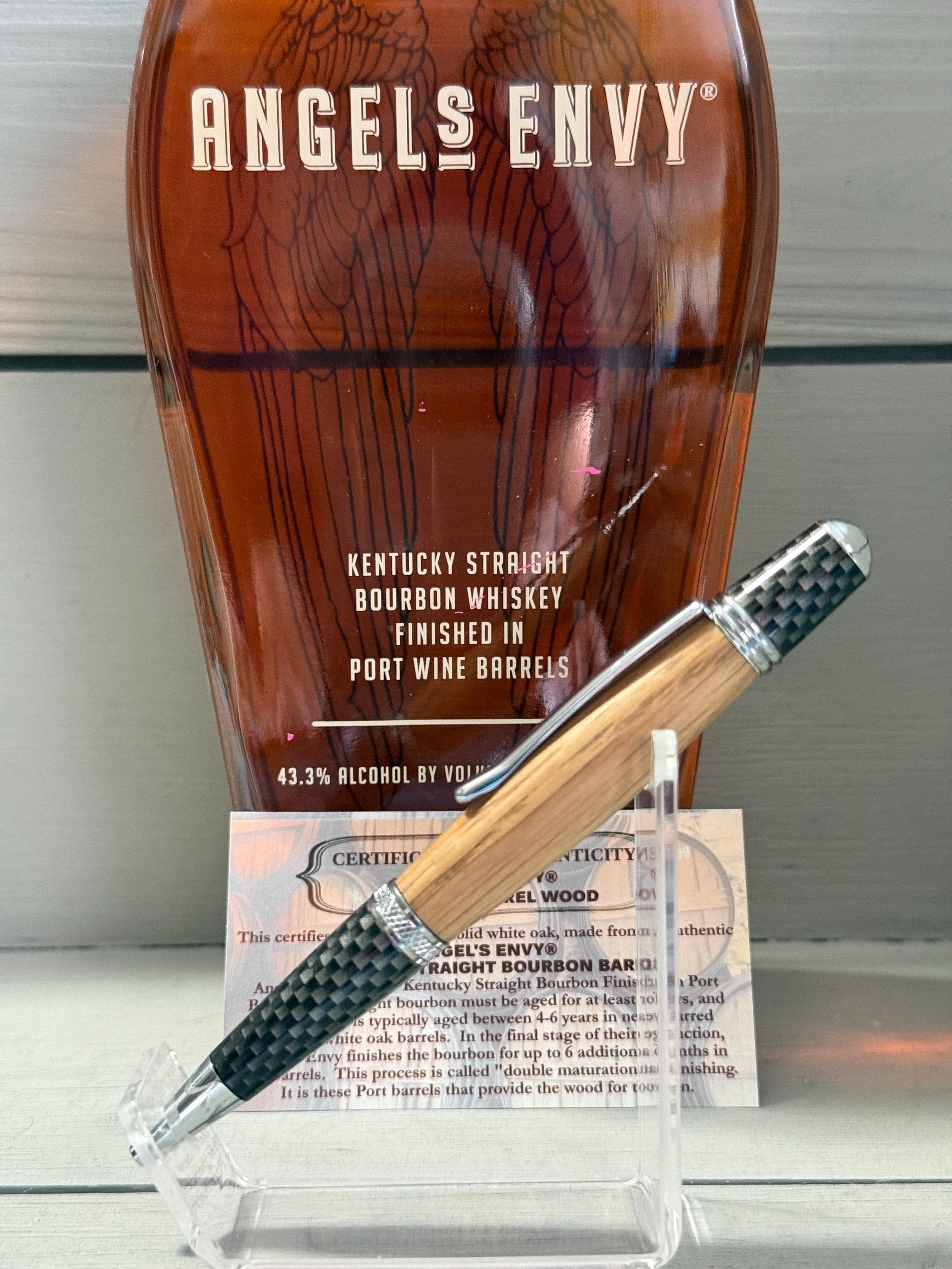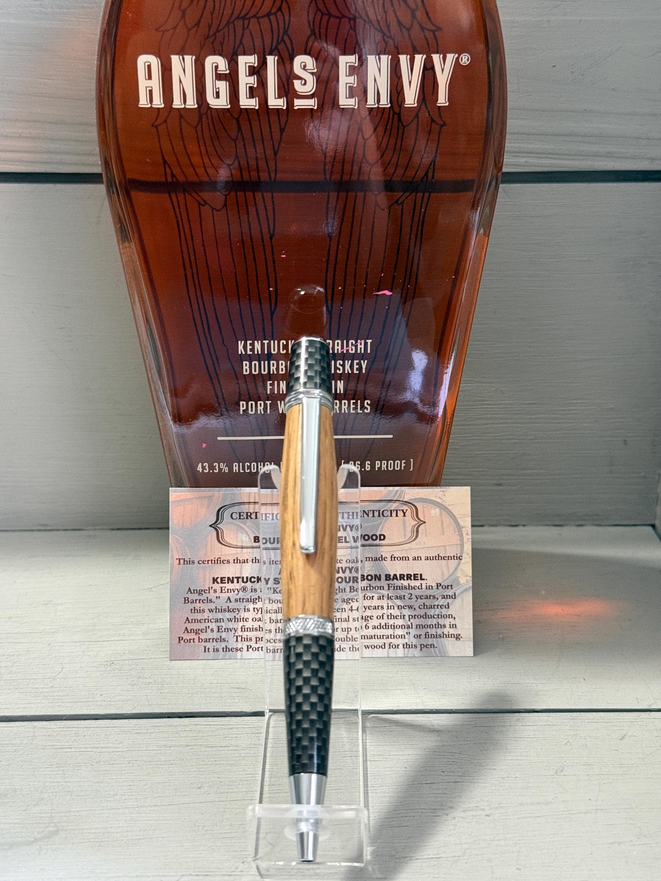 “This certifies that this item is solid white oak, made from an authentic ANGEL'S ENVY® KENTUCKY STRAIGHT BOURBON BARREL. Angel’s Envy is a Kentucky Straight Bourbon Finished in Port Barrels. A straight bourbon must be aged for at least 2 years, and this whiskey is typically aged between 4–6 years in new, charred American white oak barrels. In the final stage of production, Angel’s Envy finishes the bourbon for up to 6 additional months in Port barrels. This process is called ‘double maturation’ or ‘finishing’. It is these Port barrels that provide the wood for this pen.”