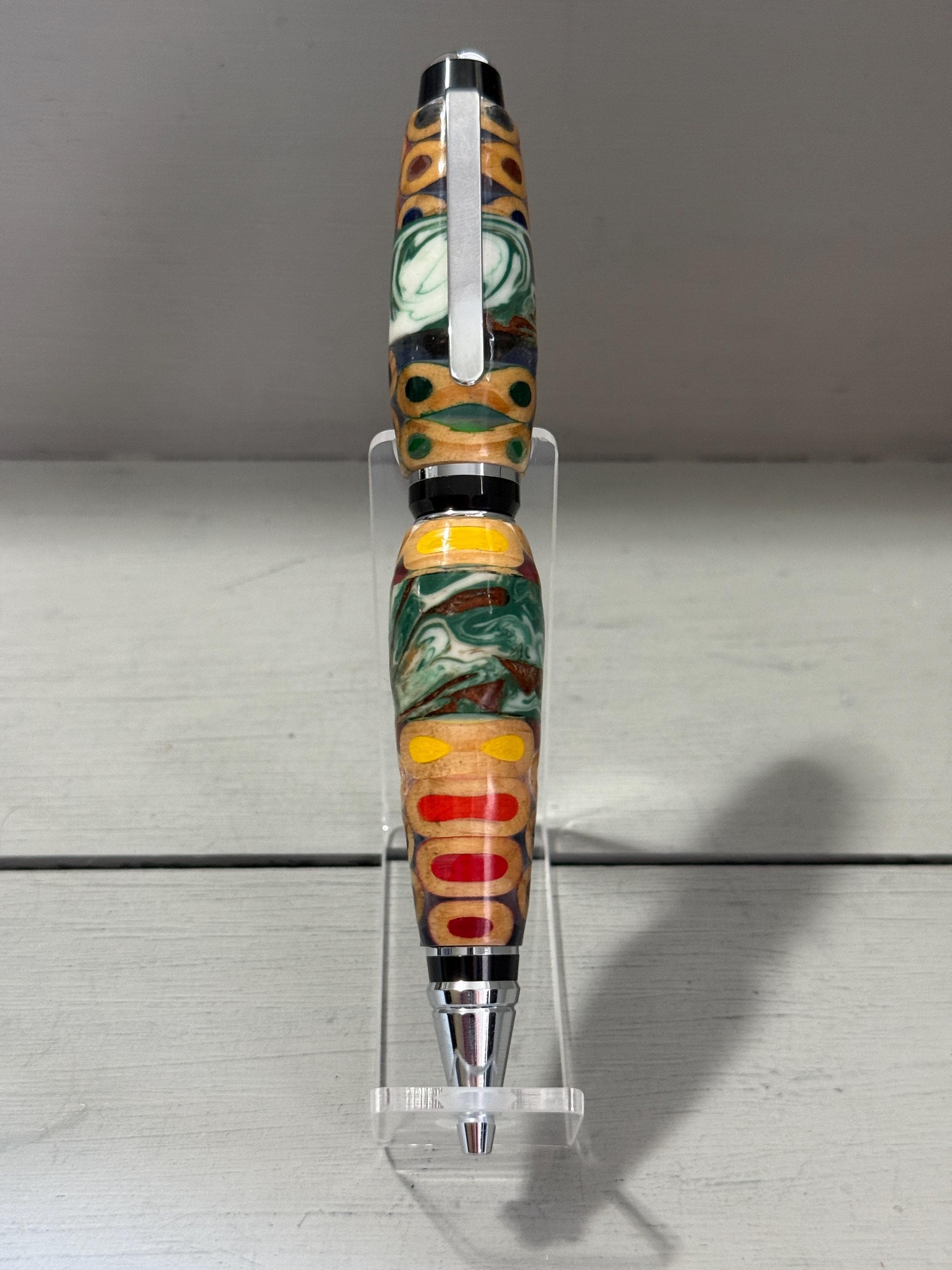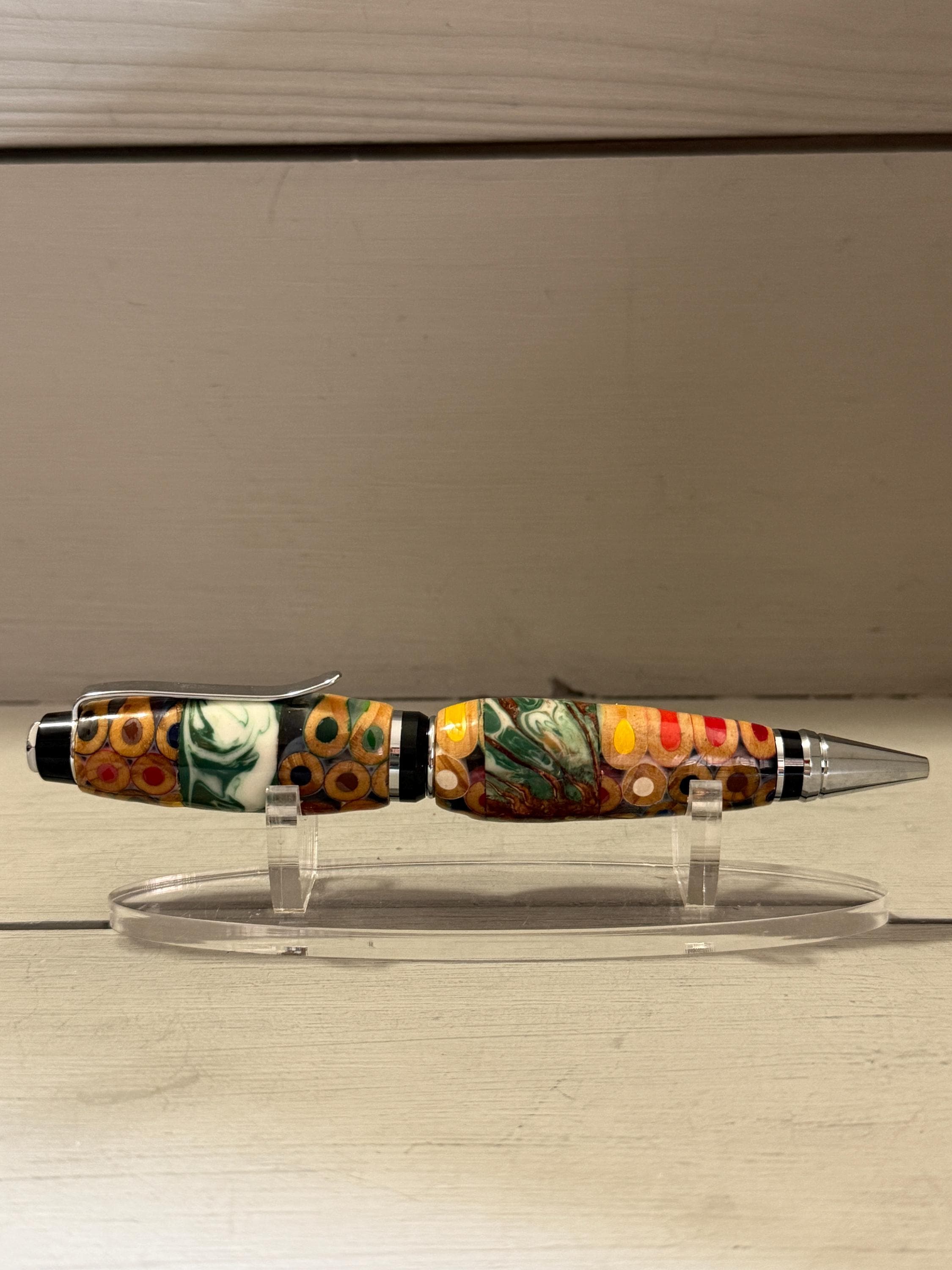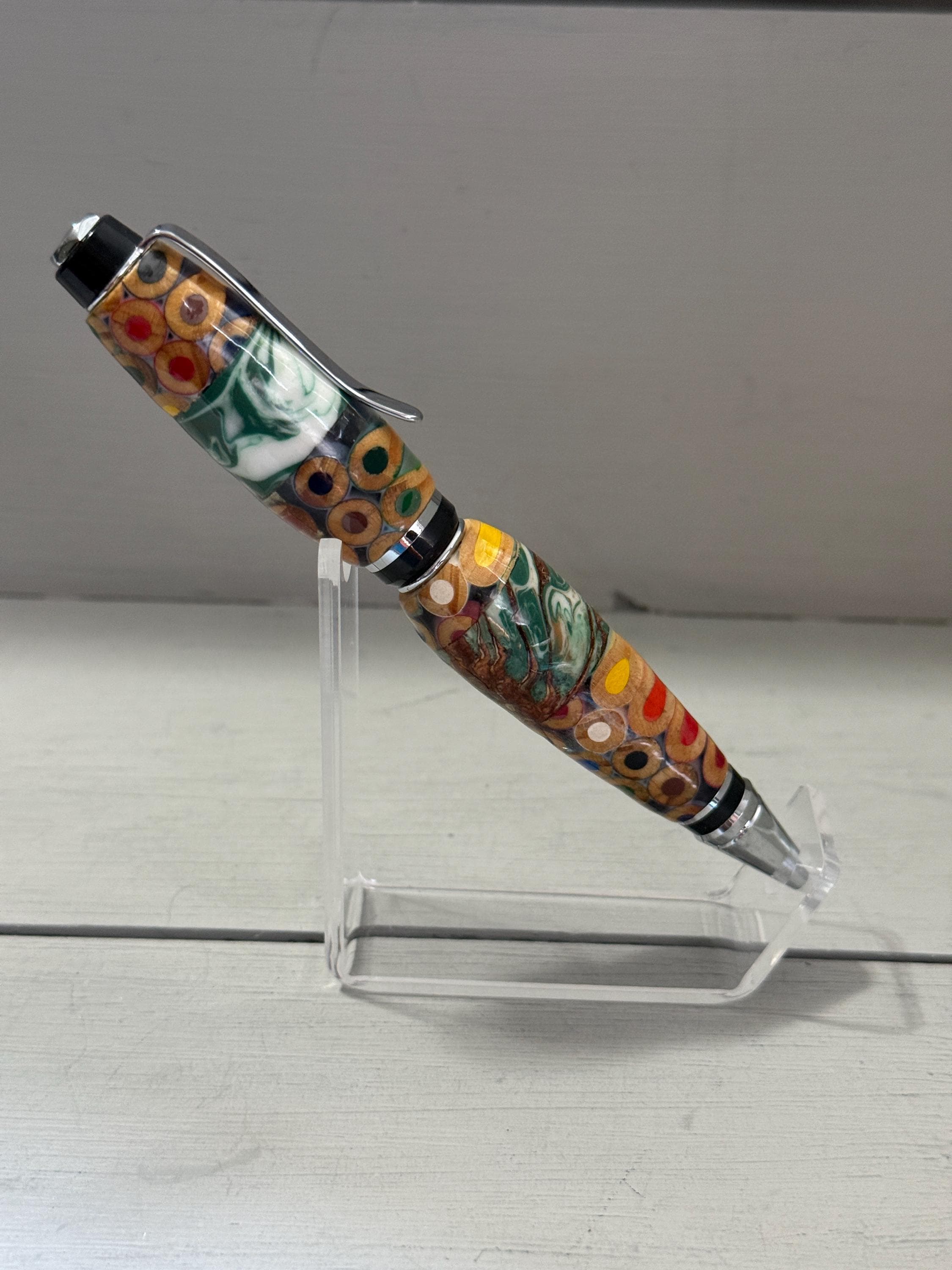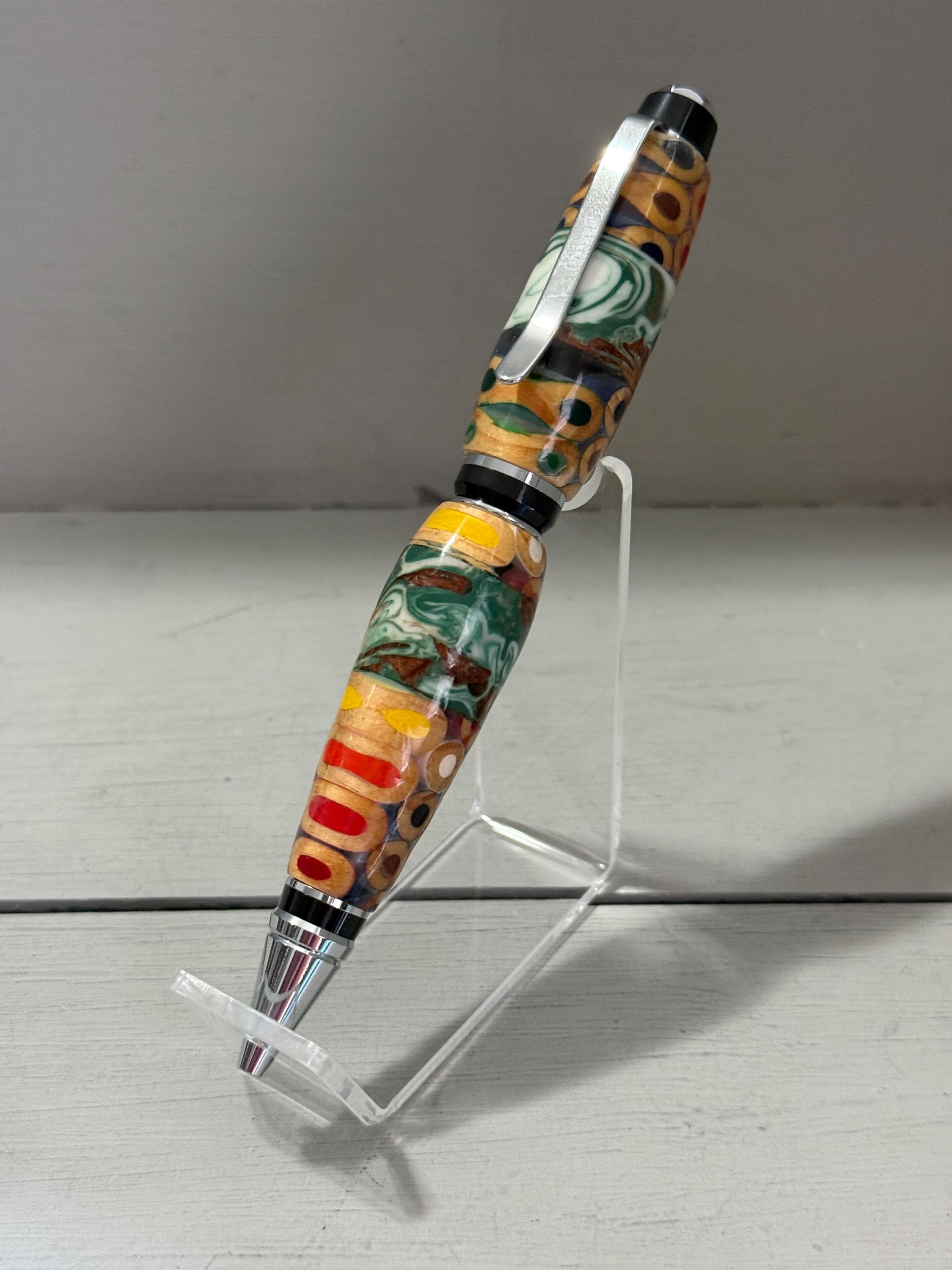 Turned and finished by hand in my Raleigh, NC studio, this pen features a bold cigar profile that feels substantial and comfortable in the hand. The silver‑tone hardware adds a clean, modern contrast to the lively body, making this piece both playful and refined.