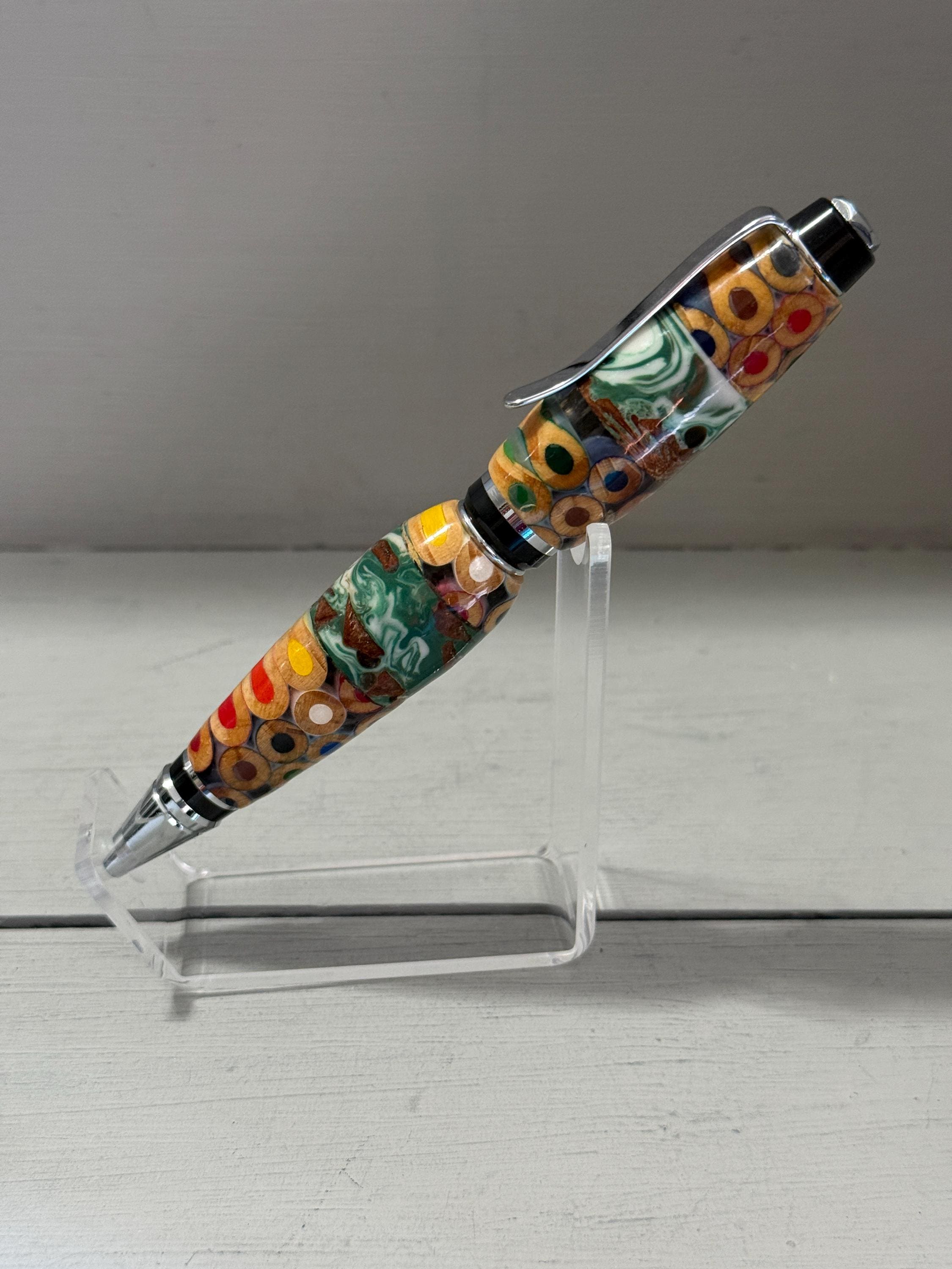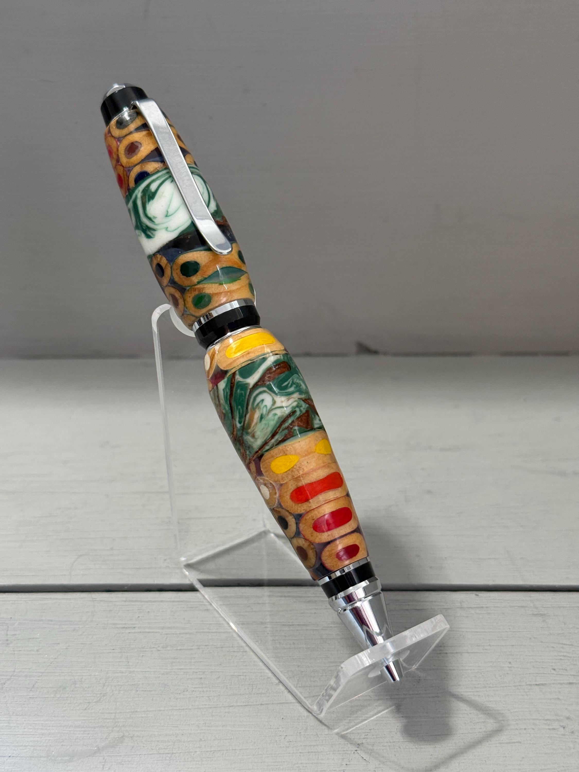 Celebrate the meeting of nature and creativity with the Pine & Palette Cigar‑Style Pen, handcrafted from embedded pine cones and hand‑set colored pencils. This striking combination creates a vibrant, organic mosaic — a pen full of texture, color, and personality.