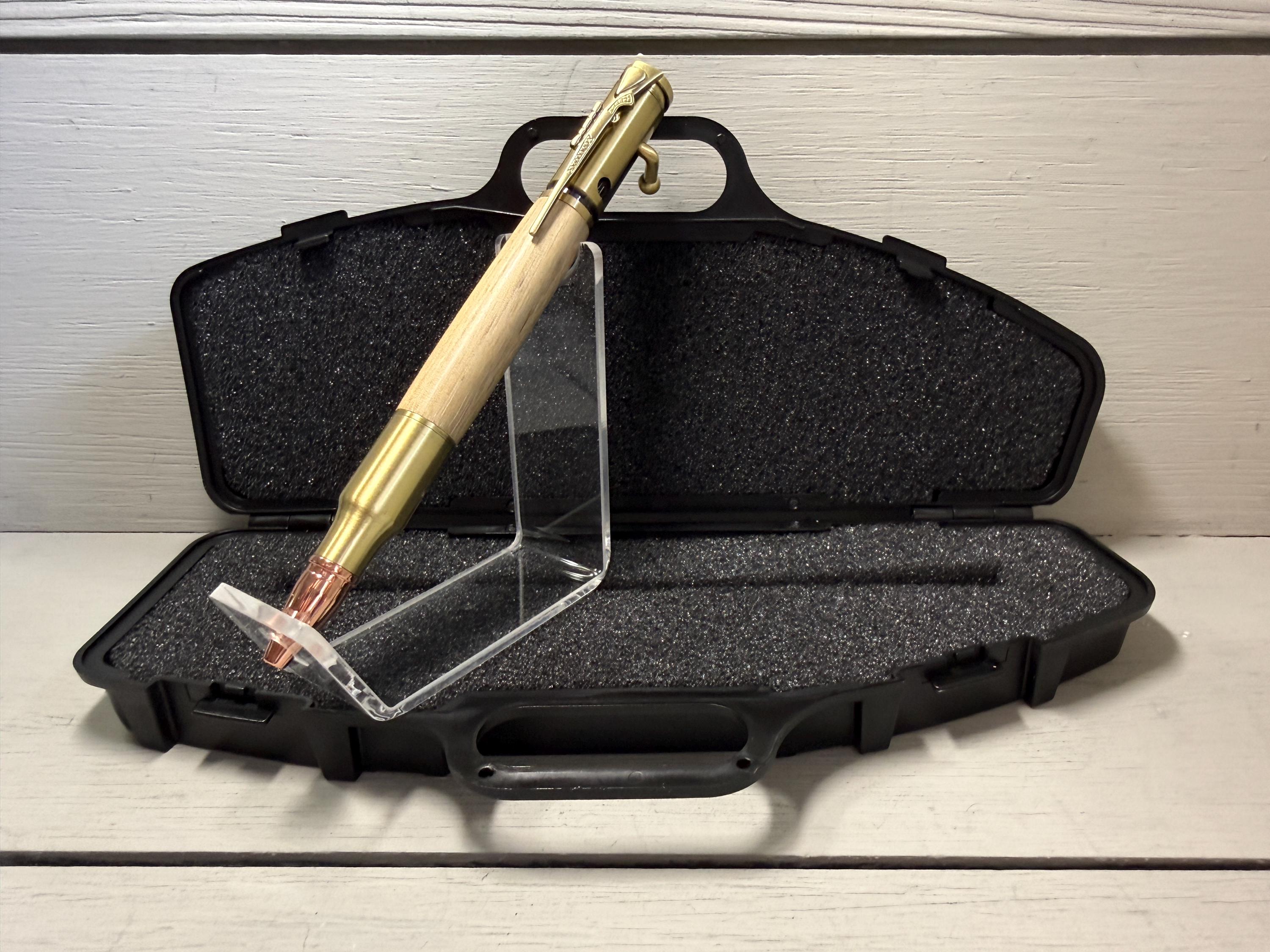 Every detail, from the one of a kind bolt action mechanism to the precision engineered components, was carefully designed to ensure uniqueness and reliability. The realistic bolt-action handle smoothly advances and retracts to securely lock the refill in place. Includes a bolt action rifle clip and a replica 30 caliber cartridge and rose gold bullet tip for added authenticity. The unique NC Black Walnut body adds the perfect finish to this most exquisite pen!