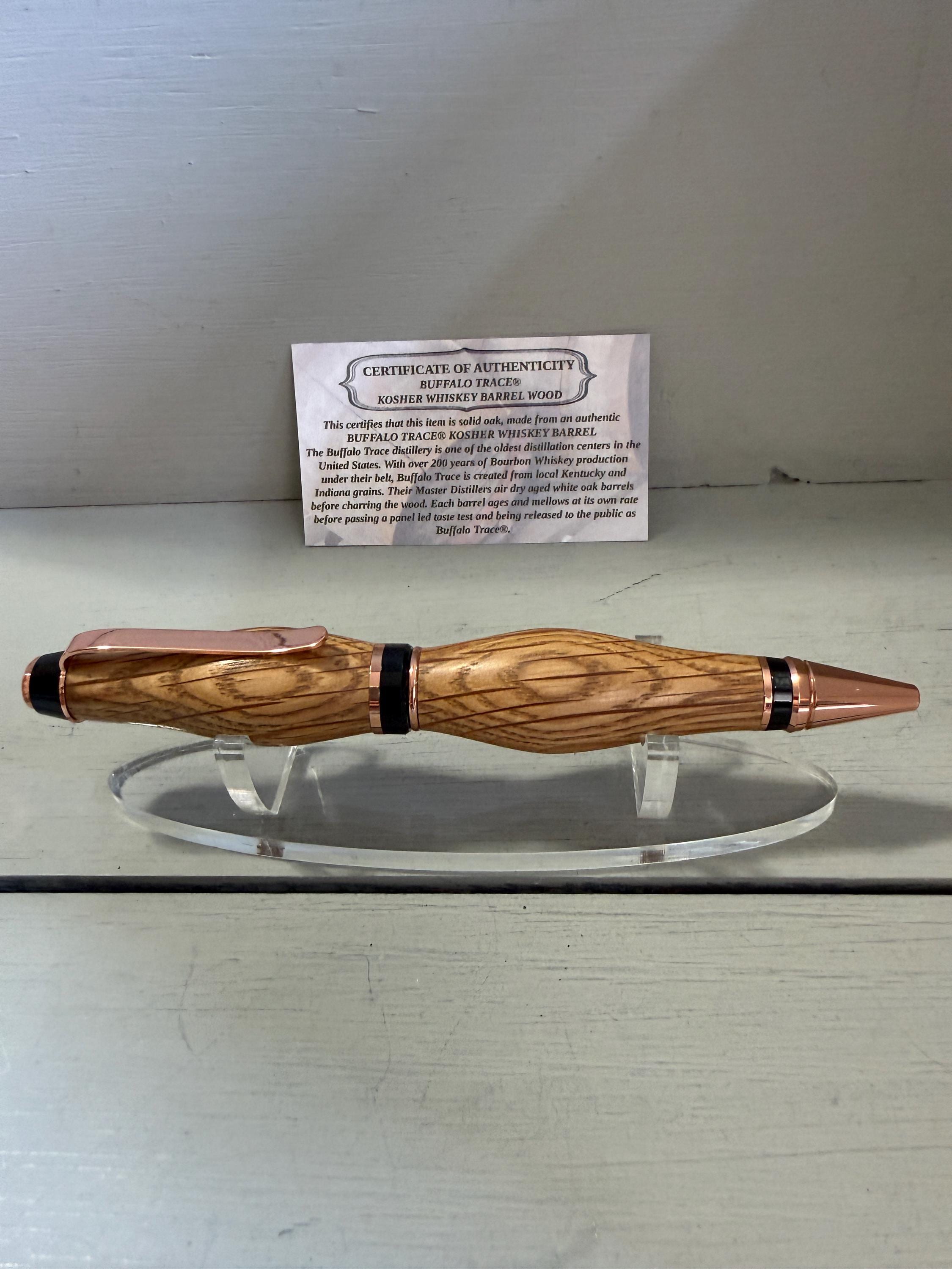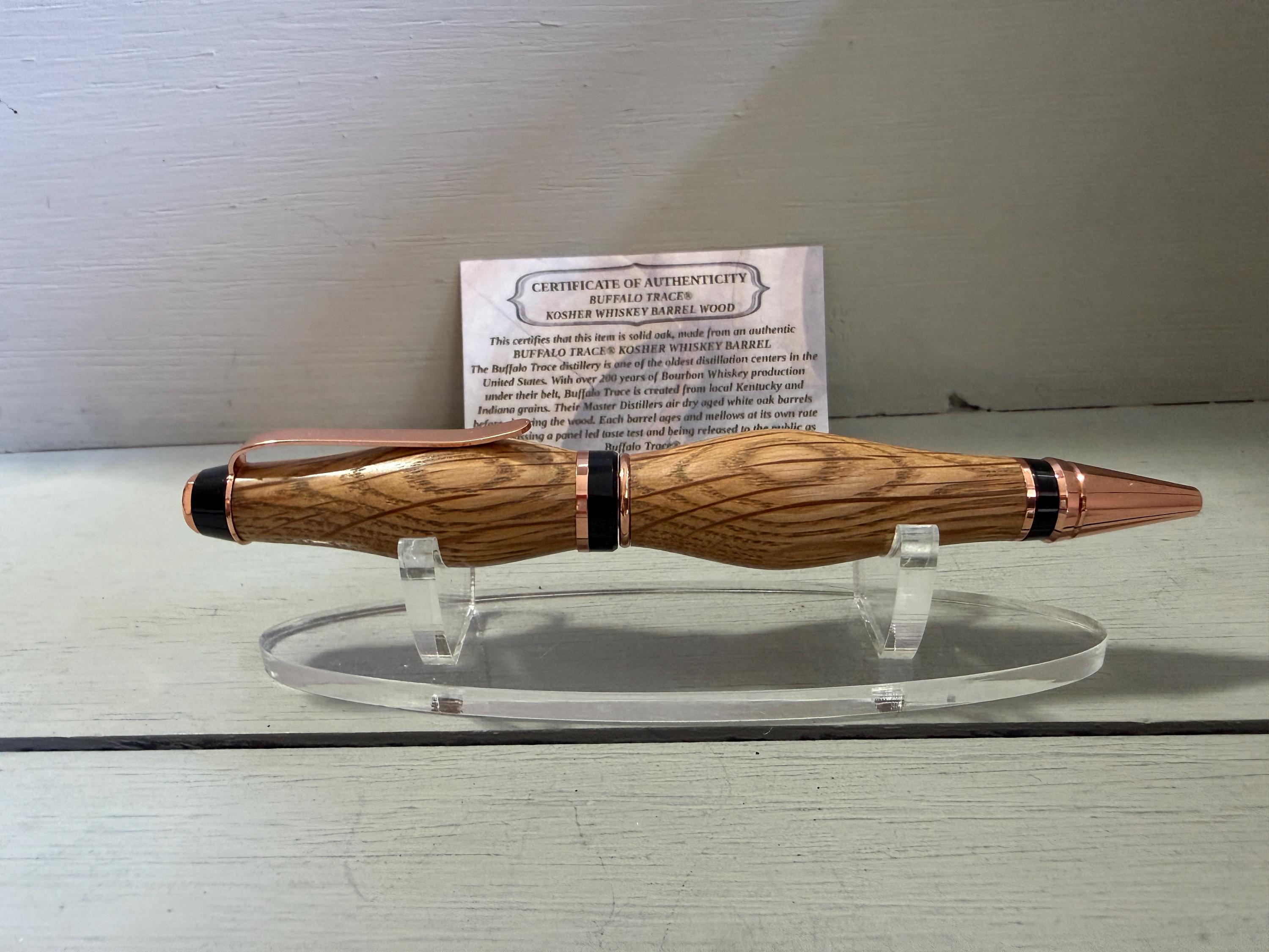 The Curvy Copper Buffalo is a classic Cigar Pen, made of Certified Kosher Buffalo Trace® Oak Whiskey Barrel Wood and is finished with a beautiful copper trim... classic yet very unique. Just the like drink itself, the barrel wood used to distill this awesome whiskey turns so smooth!! When turned into the perfect shape, like this pen, not only does it look good but it also feels good in your hand. This pen will be the envy of many, especially those who know what a fine writing instrument truly is. Made with quality craftsmanship, this pen is "a unique piece of art"!