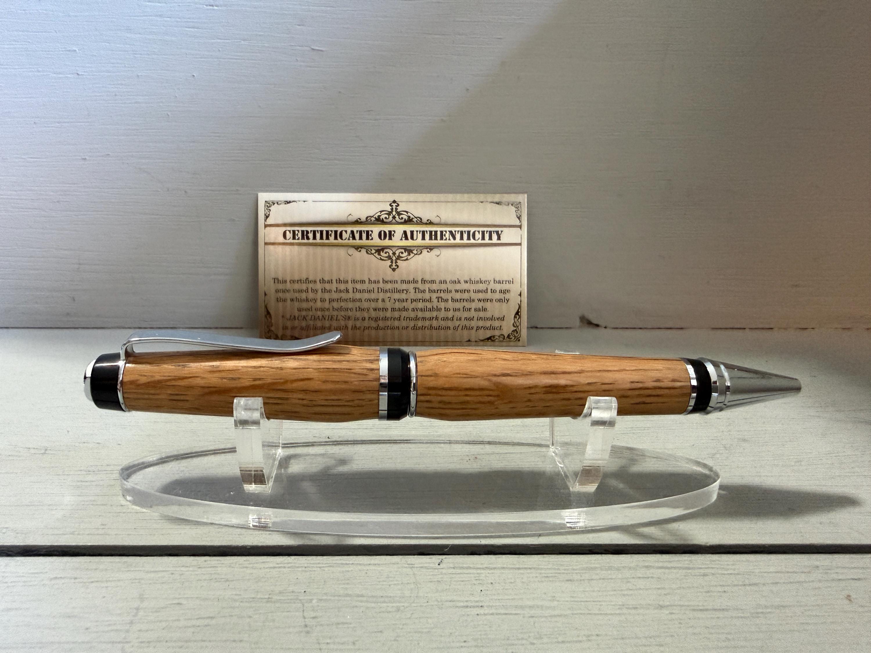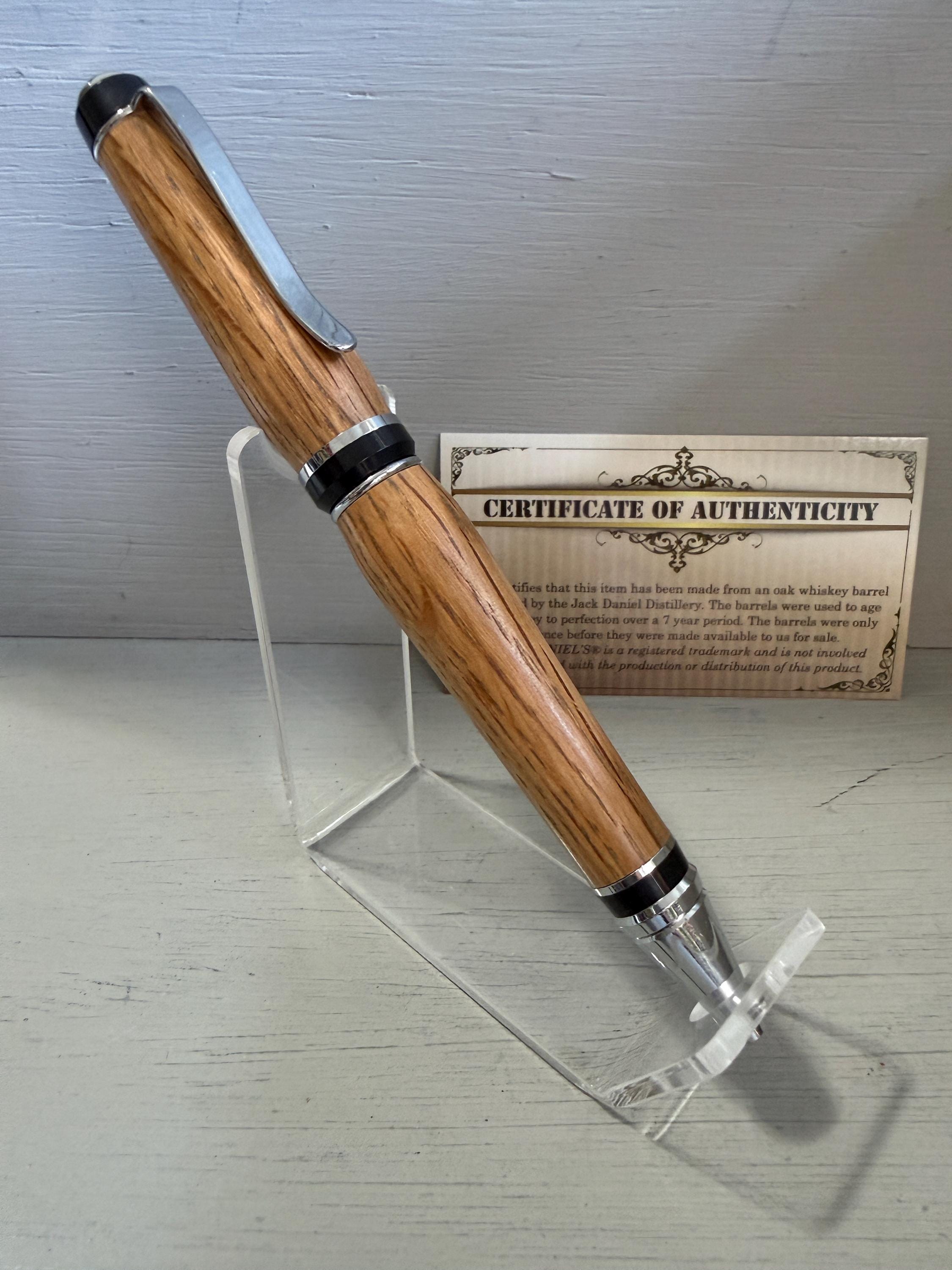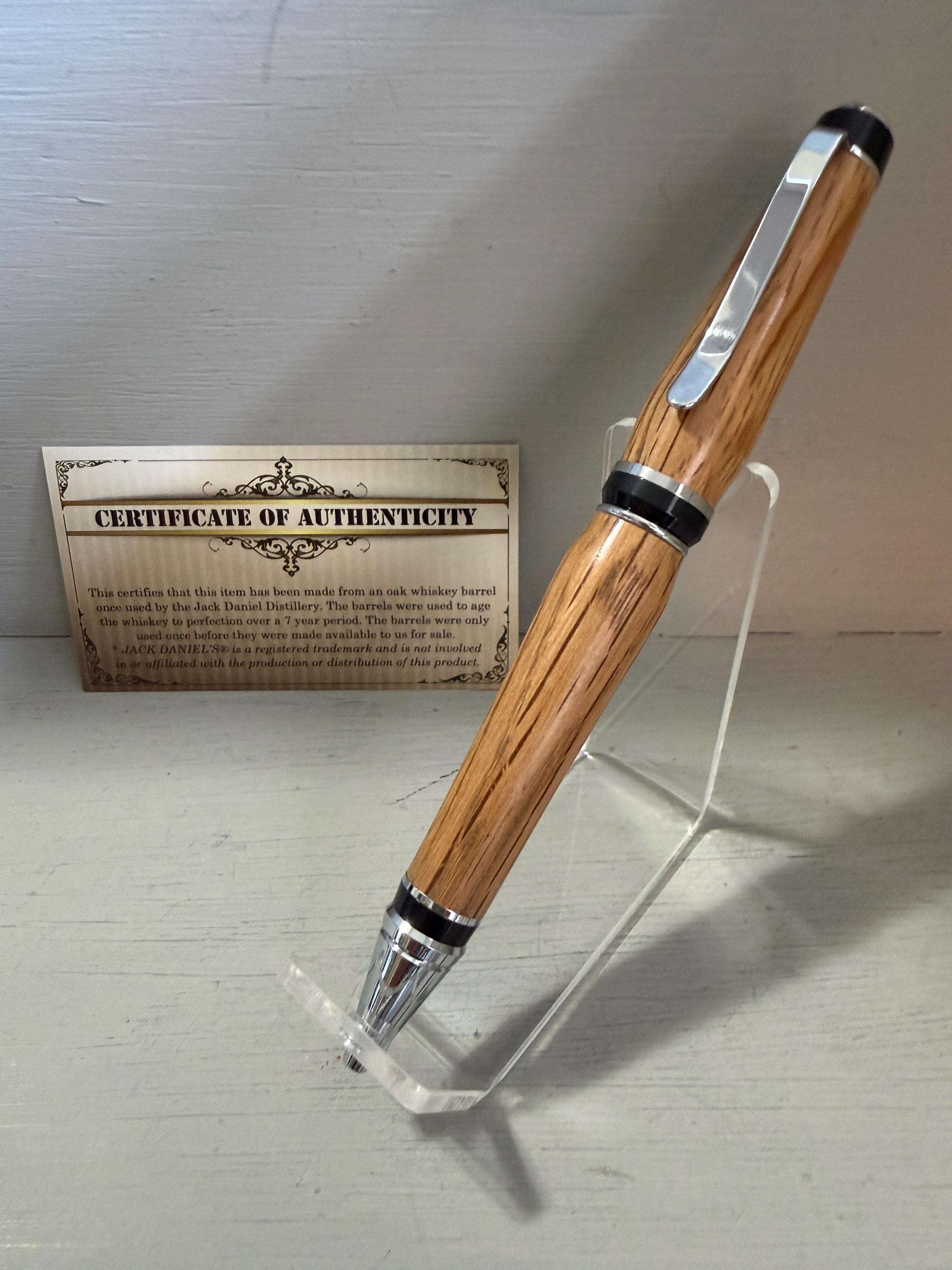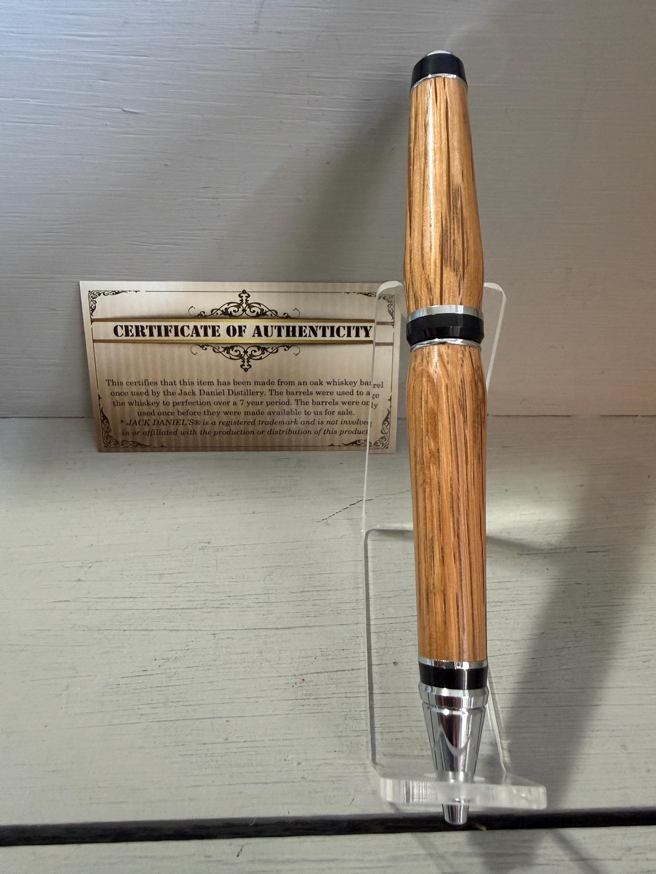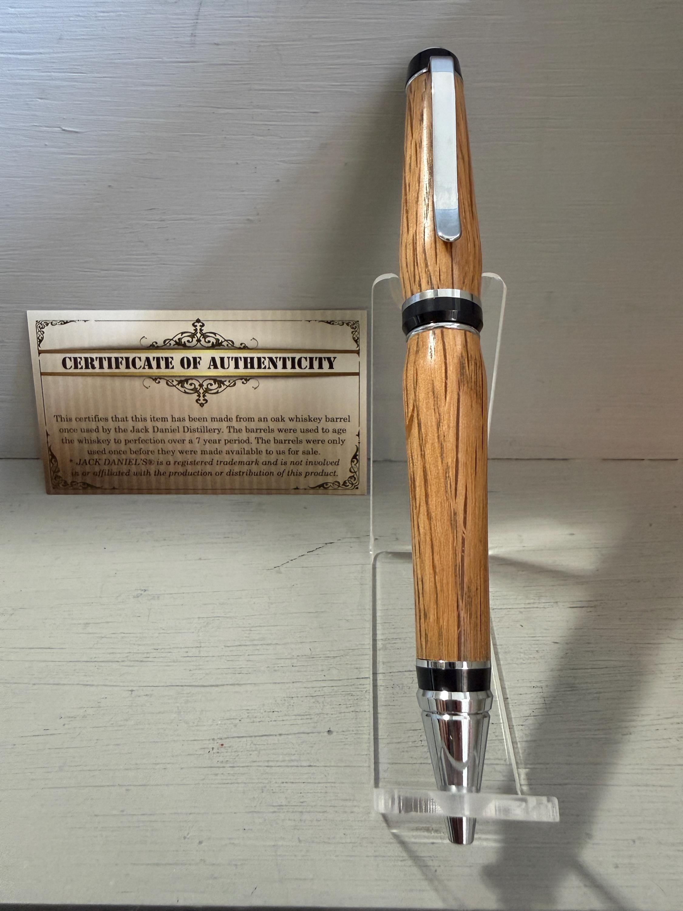 This classic Cigar Pen, made of Certified Oak Whiskey Barrel wood once used by the Jack Daniel Distillery, is finished with a stunning chrome trim... classic yet very unique. Just the like drink itself, the barrel wood used to distill this awesome whiskey is beautiful! When turned into the perfect shape, like this pen, not only does it look good but it also feels good in your hand. This pen will be the envy of many, especially those who know what a fine writing instrument truly is. Made with quality craftsmanship, this pen is "a unique piece of art"!